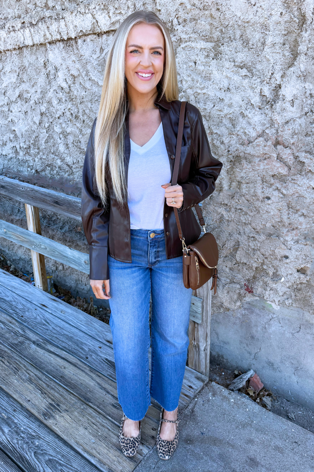 Faux Leather Lapel Collar V-Neck Button Down Shirt