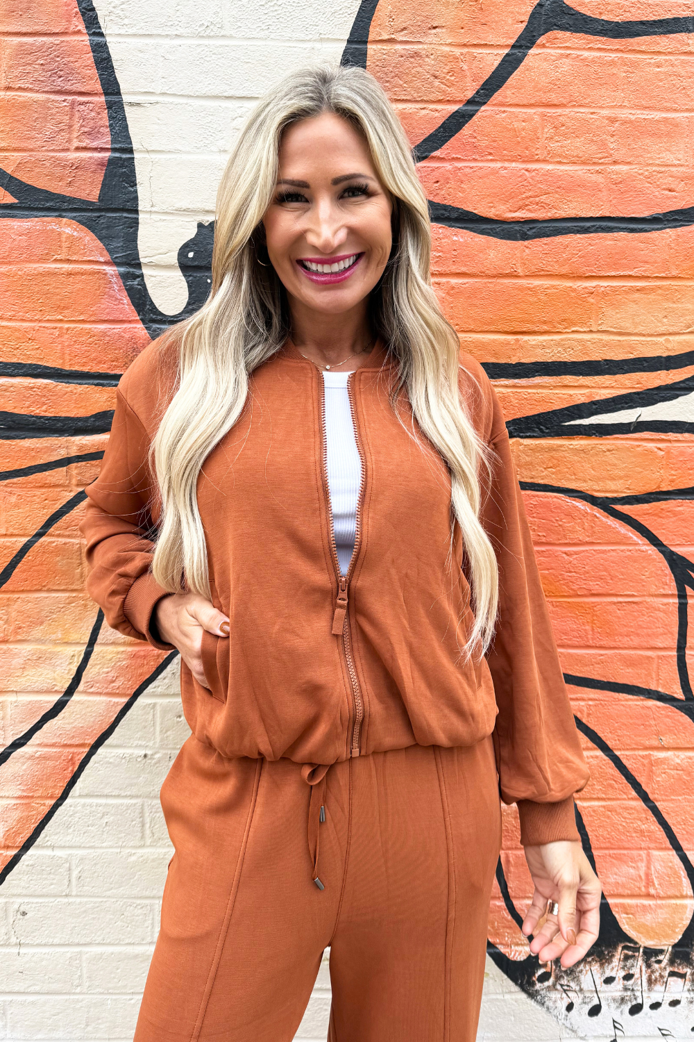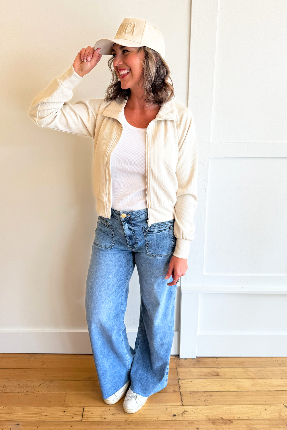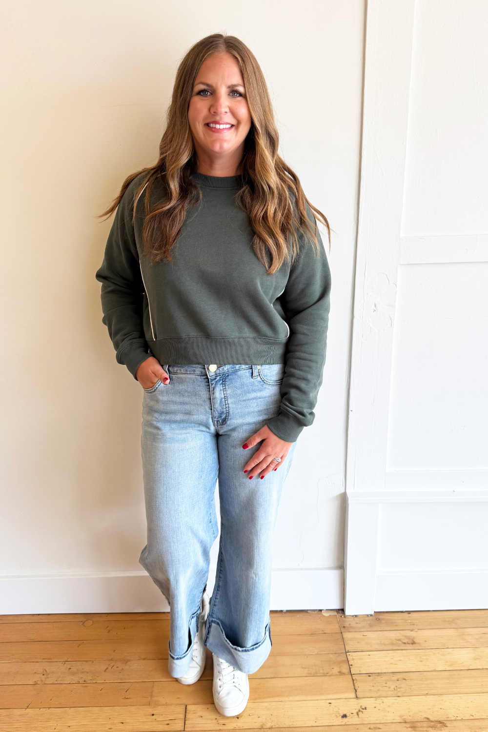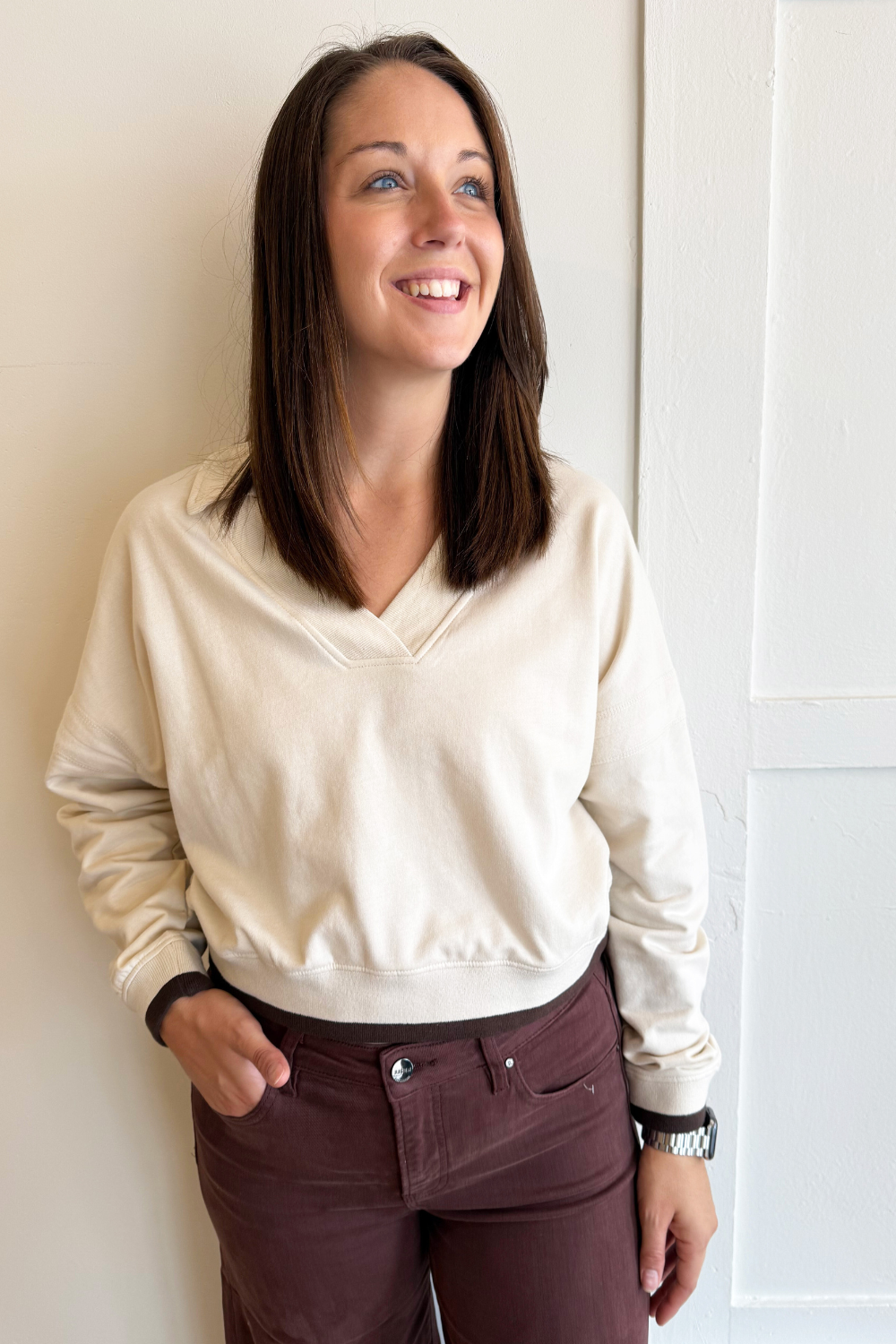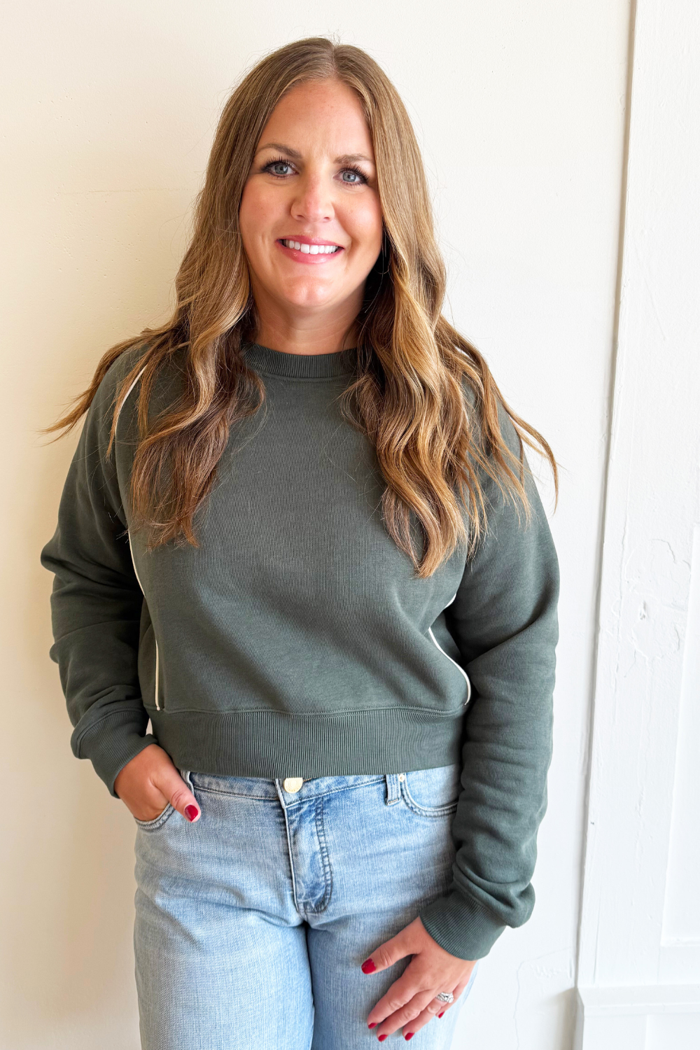 Piped Fleece Cotton Blend Crew Neck Sweater