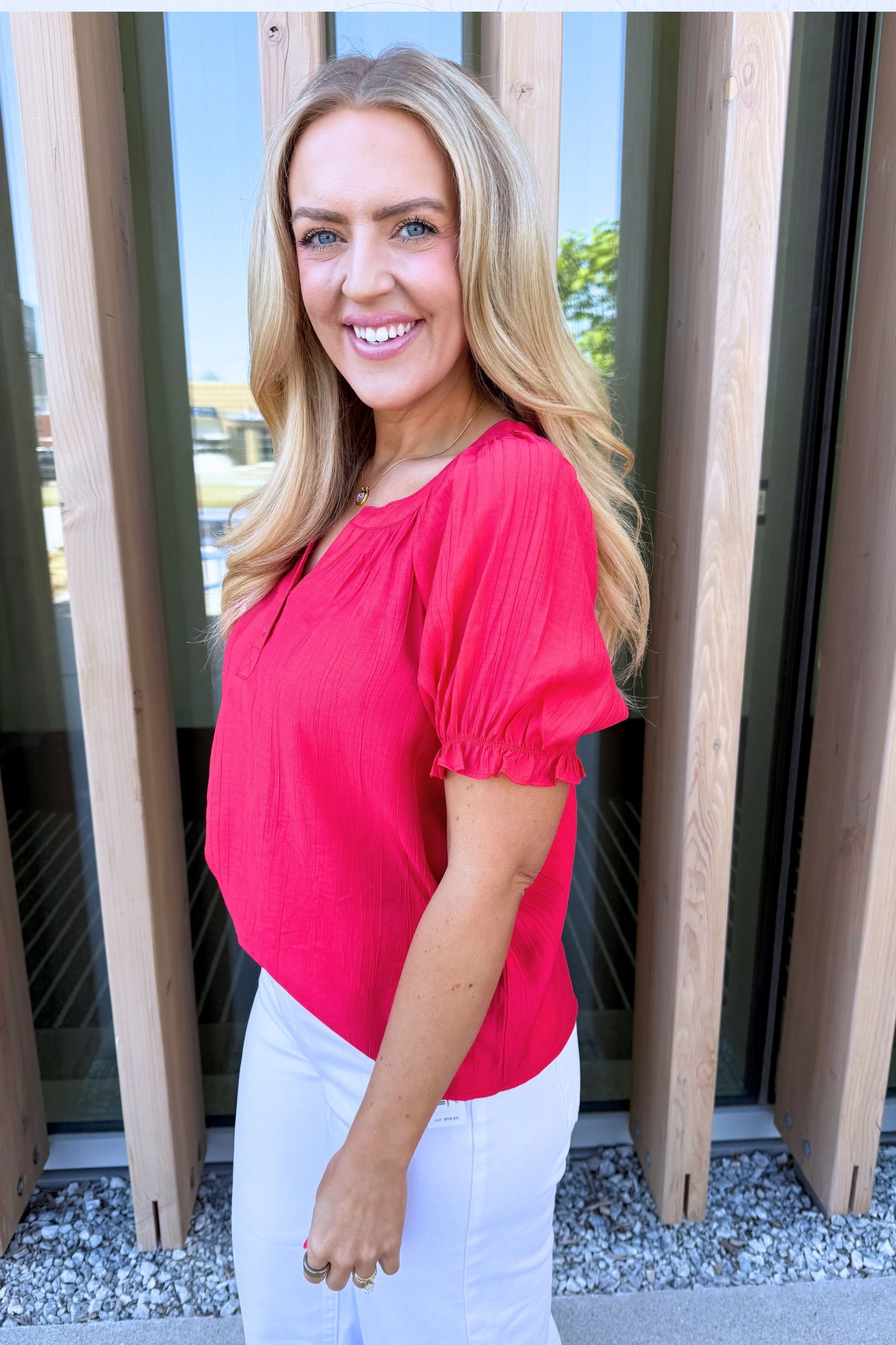 Short Ruffle Sleeve Draped Front Woven Blouse