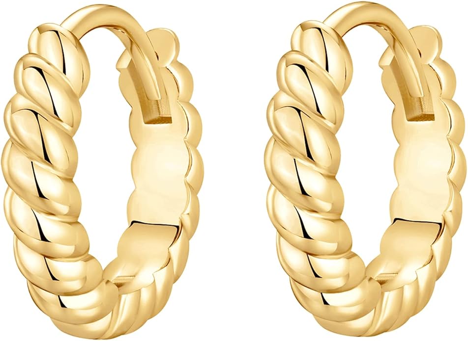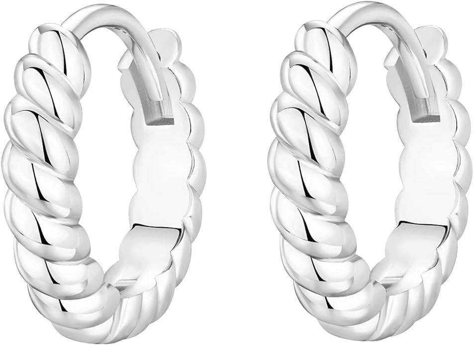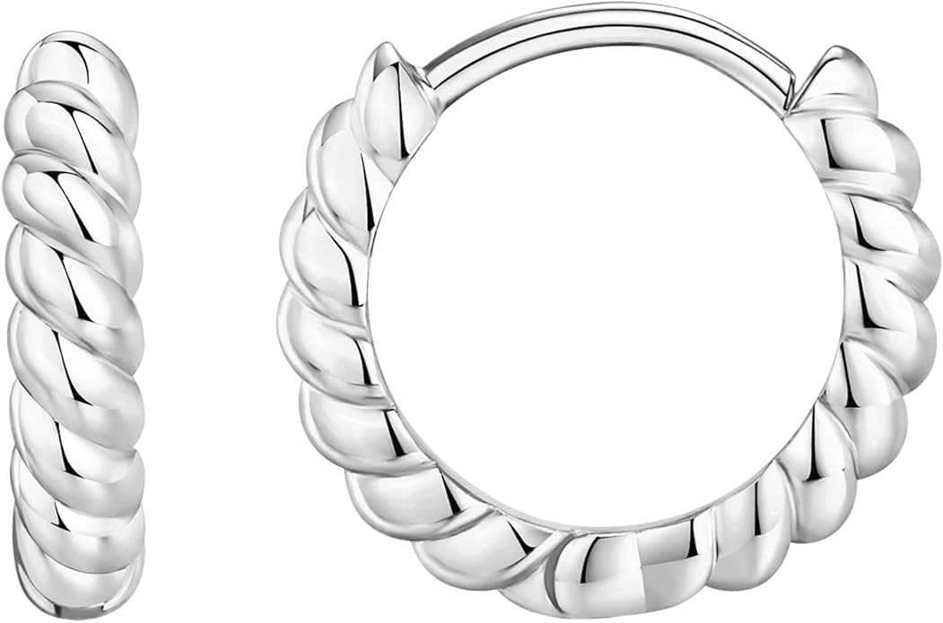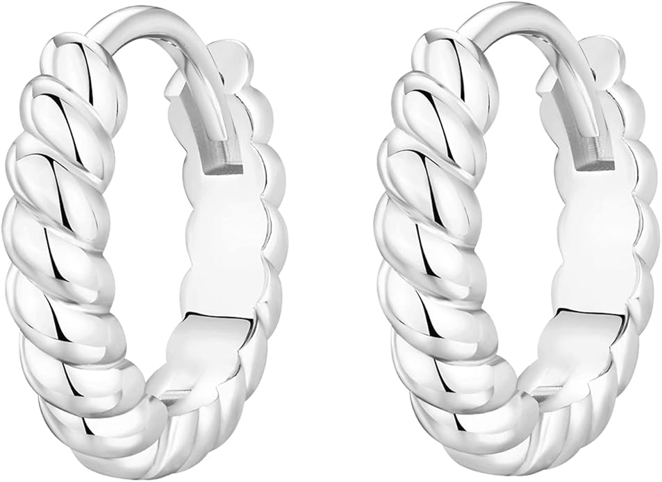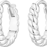 Our 14K white gold plated 13mm Twisted Earrings are the perfect "twist" on a classic. These small earrings for women are perfectly trendy, and feature a sterling silver hypoallergenic post. These mini hoop earrings measure 12.5mm in diameter, and are 2.5mm wide, making them perfect second hole earrings as well.