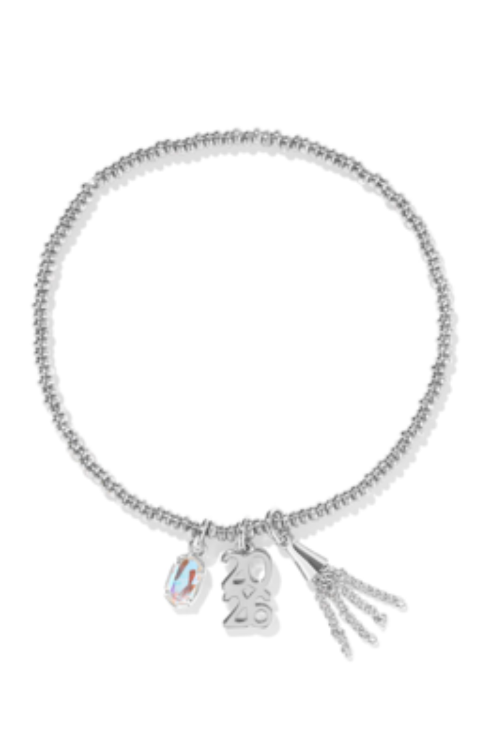 Celebrate your grad’s big achievement with the 2026 Gold Graduation Stretch Bracelet in dazzling Dichroic Glass. Three fun graduation-inspired charms and the iconic KS shape add a playful touch to this keepsake piece—perfect for showing off all that hard-earned success in style!