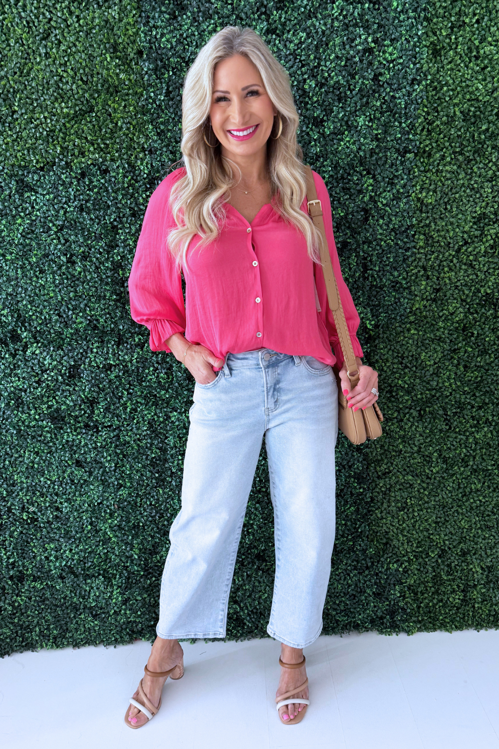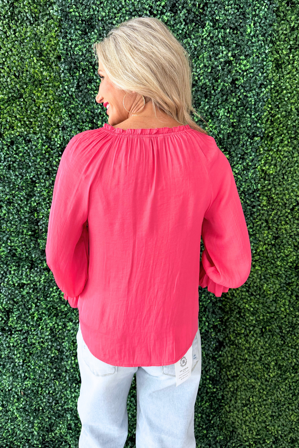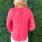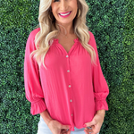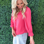 The 3/4 Sleeve Button Front Woven Top with Ruffle Details is a feminine staple in a soft pink hue that adds a fresh pop of color to your wardrobe. Designed with a lightweight woven fabric, this top features a classic button front silhouette elevated by delicate ruffle detailing for added texture and charm. The 3/4 length sleeves make it perfect for transitional styling, whether paired with denim for a casual look or dressed up with tailored trousers. The flattering shape and romantic details make it an easy piece to wear from work to weekend.