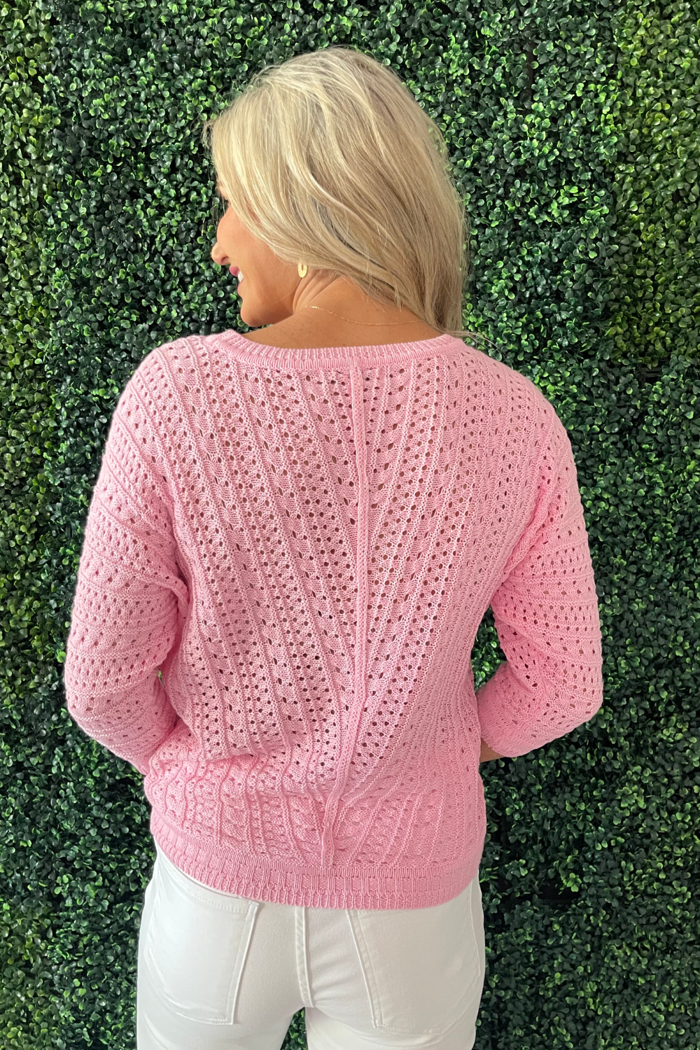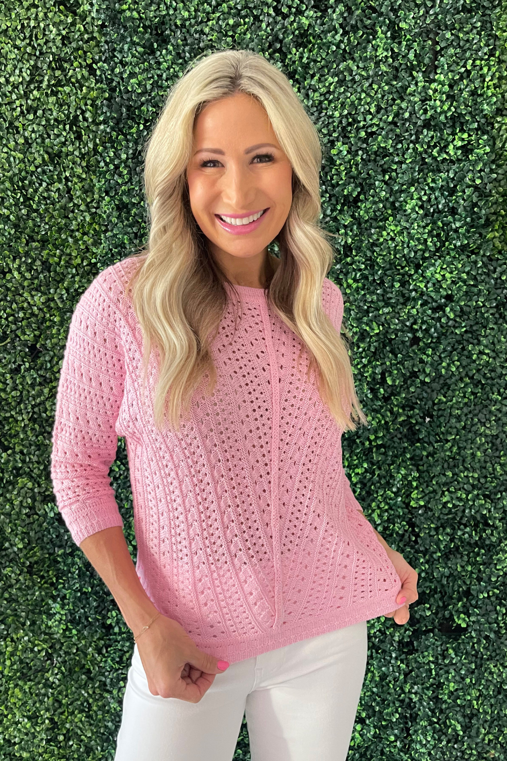 Light and relaxed, this 3/4 Sleeve Crochet Pullover Sweater is a pink dream! Whether you're pairing with denim for brunch or throwing it over a dress on a cool spring evening, this sweater brings just the right amount of cozy without the bulk.