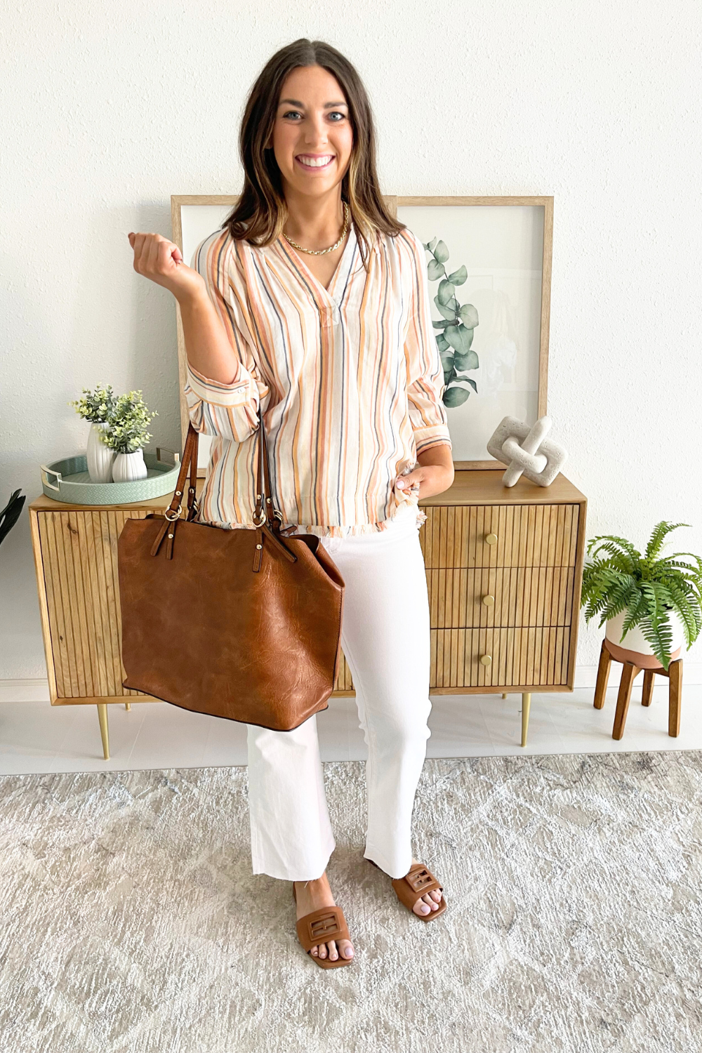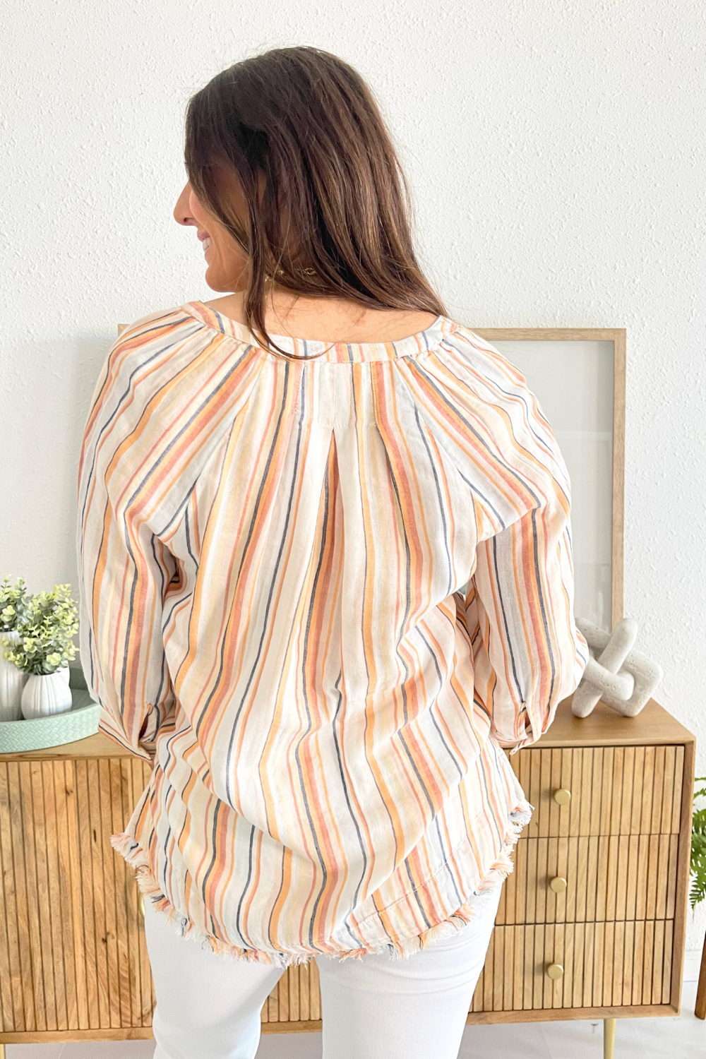 3/4 Sleeve Pleated Raglan Woven Top w/ Fray Hem