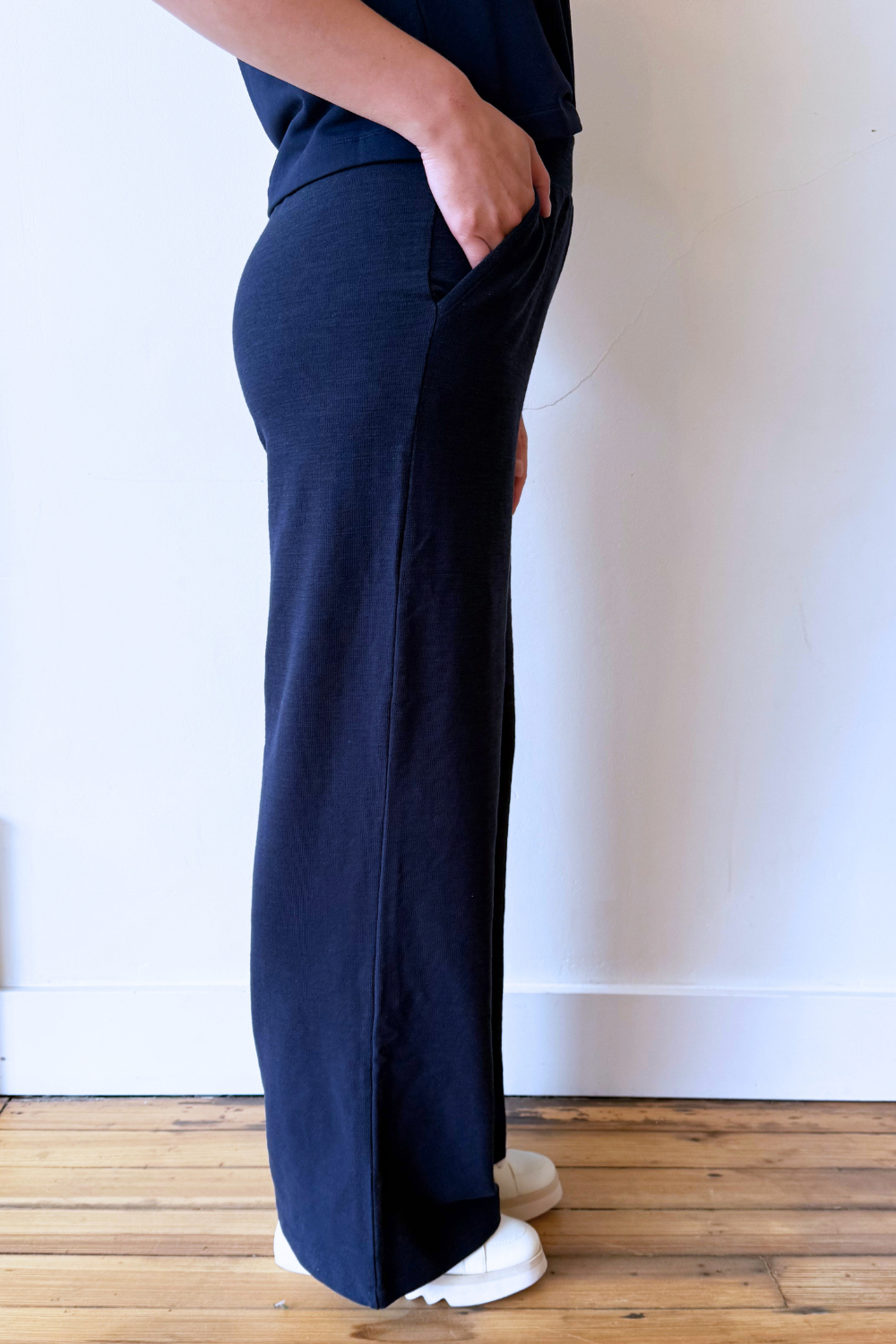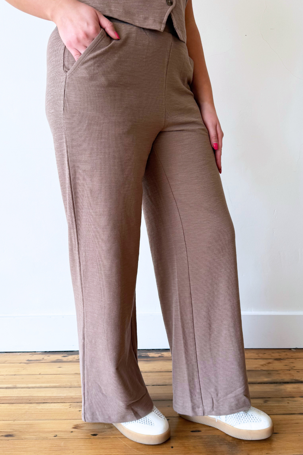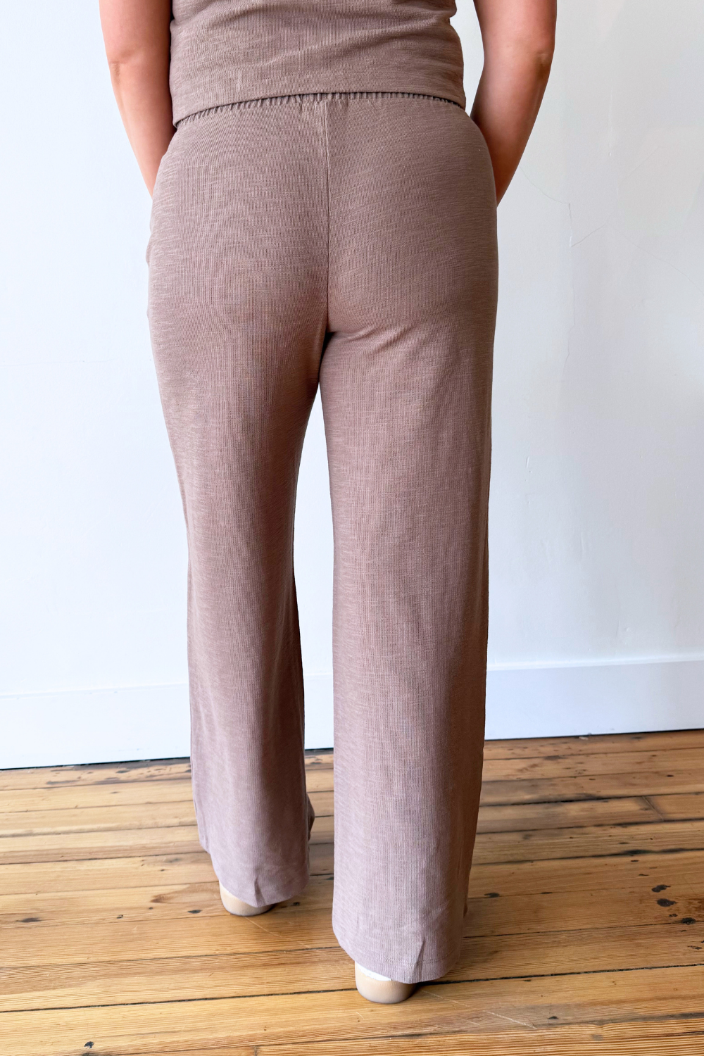 Comfort is key with this wide leg pant featuring a soft textured knit. Featuring an elastic waistband, high rise fit, and side pockets, this lightweight Andre Pant moves gracefully with you. Complete the look with the Noelle Textured Tank Top.