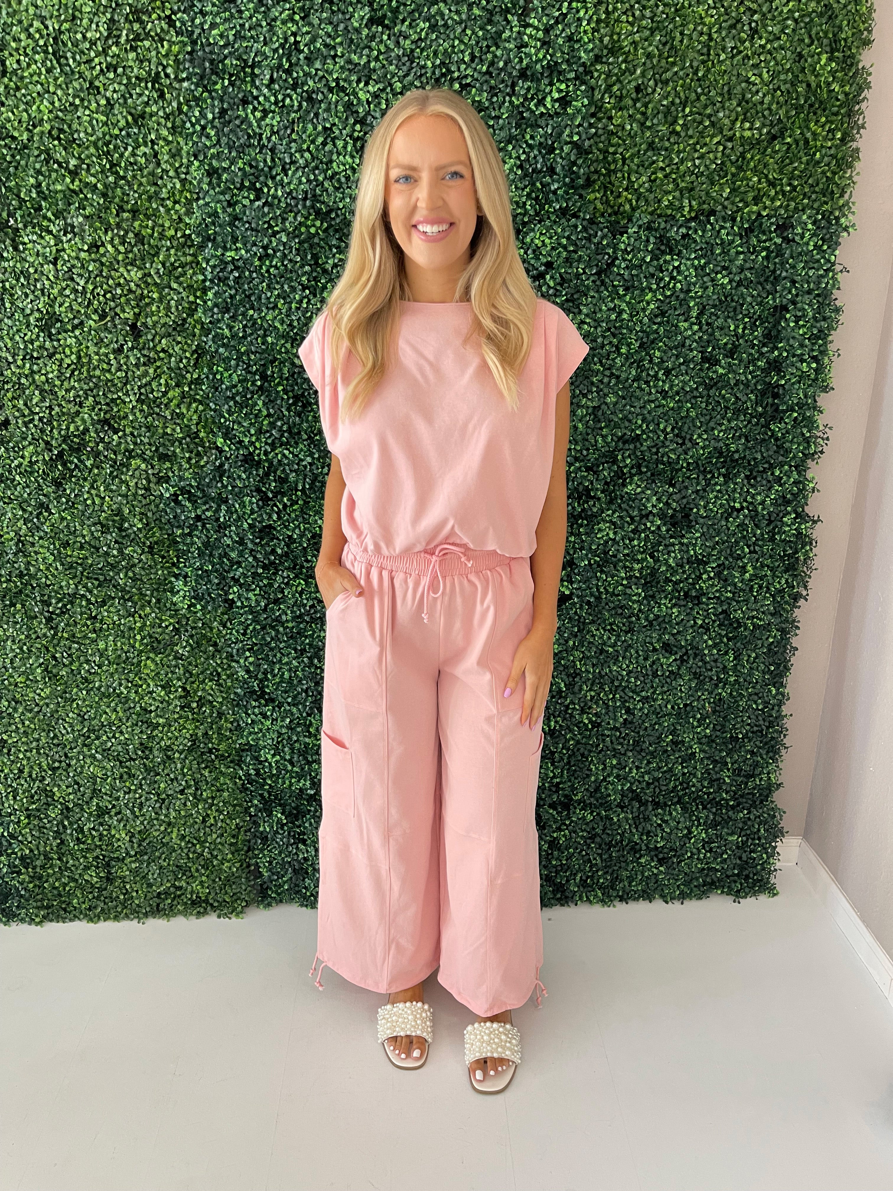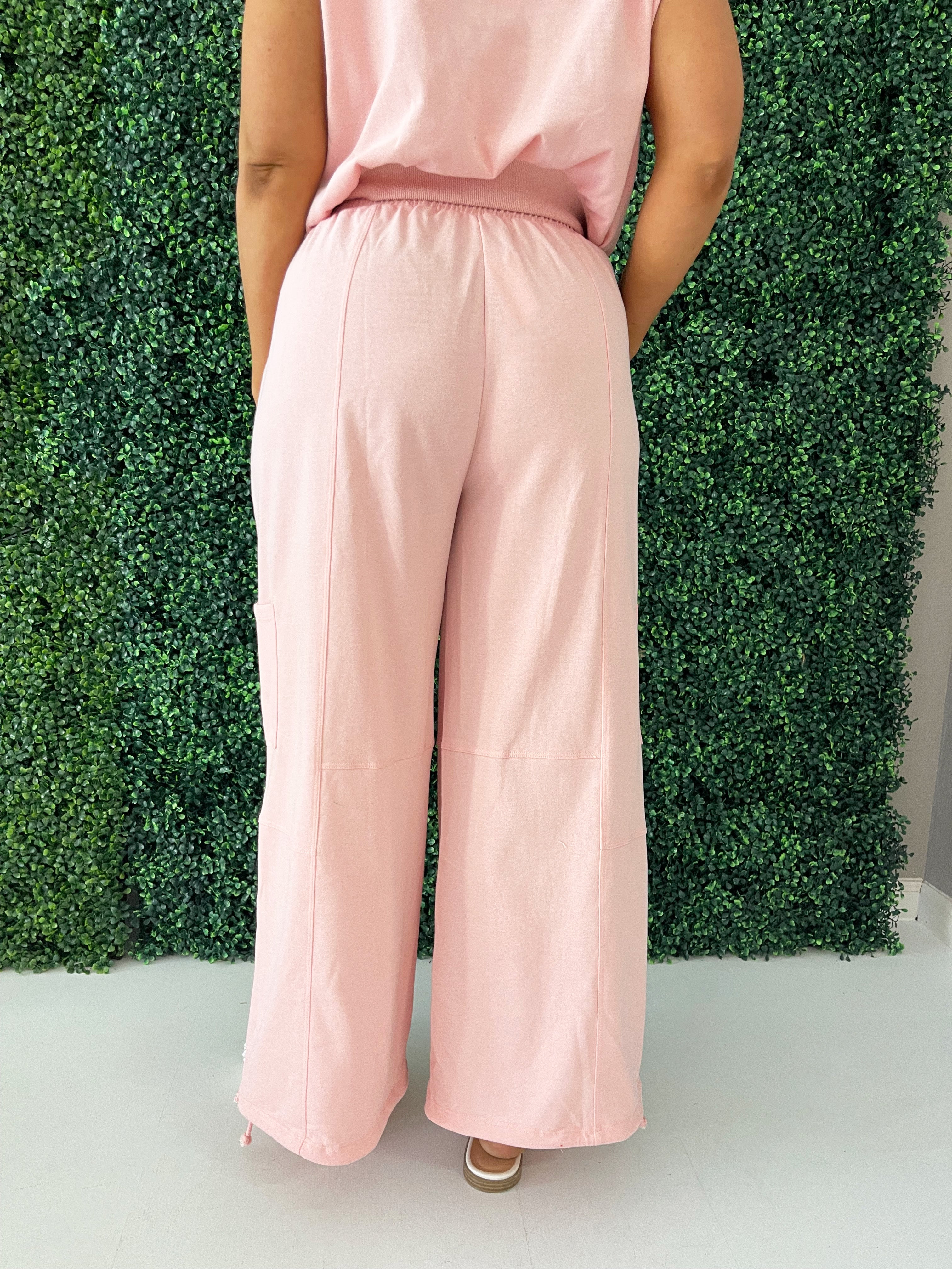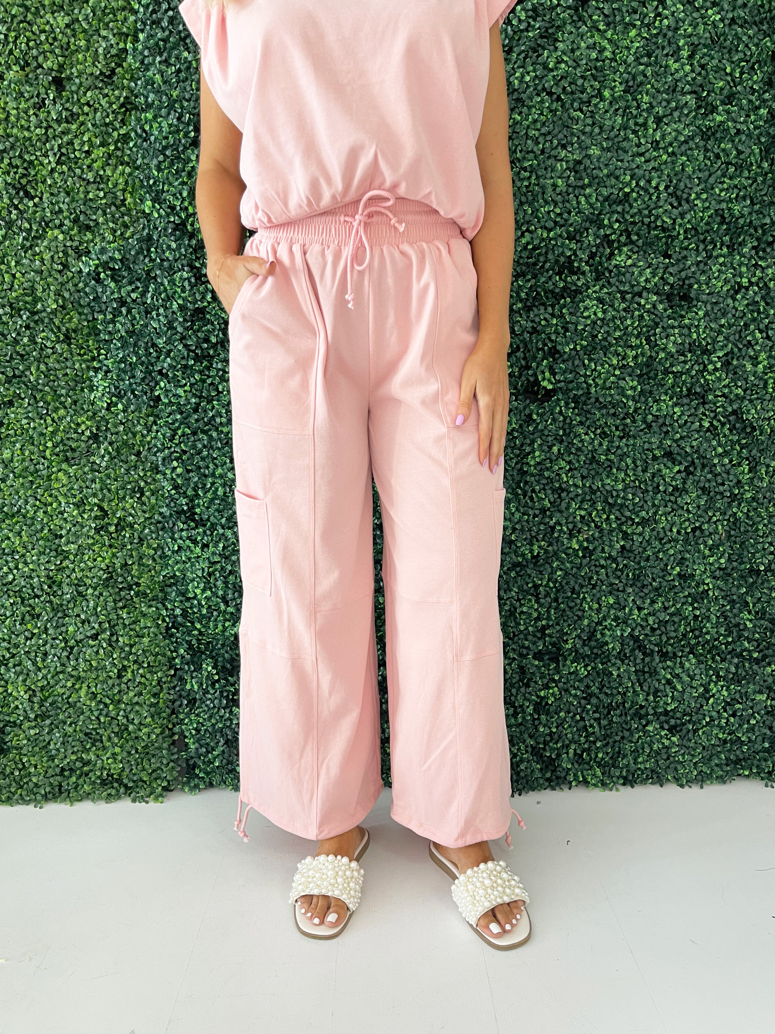Crafted for comfort and style, these pants feature a relaxed, baggy fit that effortlessly exudes laid-back vibes. The drawstring on the leg opening adds a touch of versatility, allowing you to adjust the fit to your preference. Go in the soft and sweet hue of baby pink this summer! Wear these pants with the Lightweight Knit Top for a matching set.
