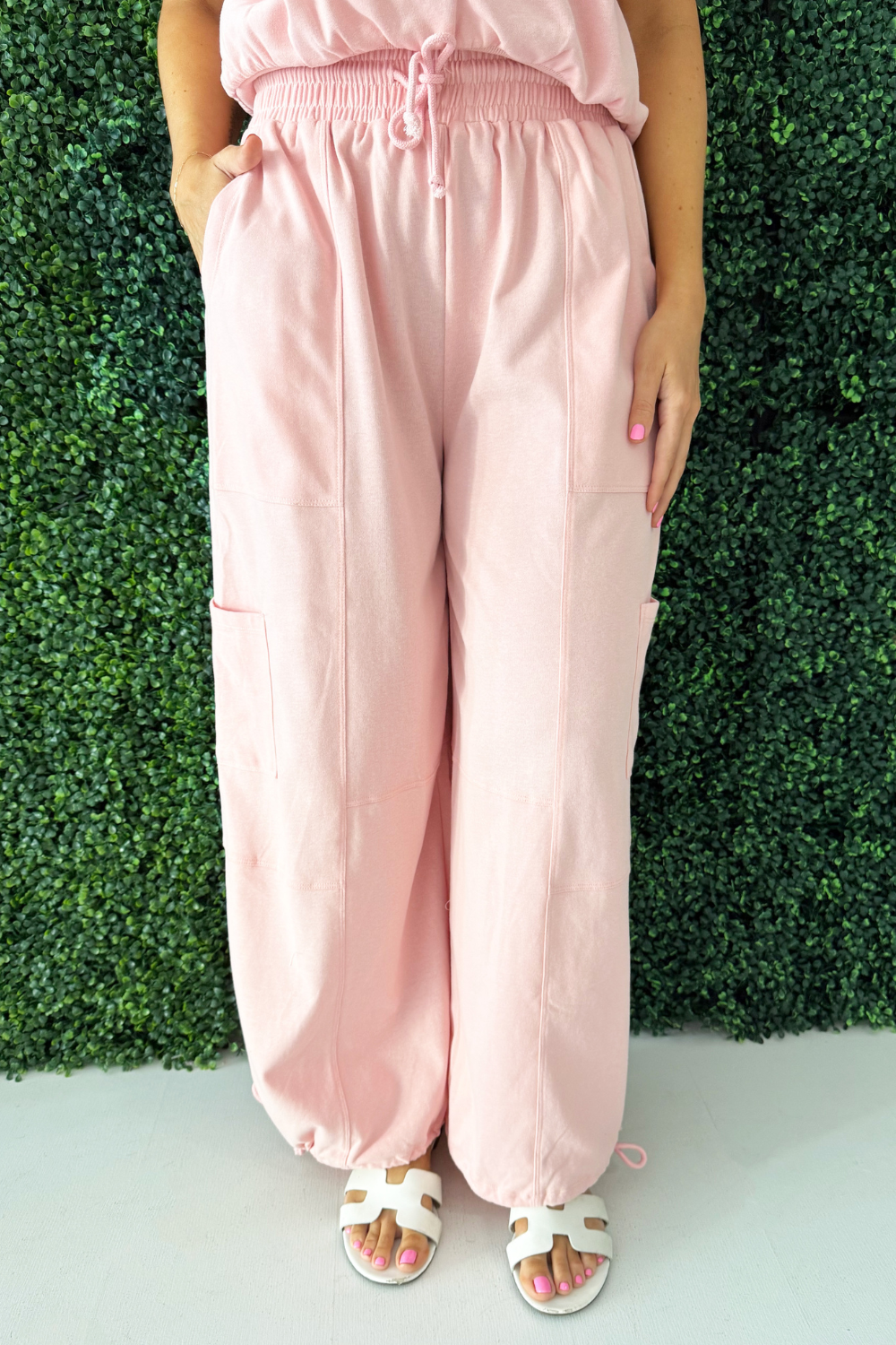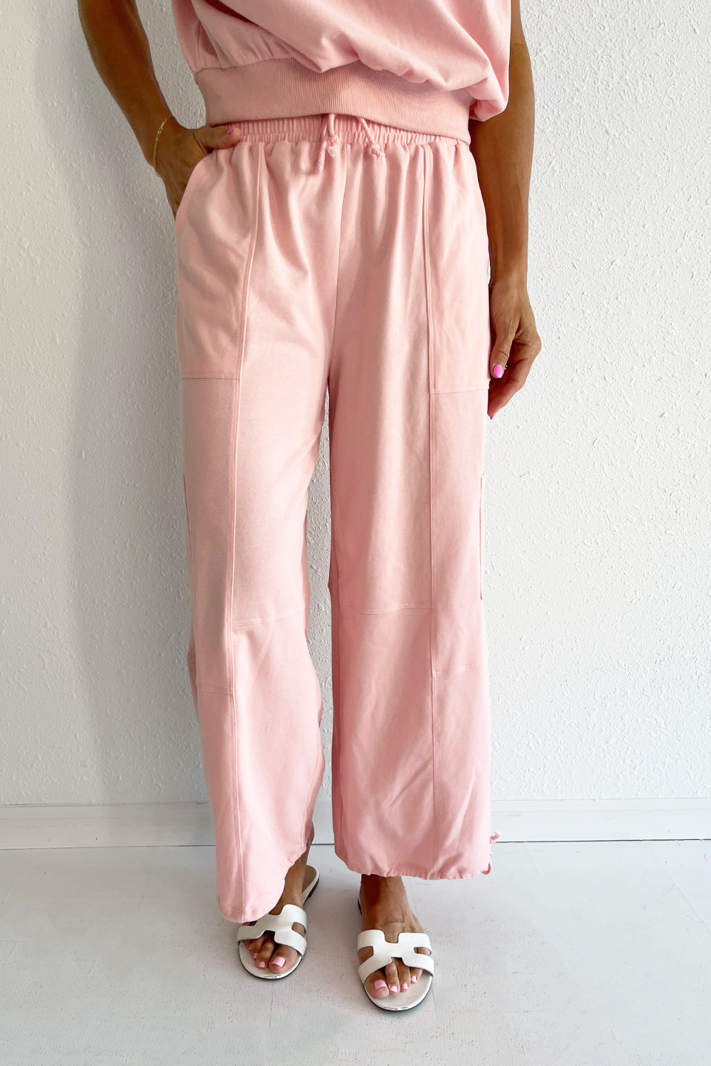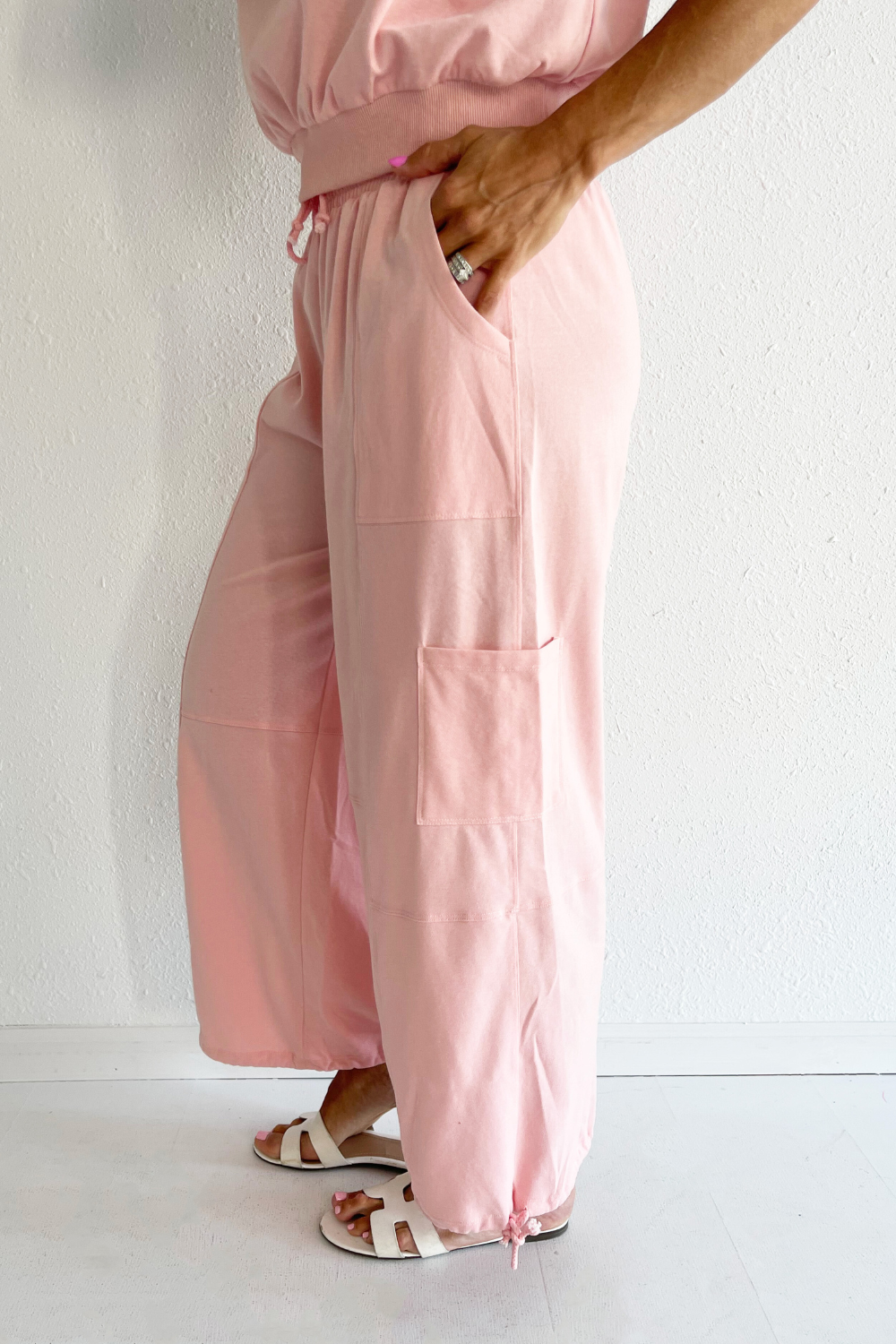 Crafted for comfort and style, these pants feature a relaxed, baggy fit that effortlessly exudes laid-back vibes. The drawstring on the leg opening adds a touch of versatility, allowing you to adjust the fit to your preference. Go in the soft and sweet hue of baby pink this summer! Wear these pants with the Lightweight Knit Top for a matching set.