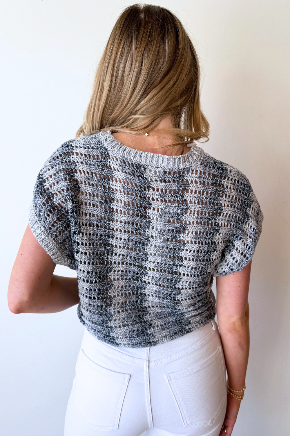 - Crochet-style knit fabric