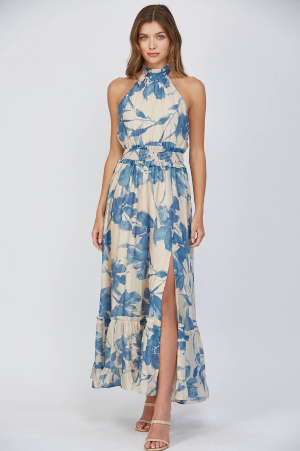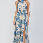 Bold Floral Print Tie Black Halter Neckline Maxi Dress