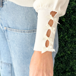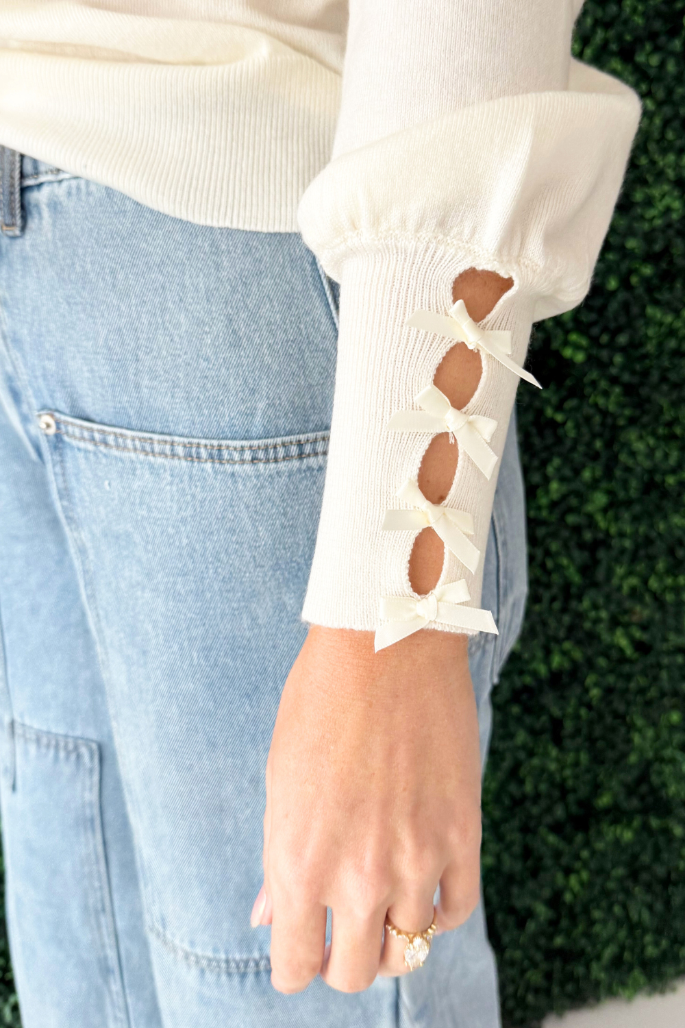 Add a charming touch to your wardrobe with this long sleeve top featuring delicate bow details on the sleeves. The subtle bows bring a playful, feminine flair to a classic silhouette, making it perfect for both casual and dressier occasions. Pair it with jeans or skirts for a polished, stylish look!
