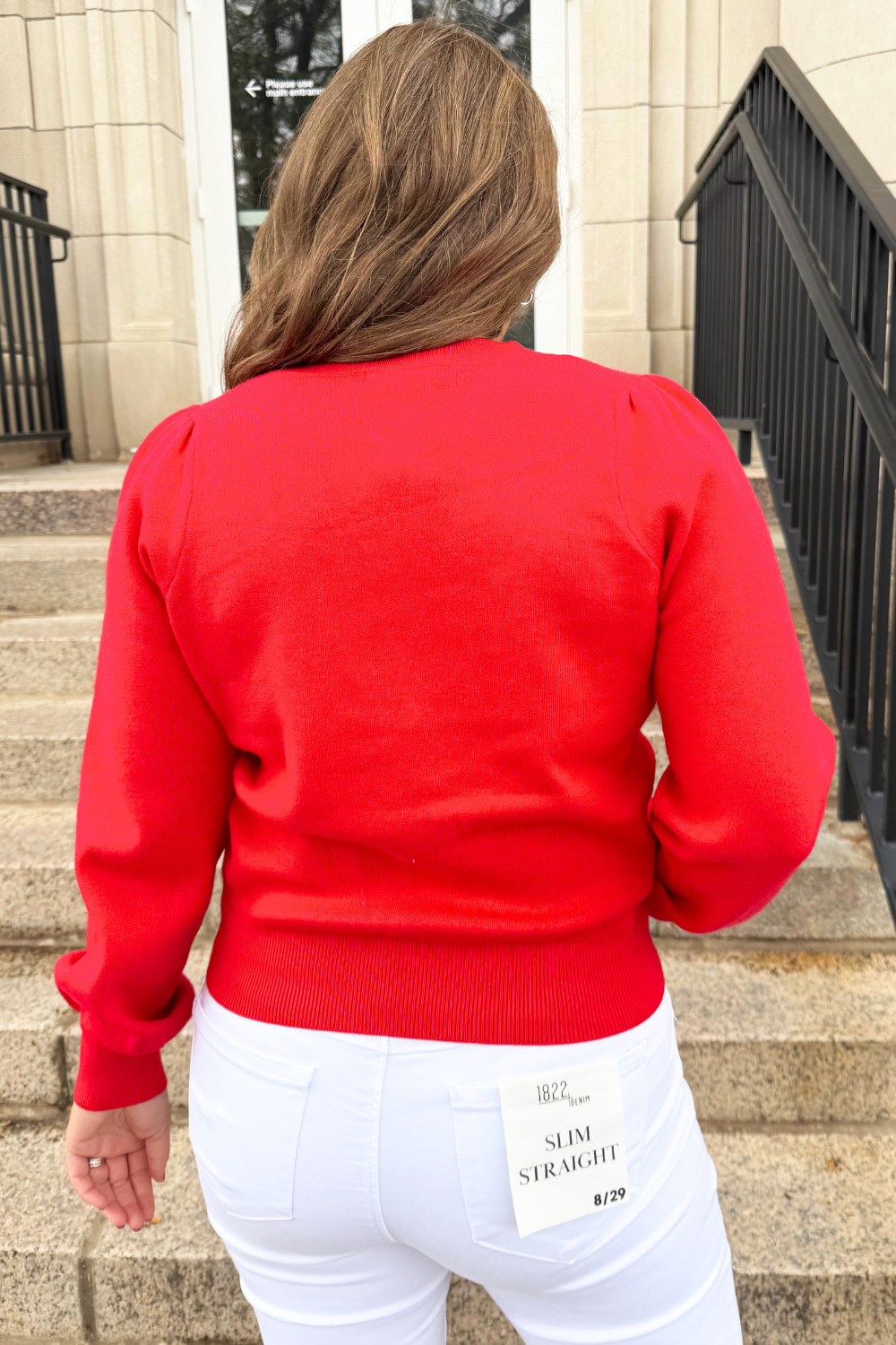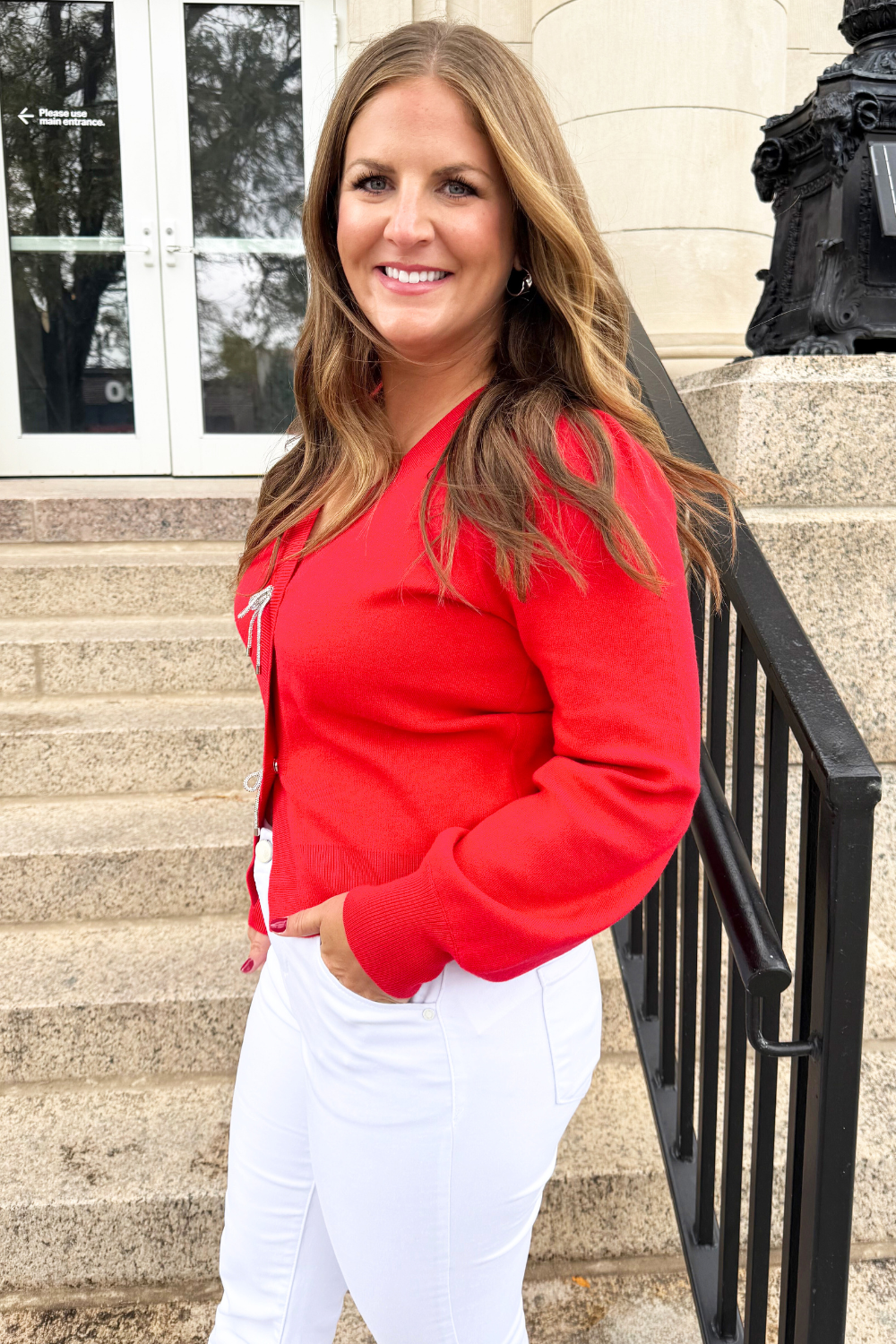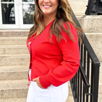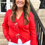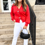 Perfect for the holidays, this Snap Front Bow Cardigan features blingy bows over snap closures! The stunning V neckline and slight balloon sleeve give this cardigan added elegance! Pair back to white denim and a nude heel for a fun holiday outfit!