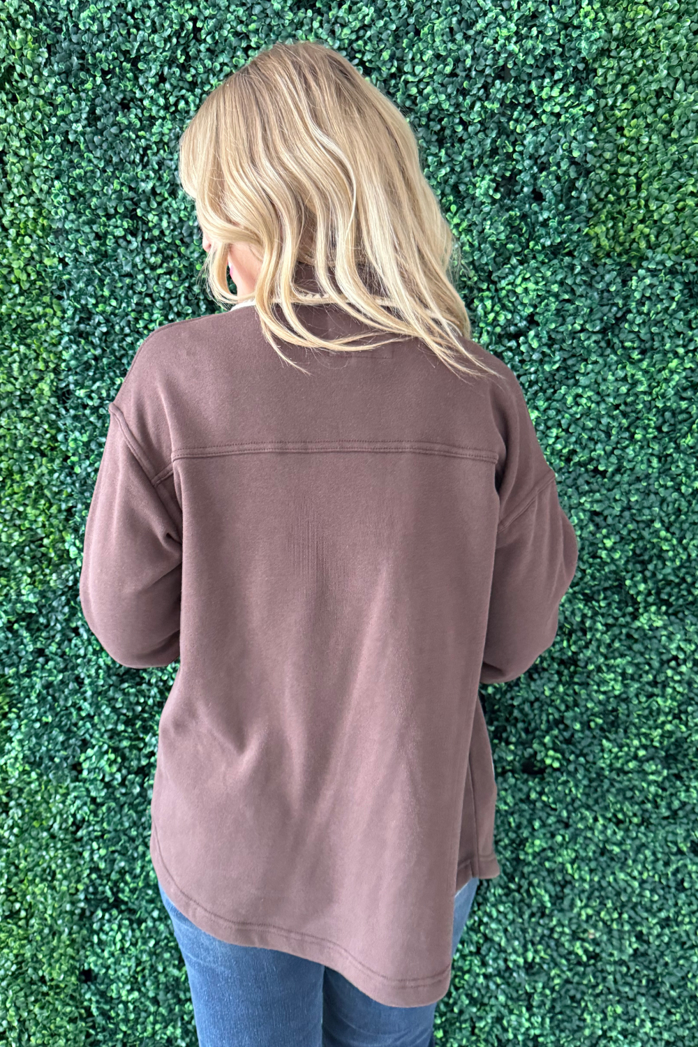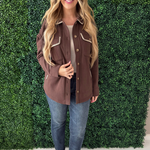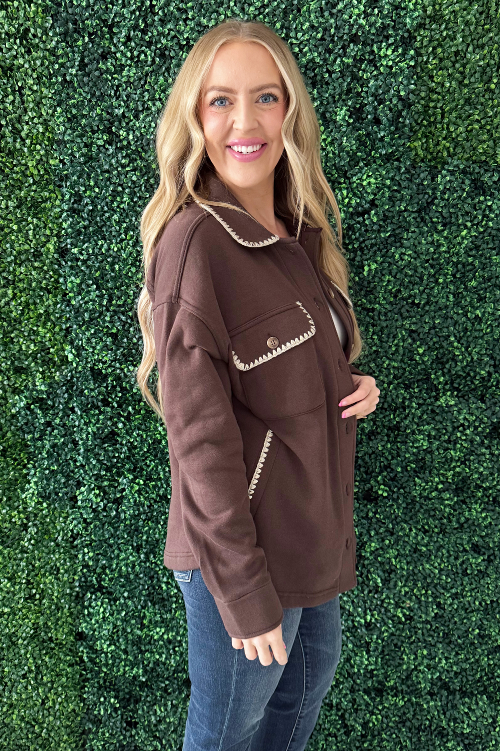 Effortlessly cool in an oversized silhouette, this laidback jacket is featured in a button-down style with a contrast stitch collared neckline and pocket detail at the chest and sides! This jacket will have you reaching for it again and again!