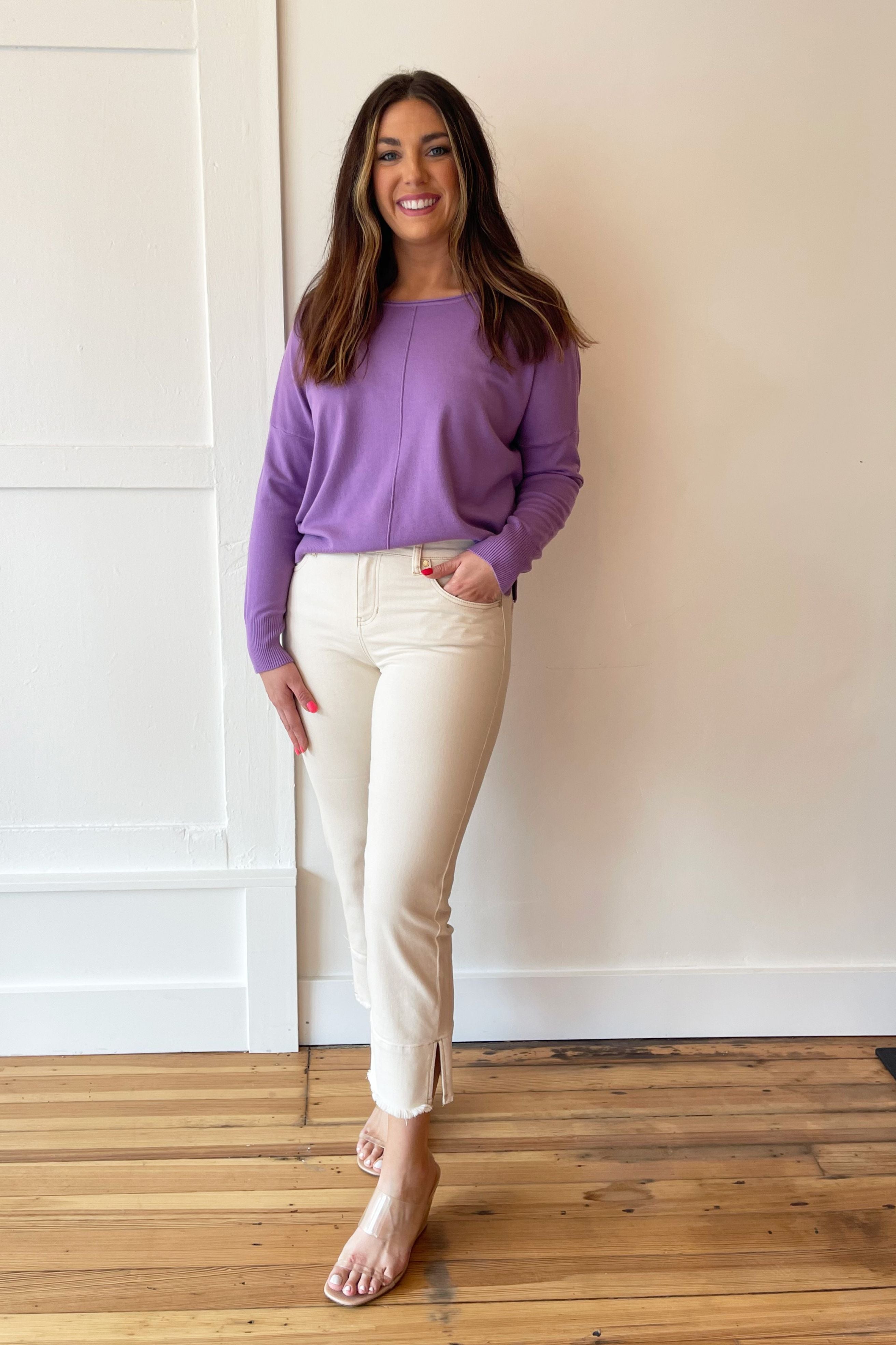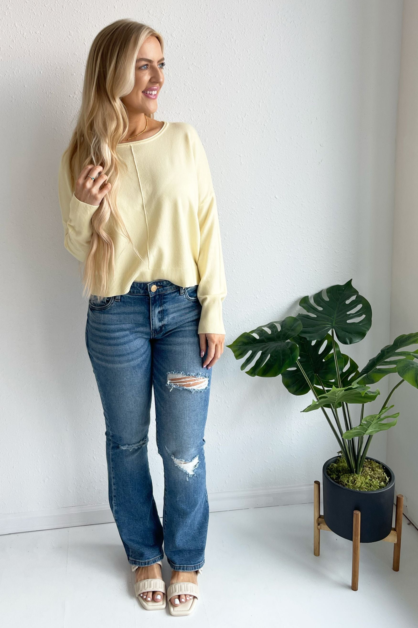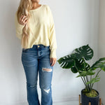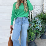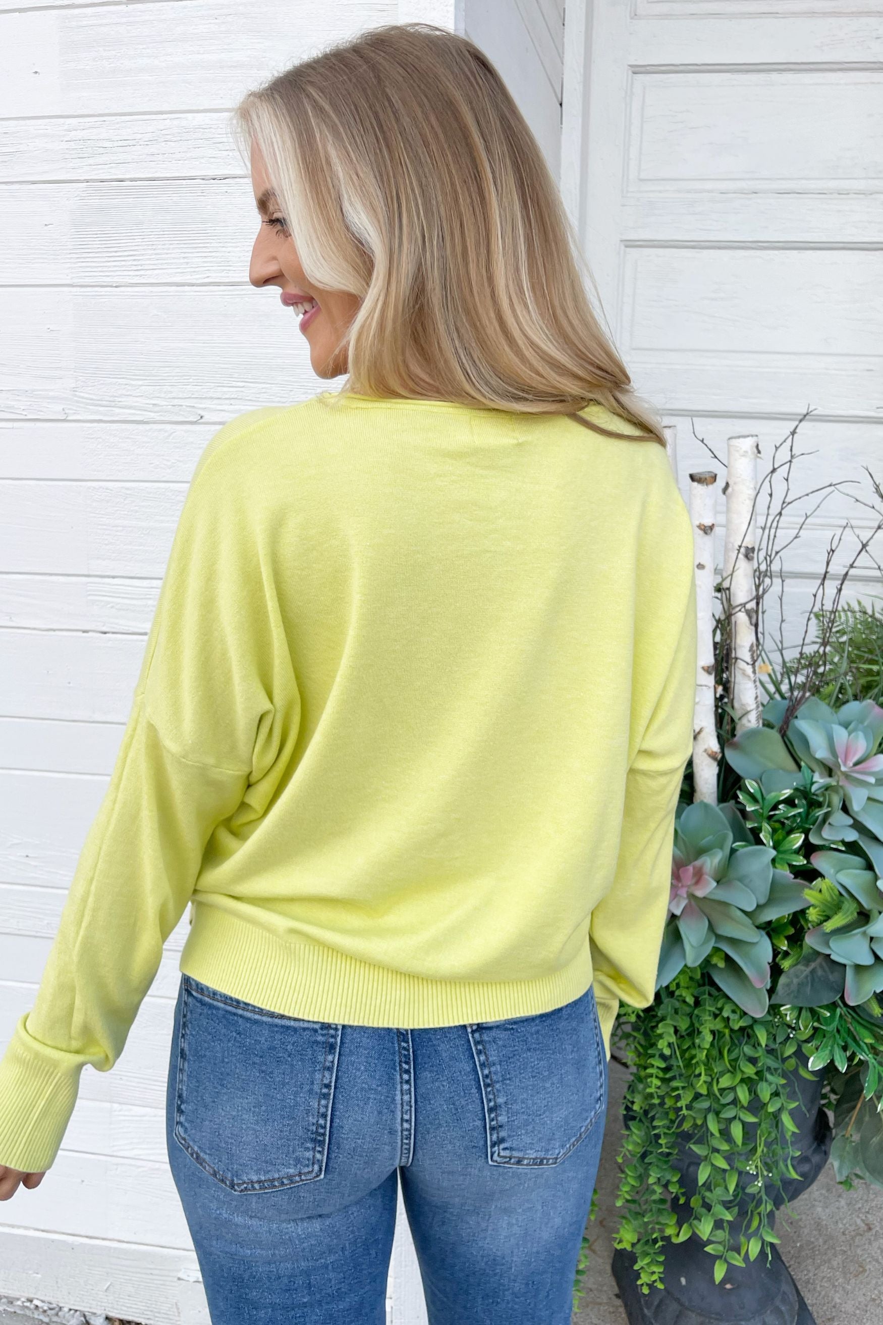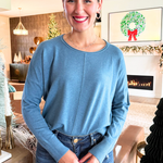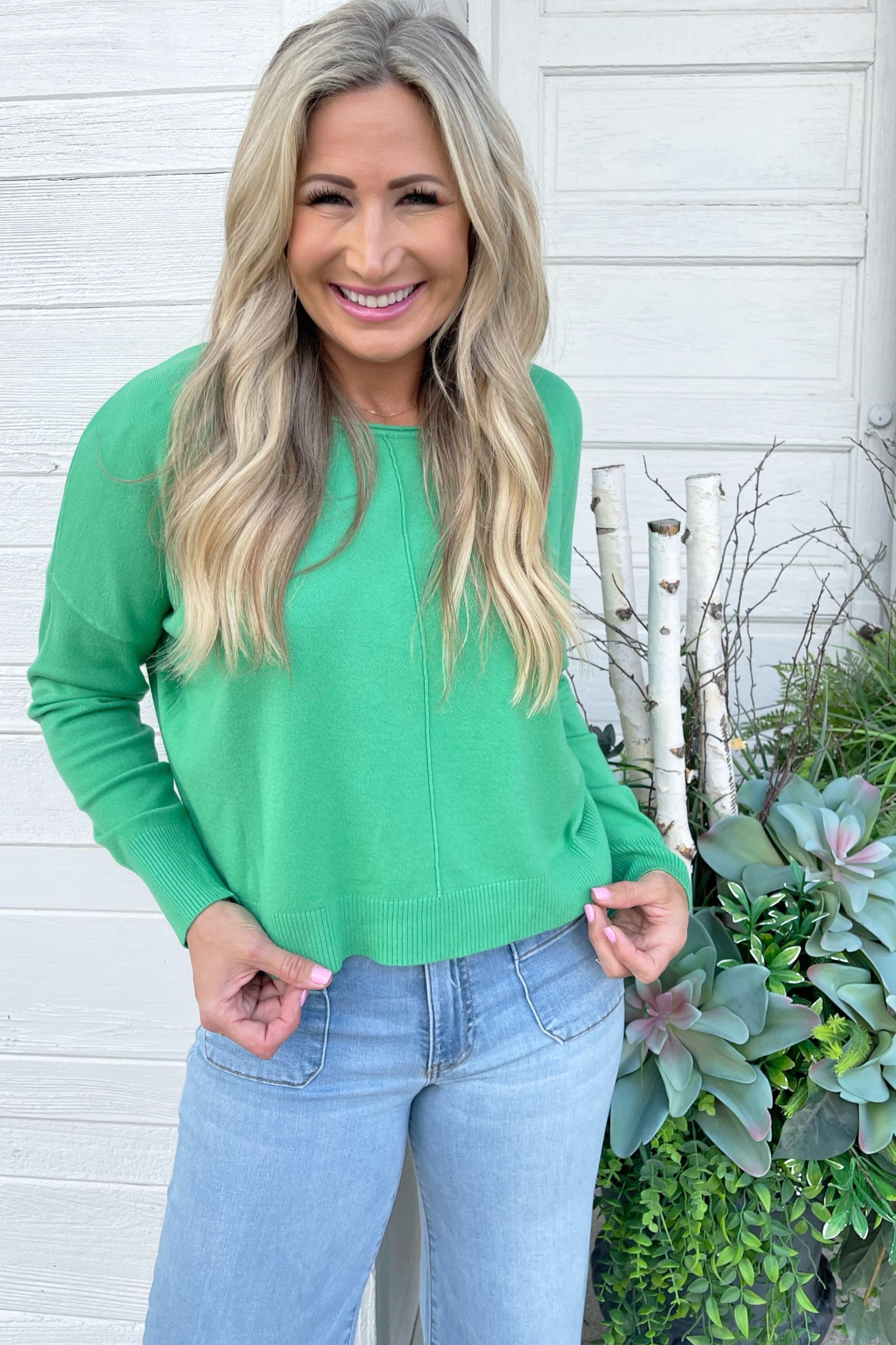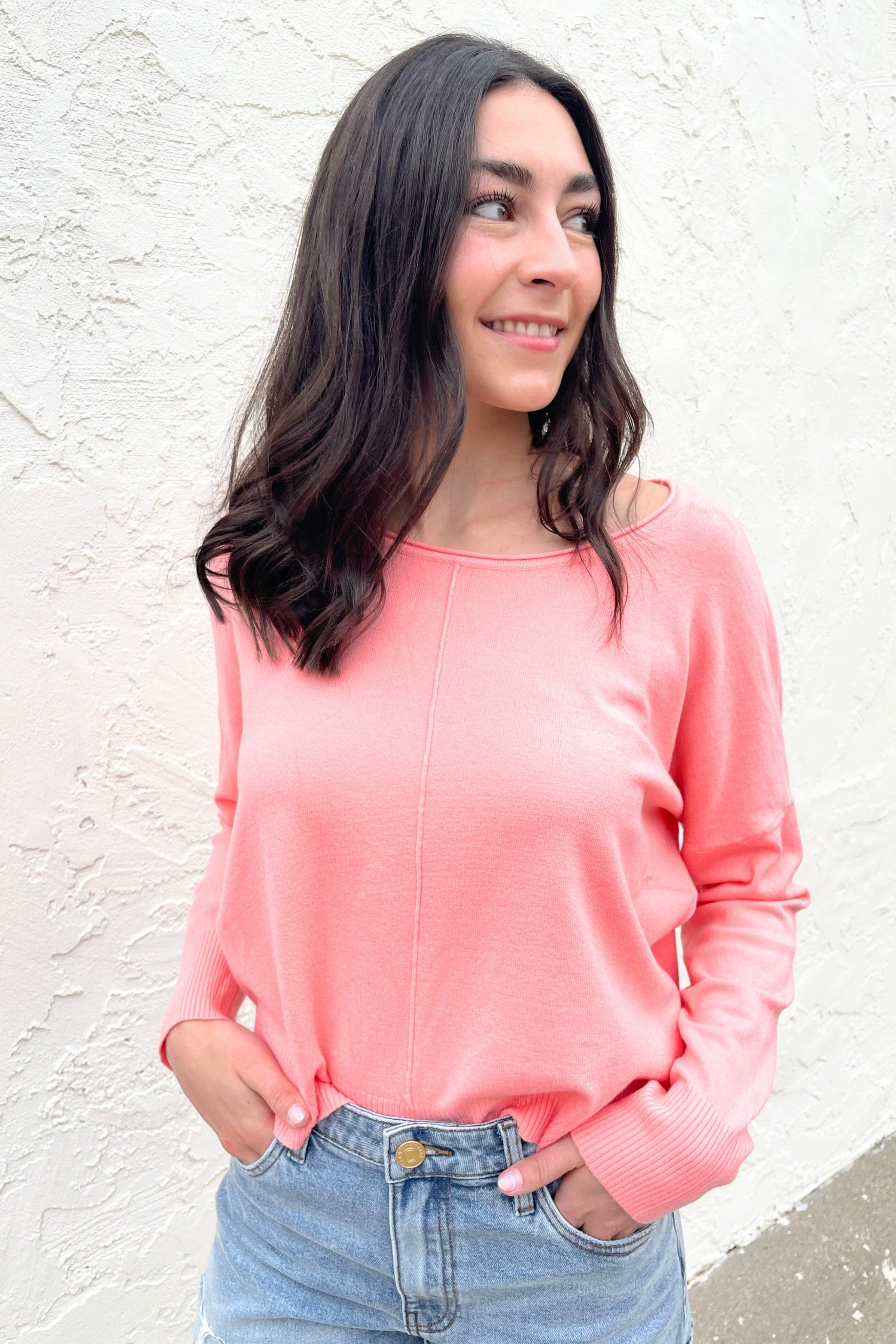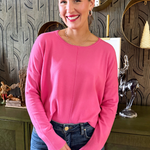 A pop of color is all you need to transition to Spring and Summer and this Center Seam Boat Neck Sweater is the perfect place to start! The wider neckline is a little flirty and a fun change from our big sweaters. This sweater has dolman sleeves and a cute center seam detail. Style with high waisted denim of any kind!