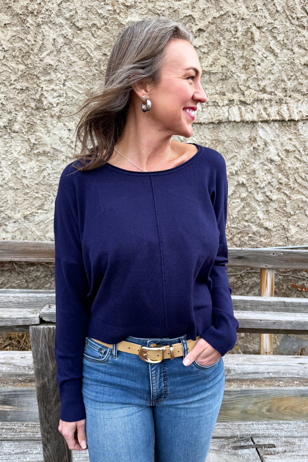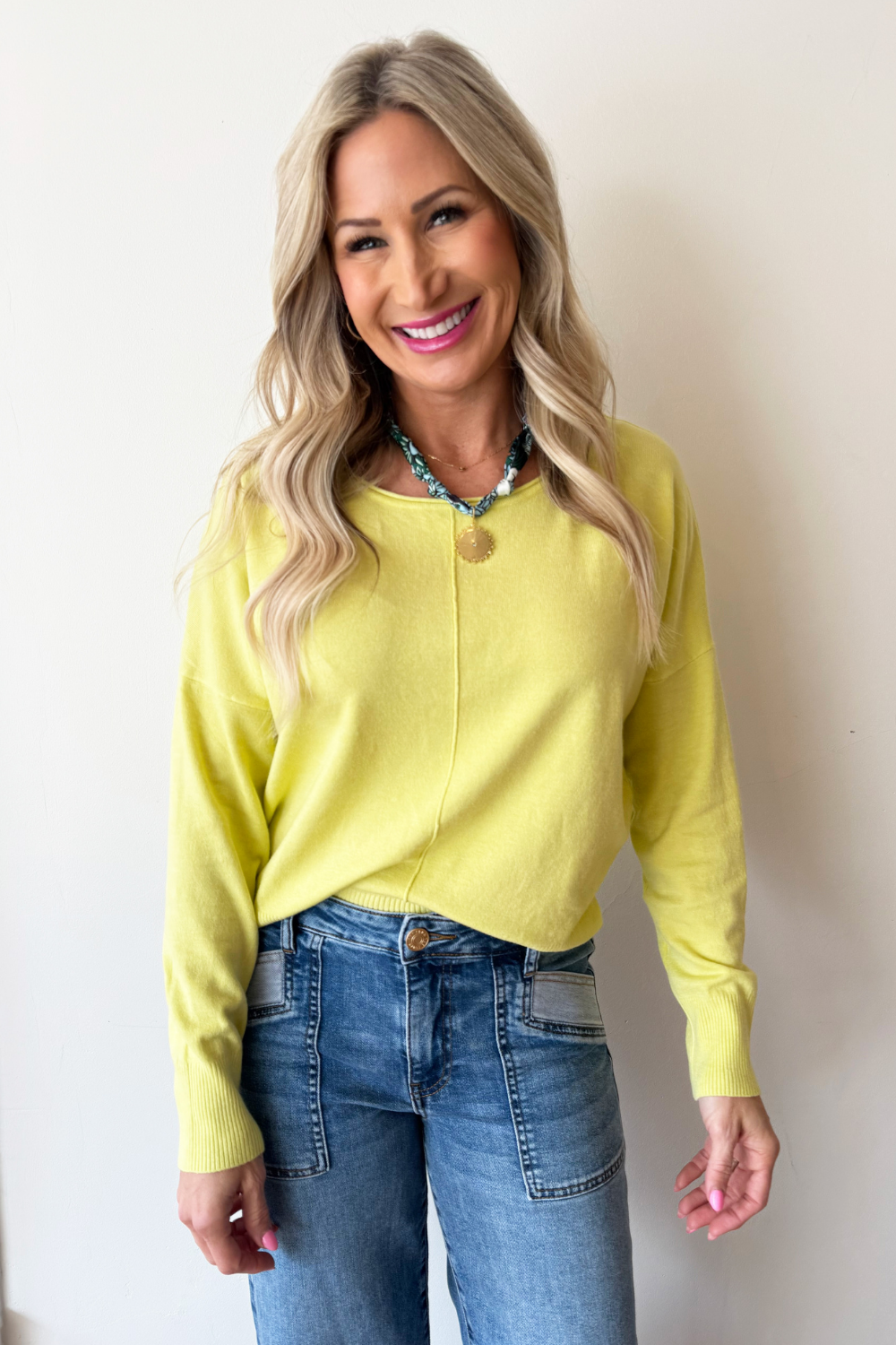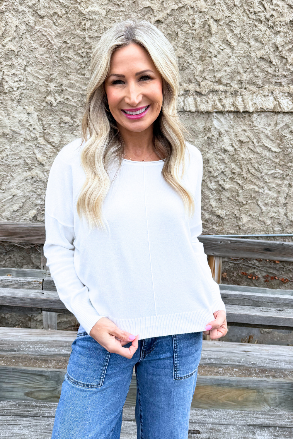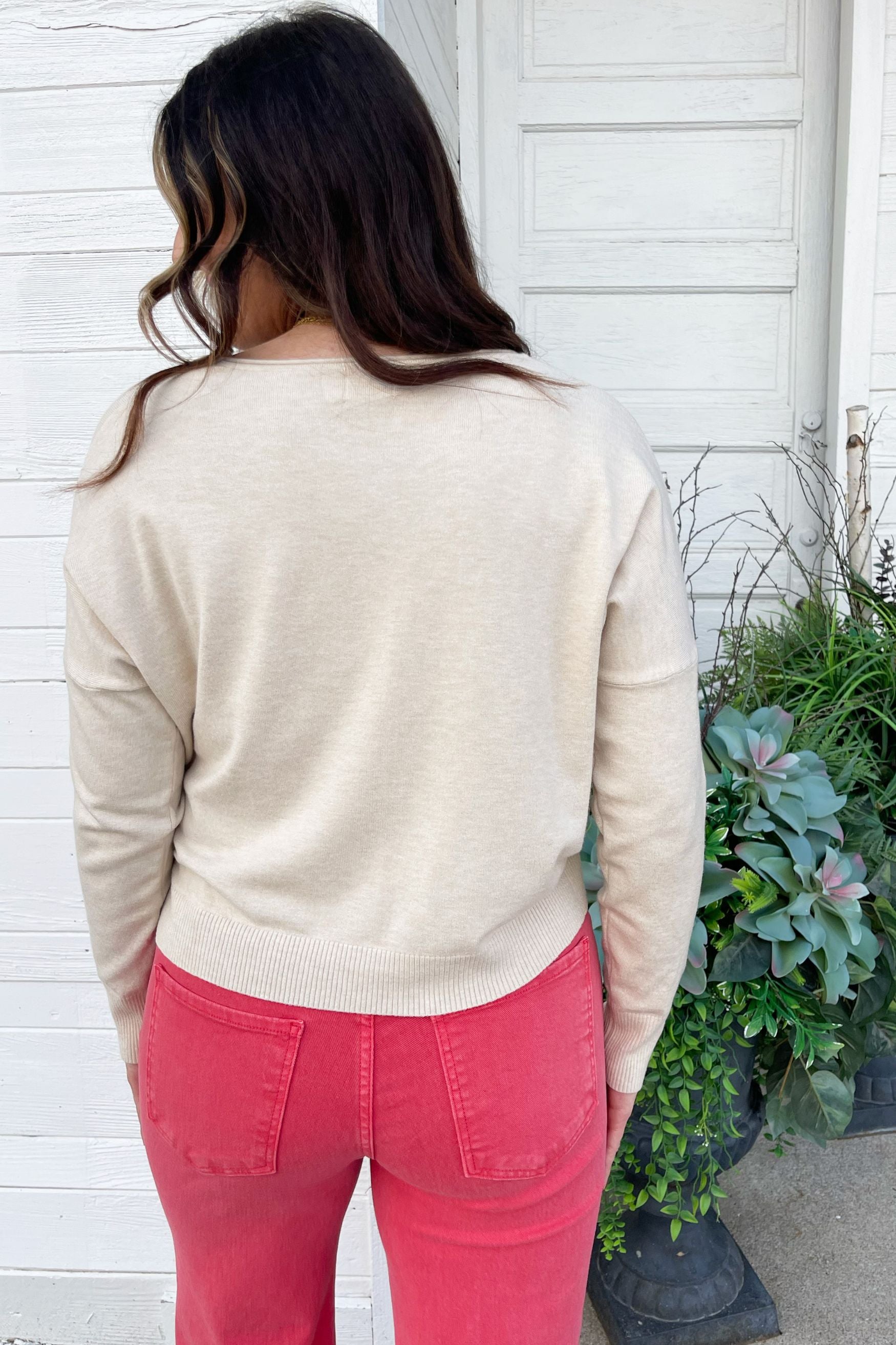 A pop of color is all you need to transition to Spring and Summer and this Center Seam Boat Neck Sweater is the perfect place to start! The wider neckline is a little flirty and a fun change from our big sweaters. This sweater has dolman sleeves and a cute center seam detail. Style with high waisted denim of any kind!