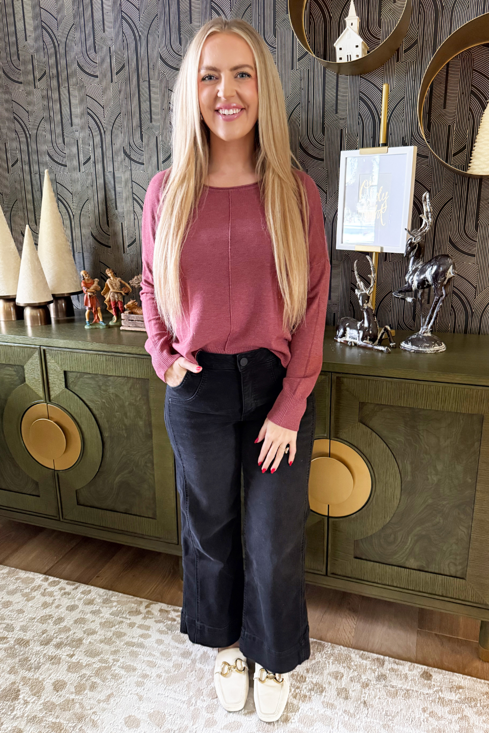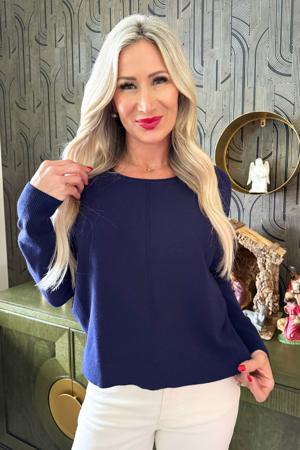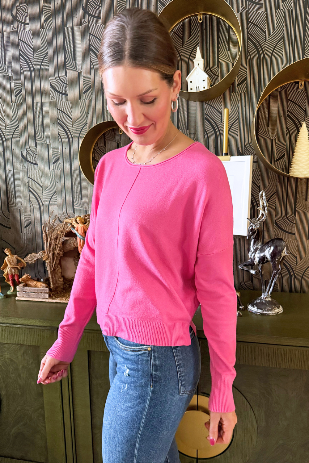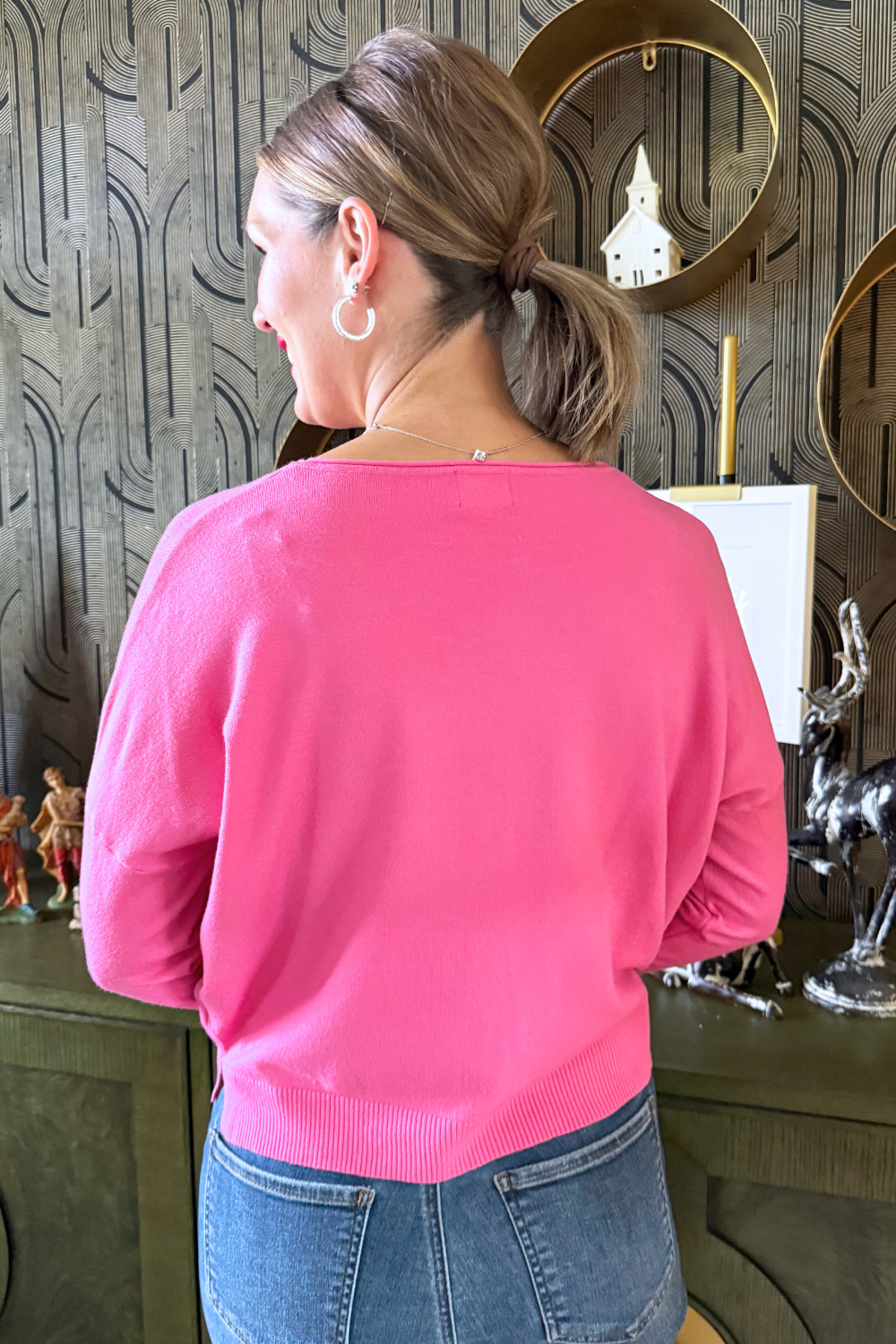 A pop of color is all you need to transition to Spring and Summer and this Center Seam Boat Neck Sweater is the perfect place to start! The wider neckline is a little flirty and a fun change from our big sweaters. This sweater has dolman sleeves and a cute center seam detail. Style with high waisted denim of any kind!