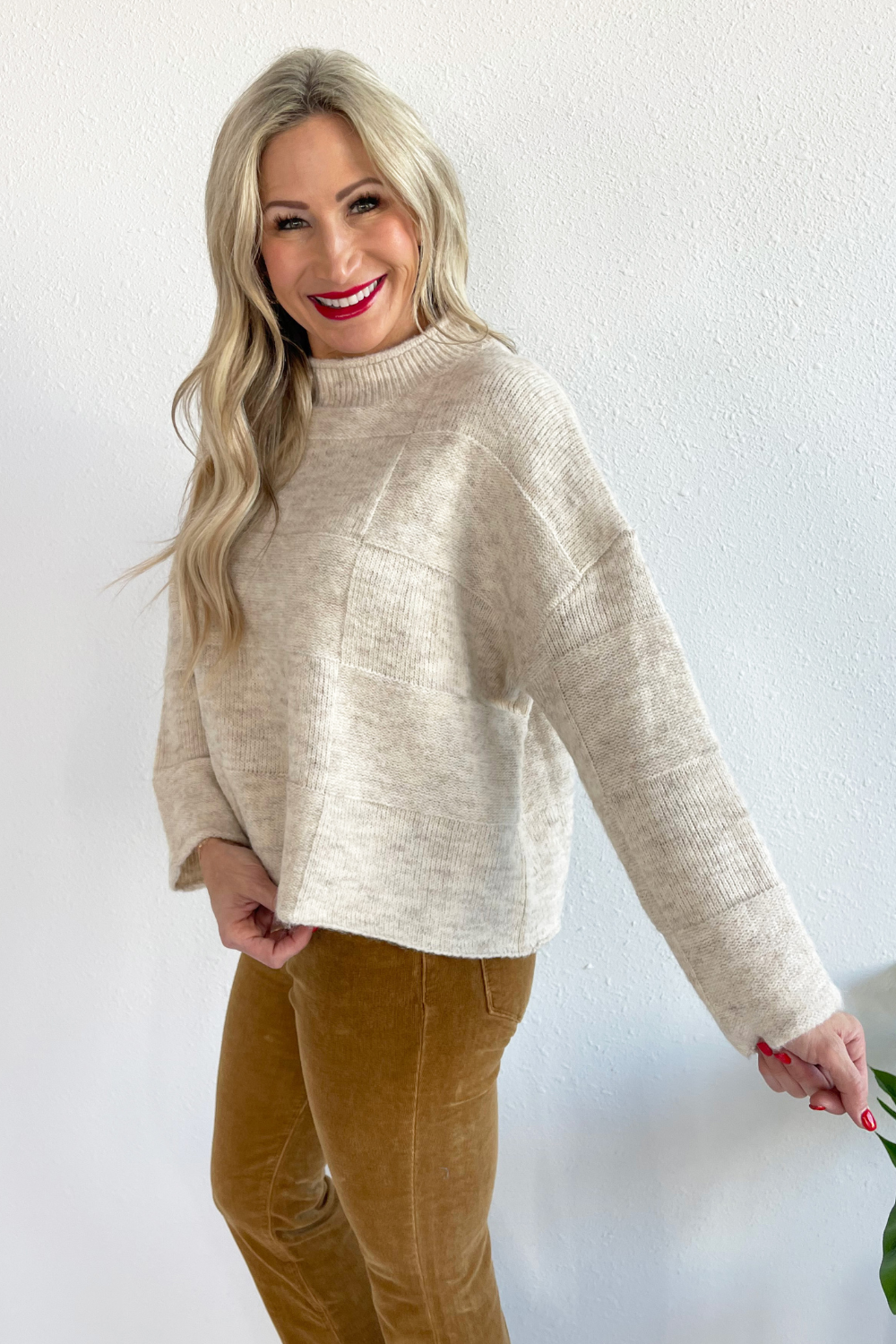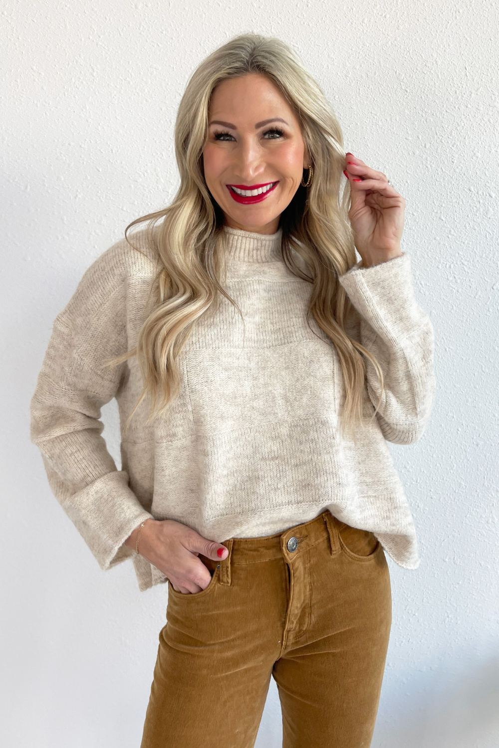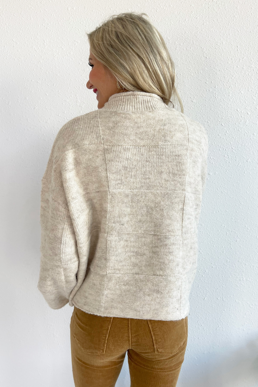 The Checker Mock Neck Sweater Top will keep you stylish and warm this season! This top has a mock neck and slight checker detailing throughout. The relaxed fit will keep you comfy and stylish. Pair the sweater top with your favorite denim or trousers.