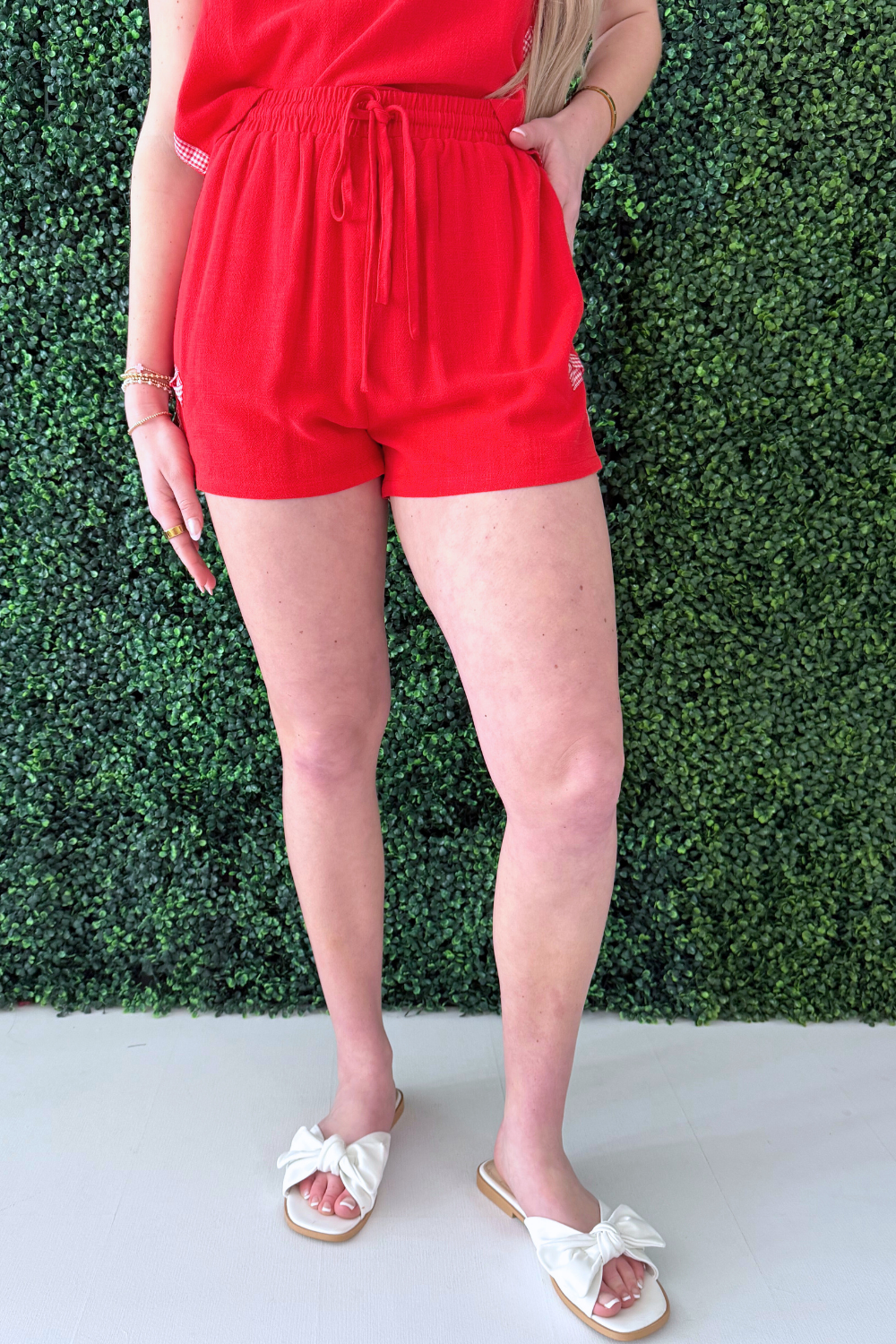 This Checkered Bow Shorts in red are a playful yet comfortable piece that’s perfect for lounging or casual days out. Designed with a soft fabrication and eye-catching checkered pattern, these shorts feature a comfortable elastic waistband and an adjustable bow tie detail for a feminine touch. The relaxed fit makes them easy to wear, while the bold red hue adds a fun pop of color. Pair them with the matching top for a coordinated set or style them with a simple tee for an effortless look.
