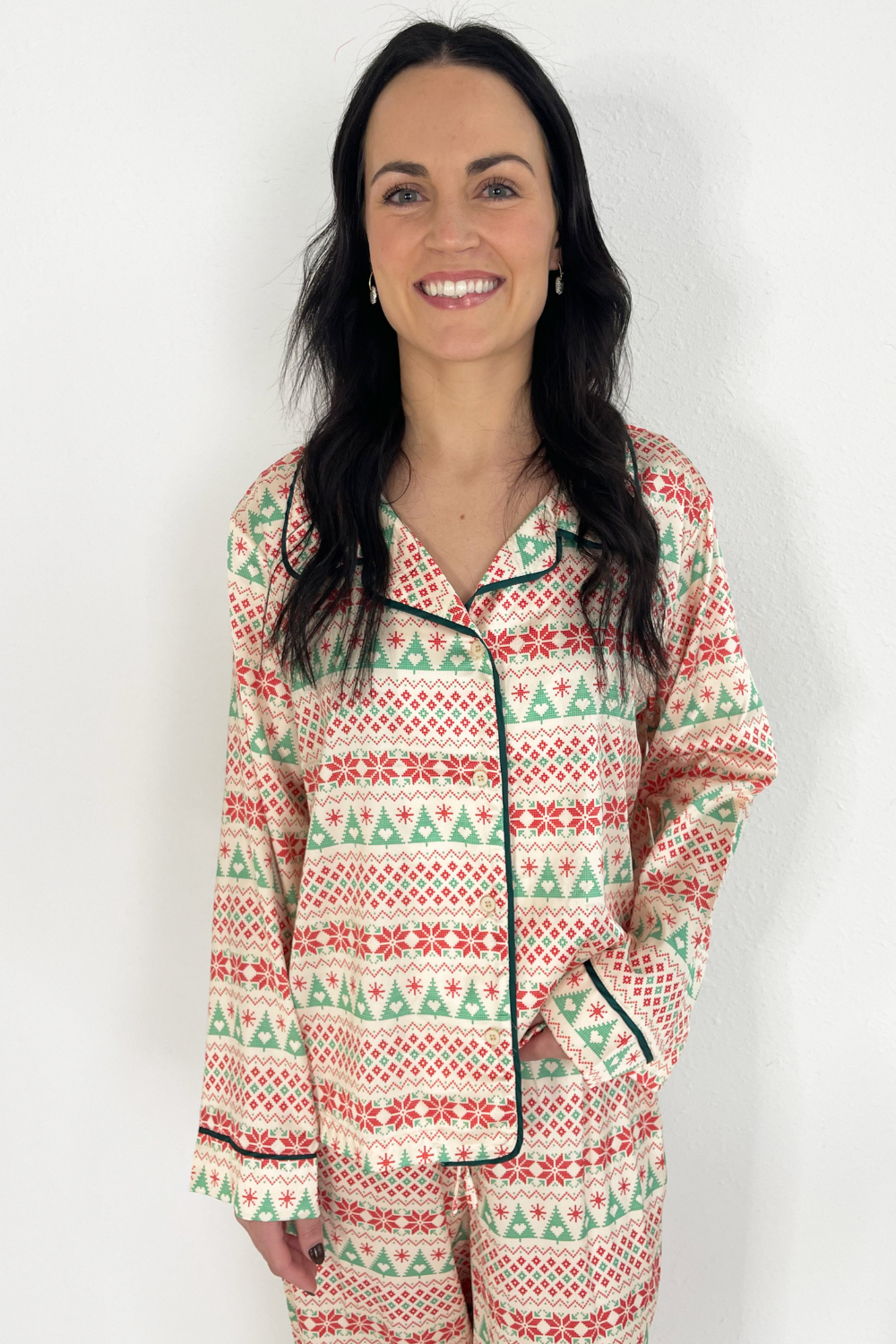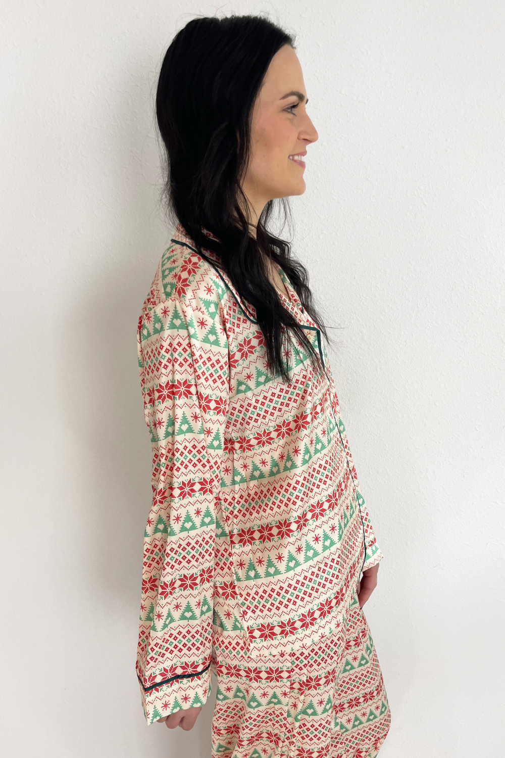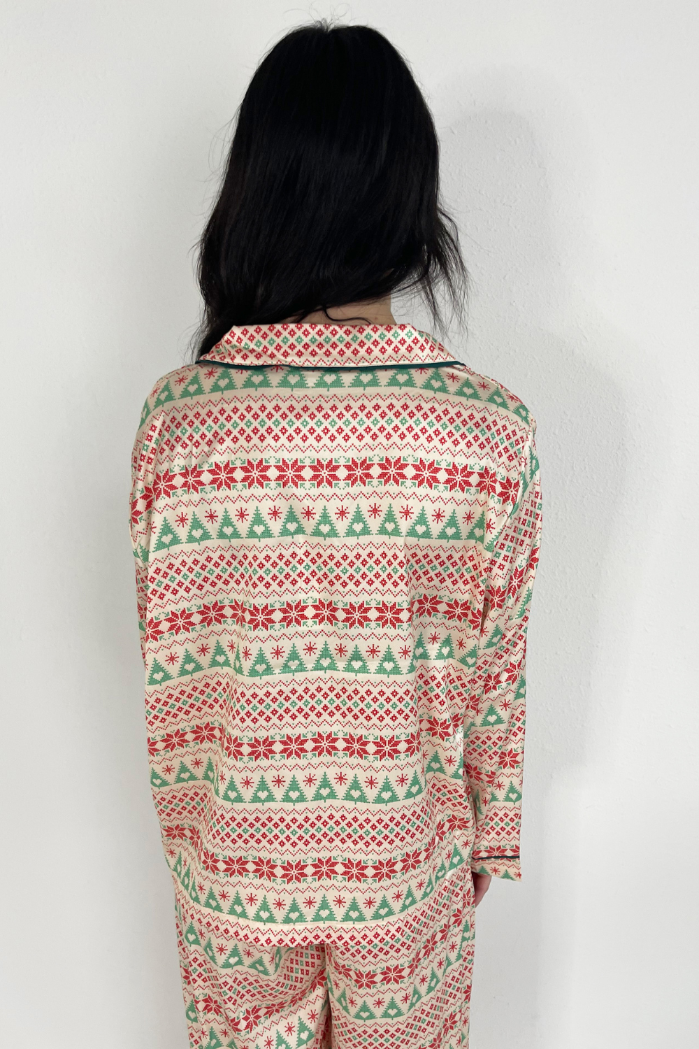 Celebrate the most magical morning in the Christmas Satin Pajama Set! Made of soft satin with a festive print, a collared neckline, long sleeves, and a button front. The elastic waistband and drawstring ensure a comfy fit!