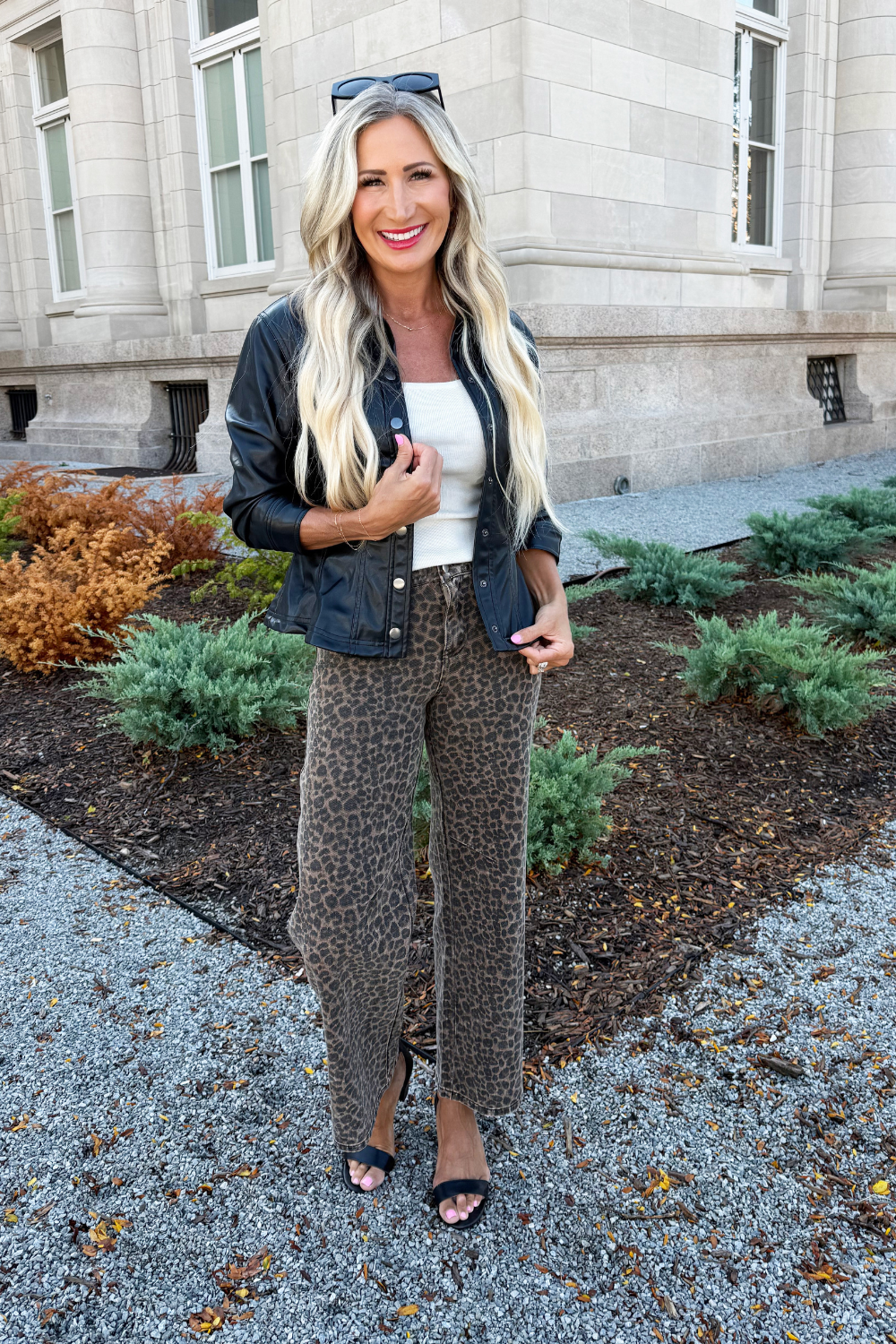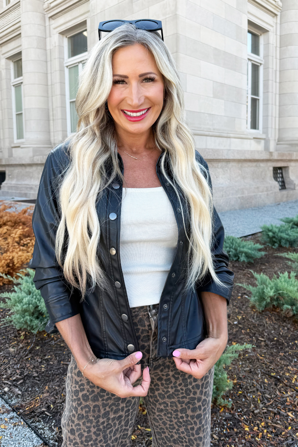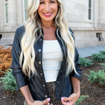 This Cinched 3/4 Sleeve Detail Faux Leather Peplum Jacket is a statement piece with effortless style. The tailored fit and peplum detail create a flattering silhouette, while the faux leather adds an edgy finish. Perfect for layering over dresses or jeans!