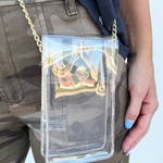 Go hands (and worry!) free with the Clear Small Crossbody. Whether you’re cheering in the stands or jamming at a concert, this compact pouch will keep your phone and essentials secure with its snap closure. Featuring gold chain detailing on its strap, this crossbody is as fashionable as it is practical.