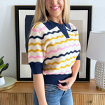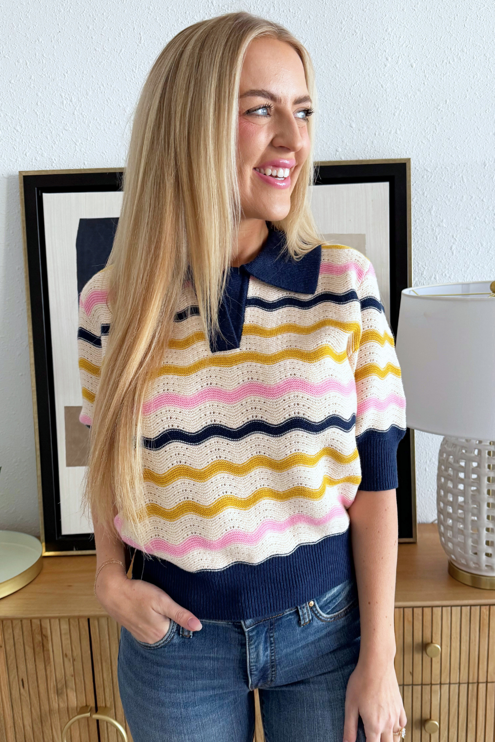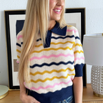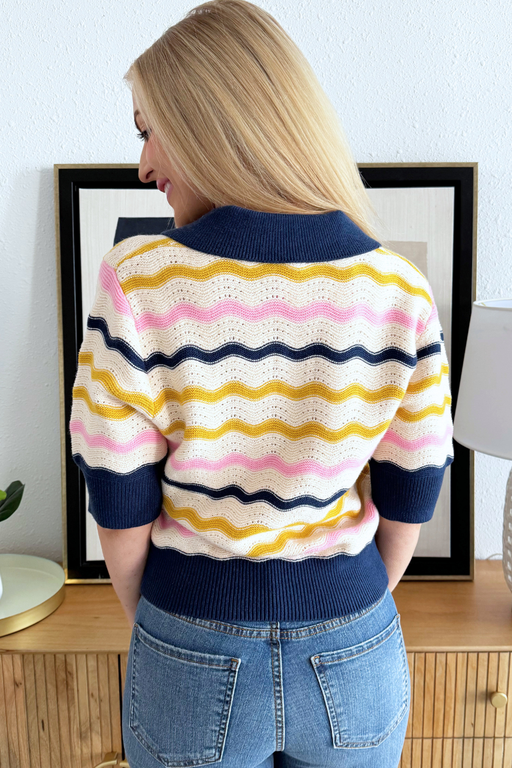 This collared chevron half-sleeve sweater top combines classic charm with modern style. Featuring a bold chevron pattern and a structured collar, it offers a polished yet relaxed look. Perfect for layering or wearing on its own for effortless, everyday sophistication!