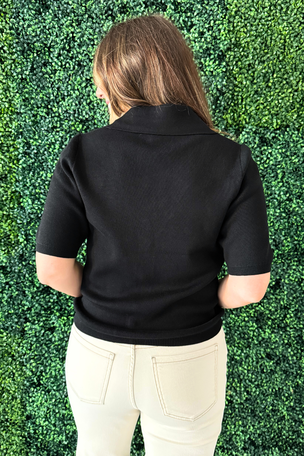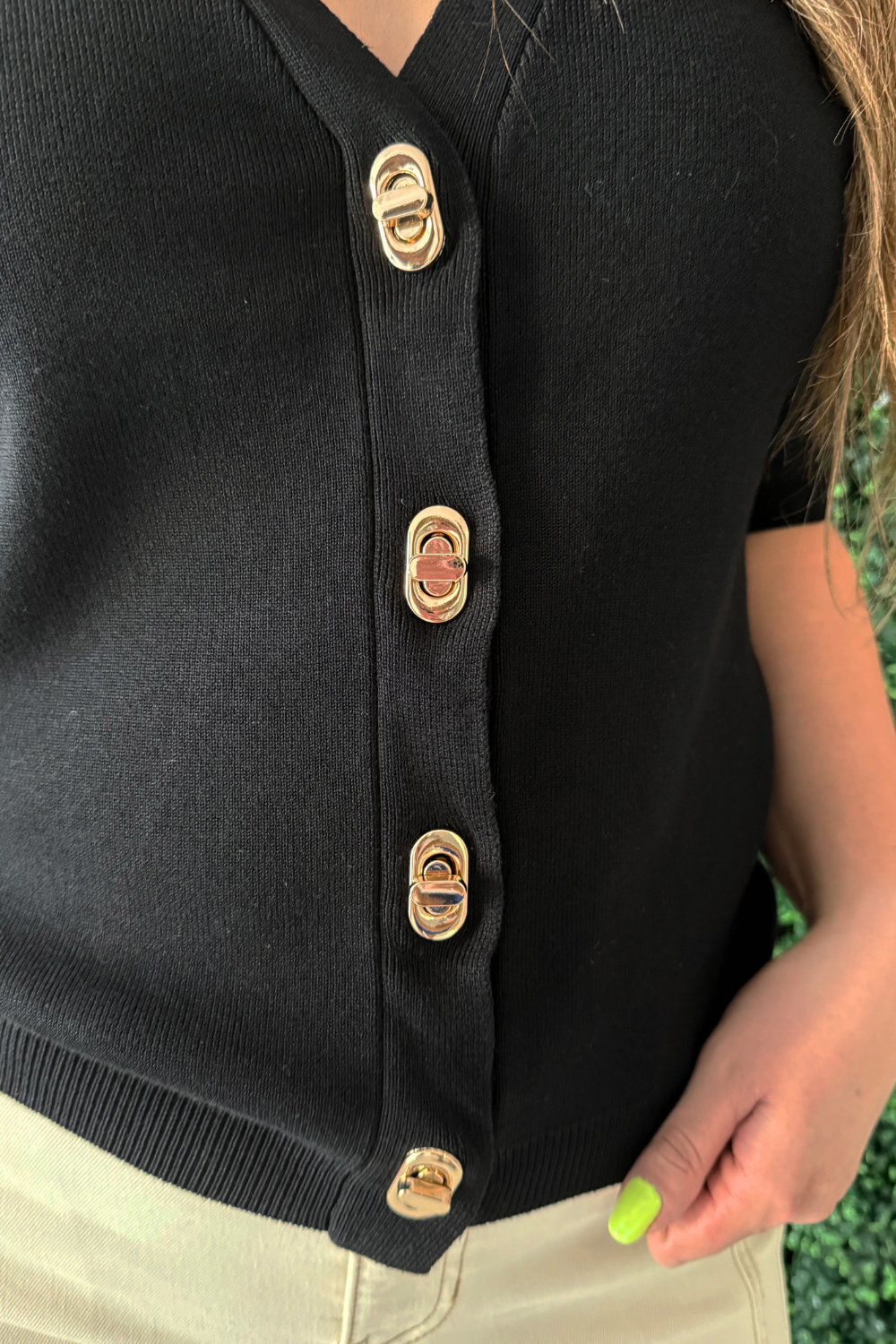 The Collared Knit Top with Gold Twist Buttons is a classic top with an elevated look. It has a collared V neck, short sleeves, and unique gold twist buttons. This top looks great with denim, trousers, and skirts.