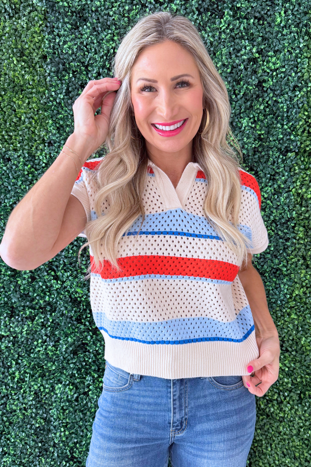 The Collared Striped Sweater Top blends classic style with a sporty touch, making it an easy choice for everyday wear. Crafted from soft sweater knit fabric, it offers lightweight comfort while maintaining a polished look. The structured collar adds a refined element, while the stripe pattern keeps the design fresh and modern. Pair it with denim, trousers, or shorts for a versatile outfit that transitions seamlessly from casual days to on-the-go evenings.
