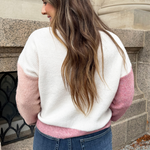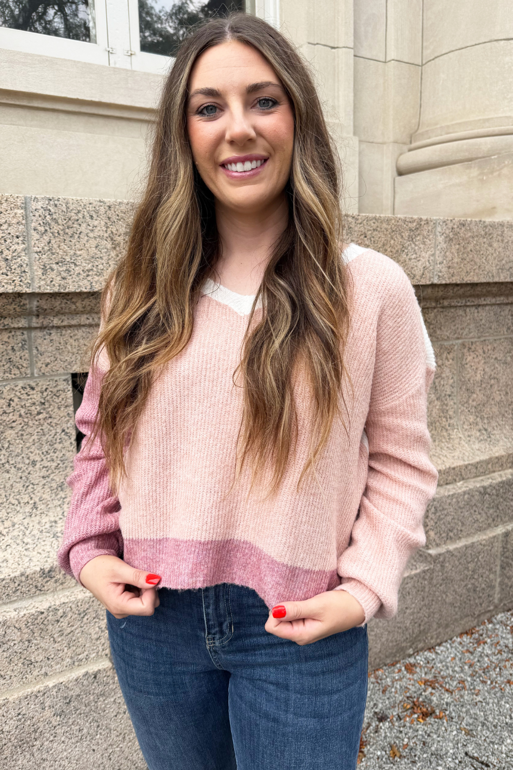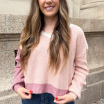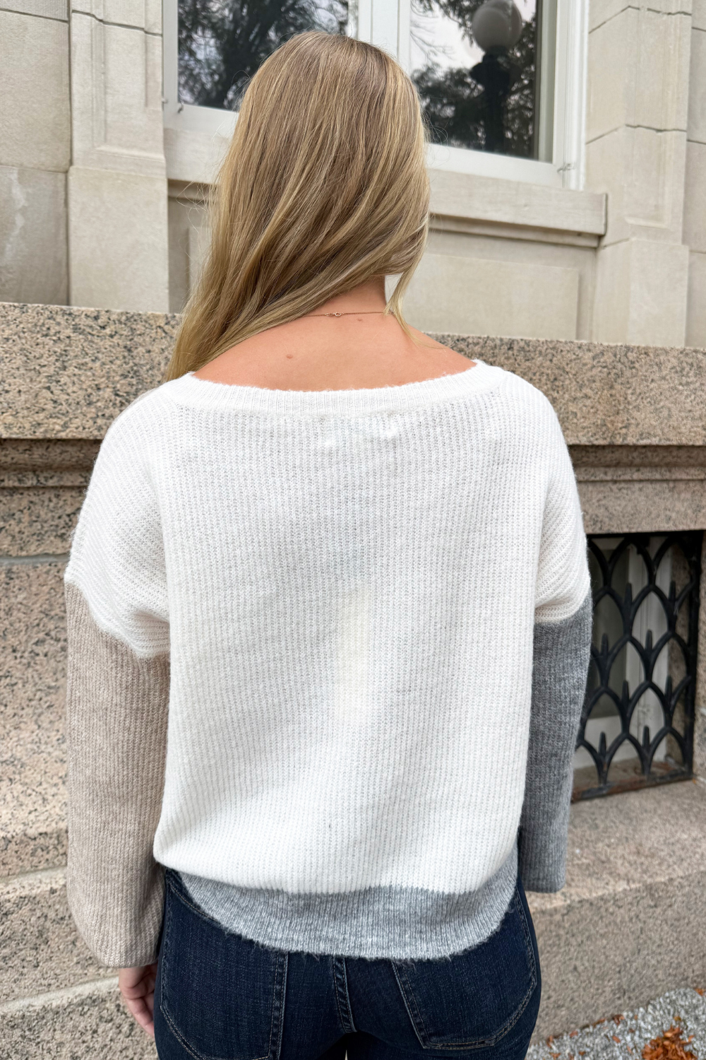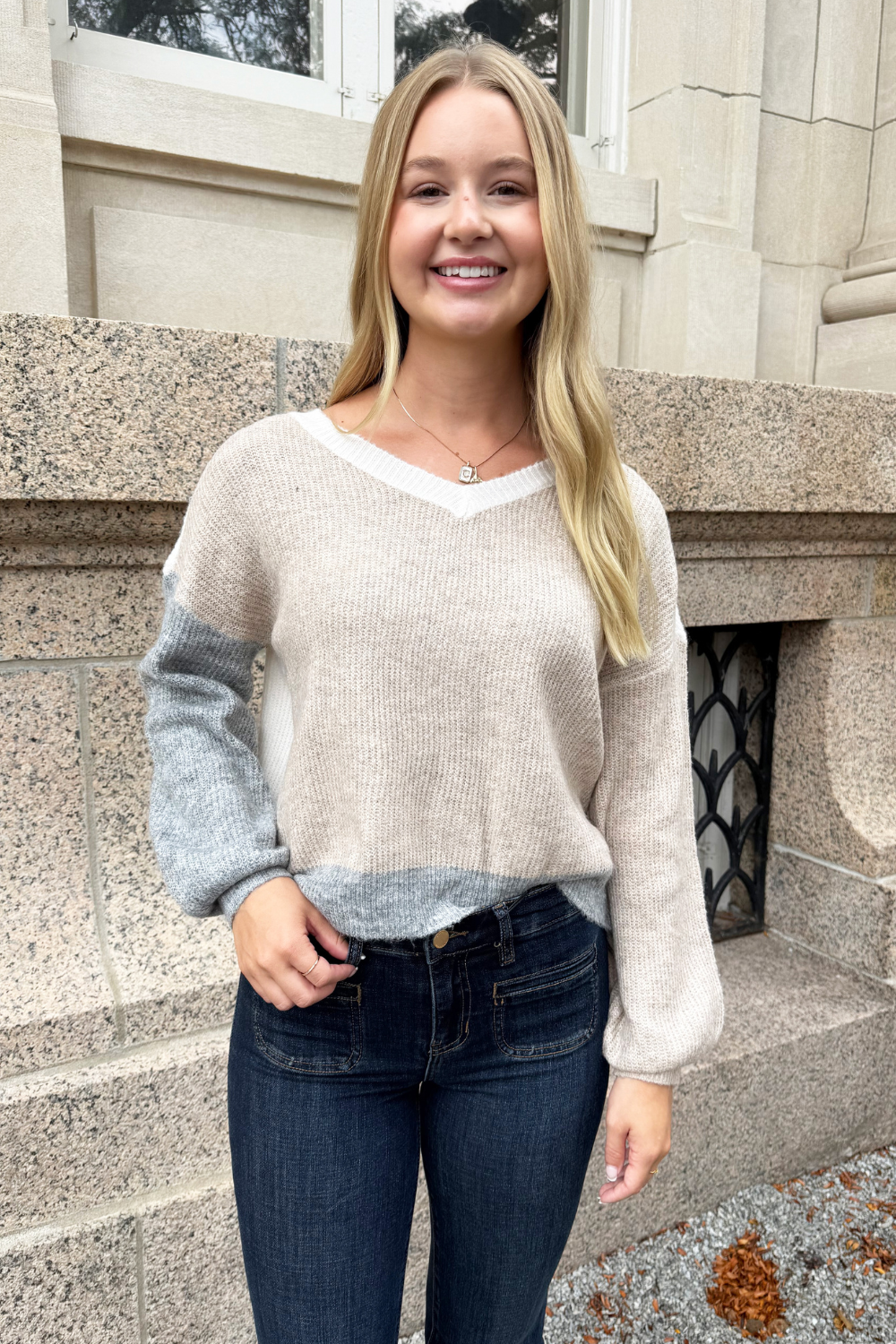 This colorblock sweater will be your new fall favorite! It can be paired back to white denim to make the contrast V Neck trim stand out!