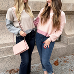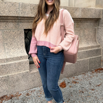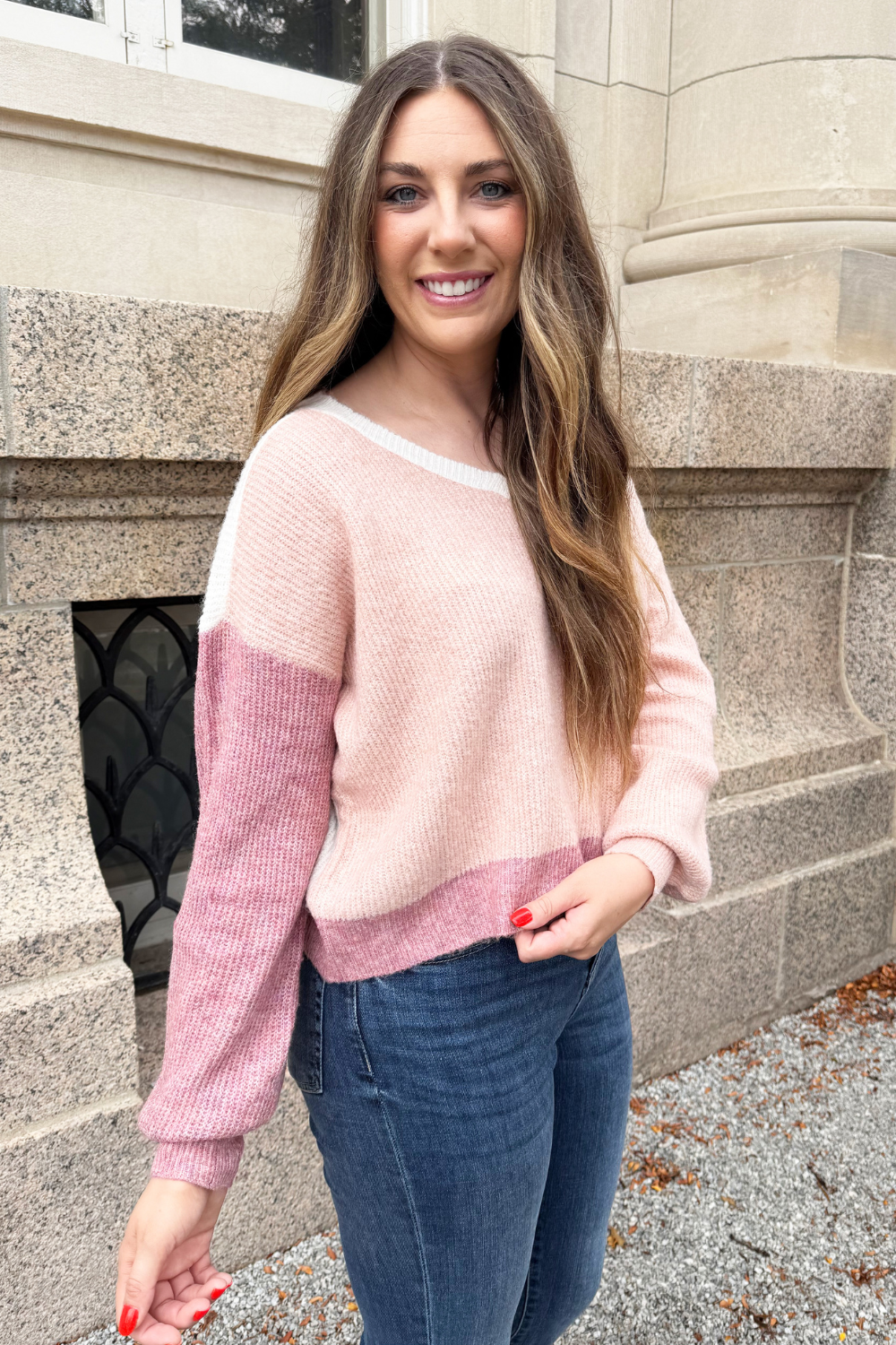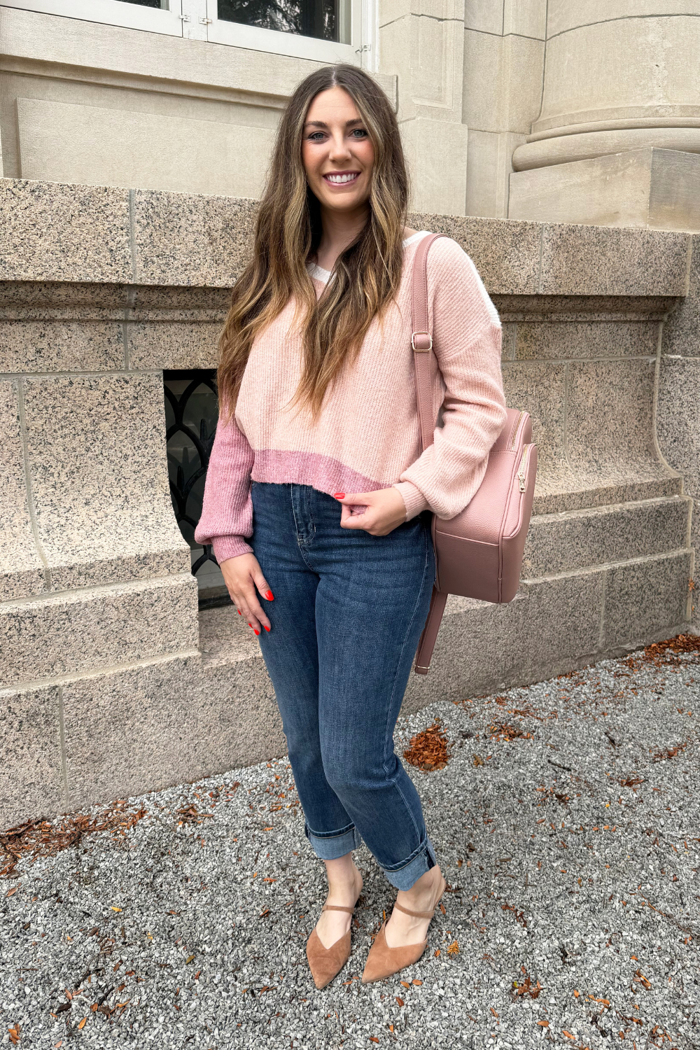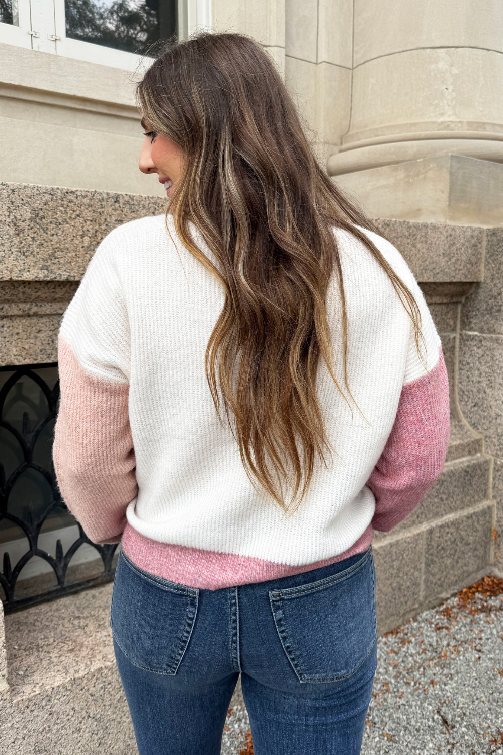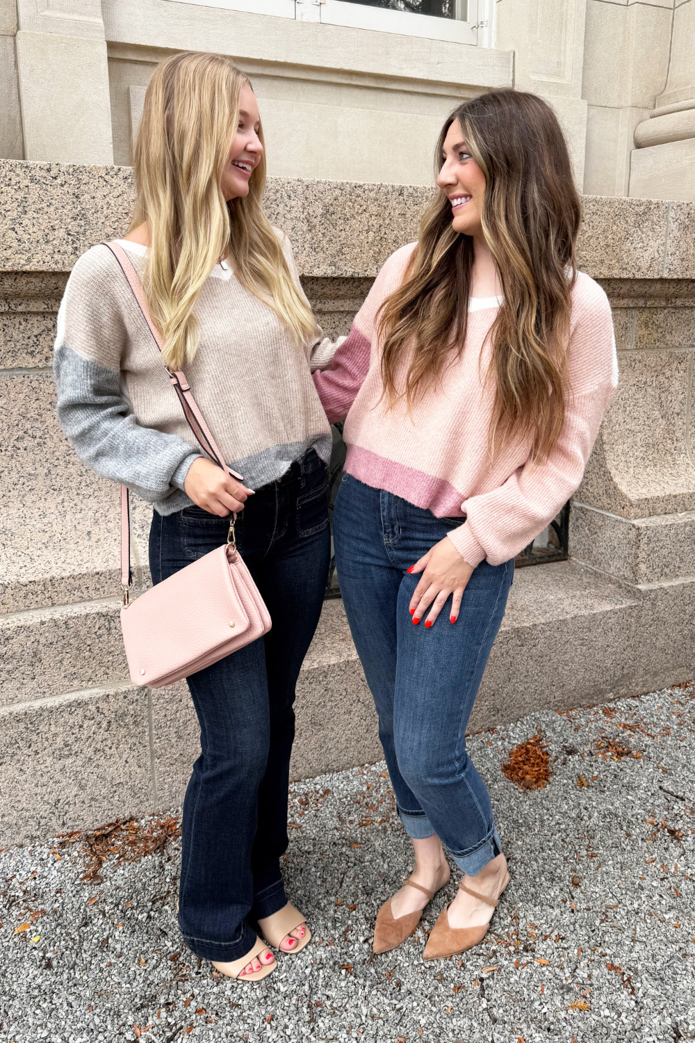 This colorblock sweater will be your new fall favorite! It can be paired back to white denim to make the contrast V Neck trim stand out!
