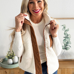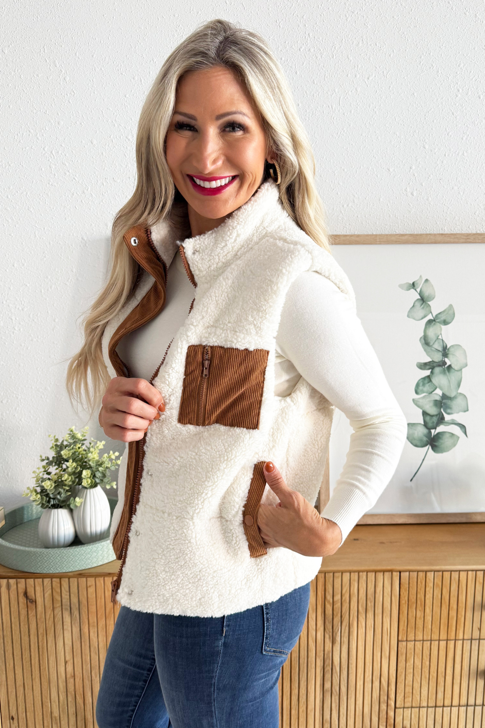 Perfect for layering this fall, the Corduroy Colorblock Sherpa Vest will have you reaching for it again and again! Layer over basic tops or sweaters for endless styling options!
