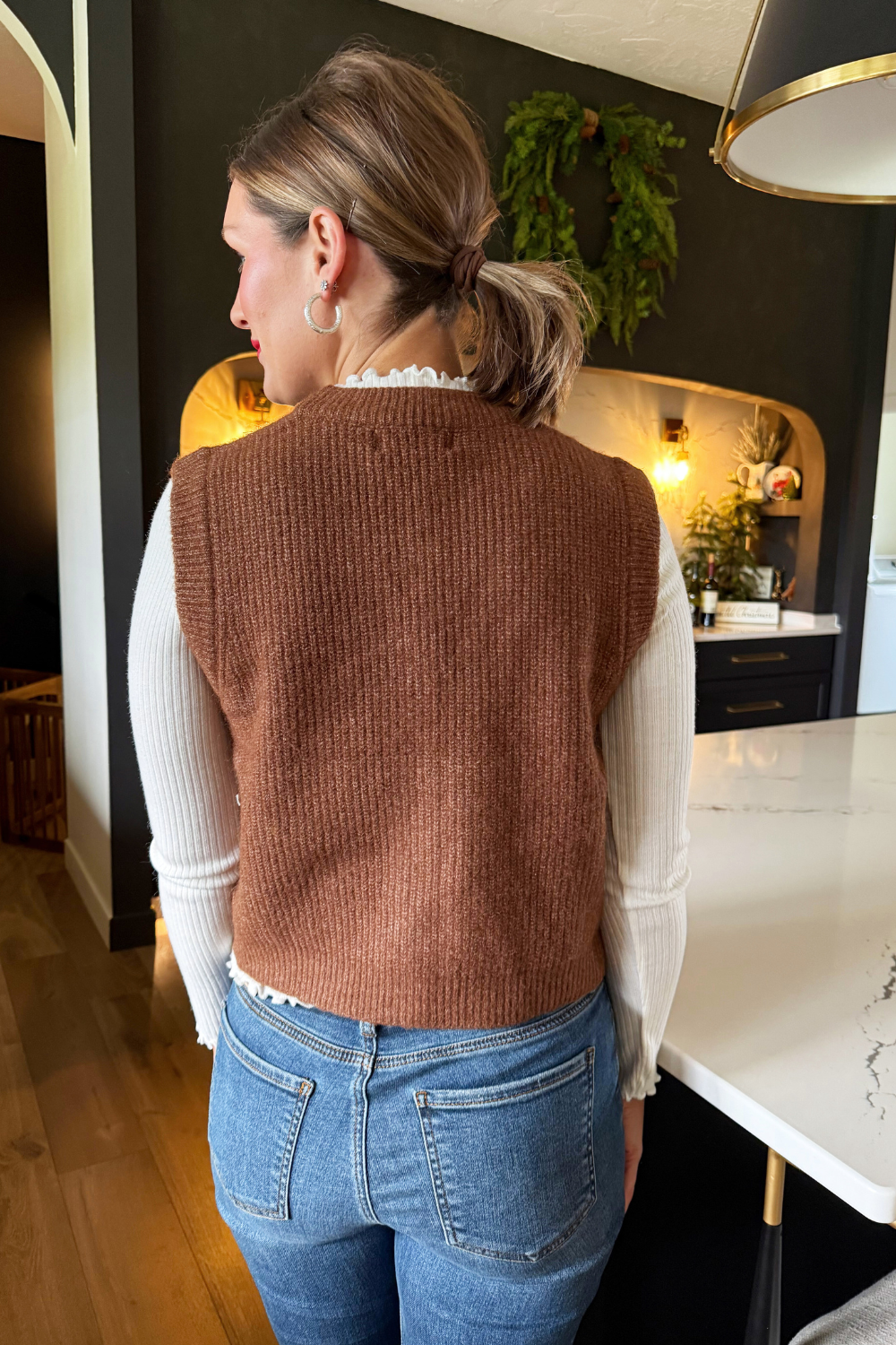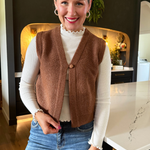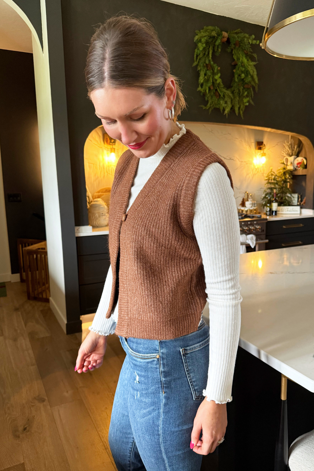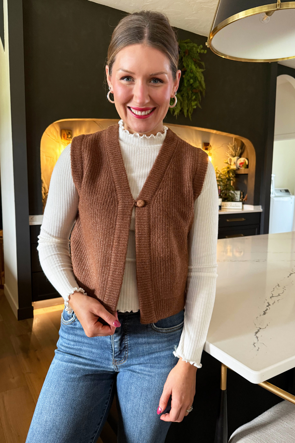 Stay snug and stylish in this cozy knit button vest. The soft texture and timeless silhouette make it a wardrobe staple, while the button closure lets you wear it open or closed. Easy, versatile, and endlessly comfy!