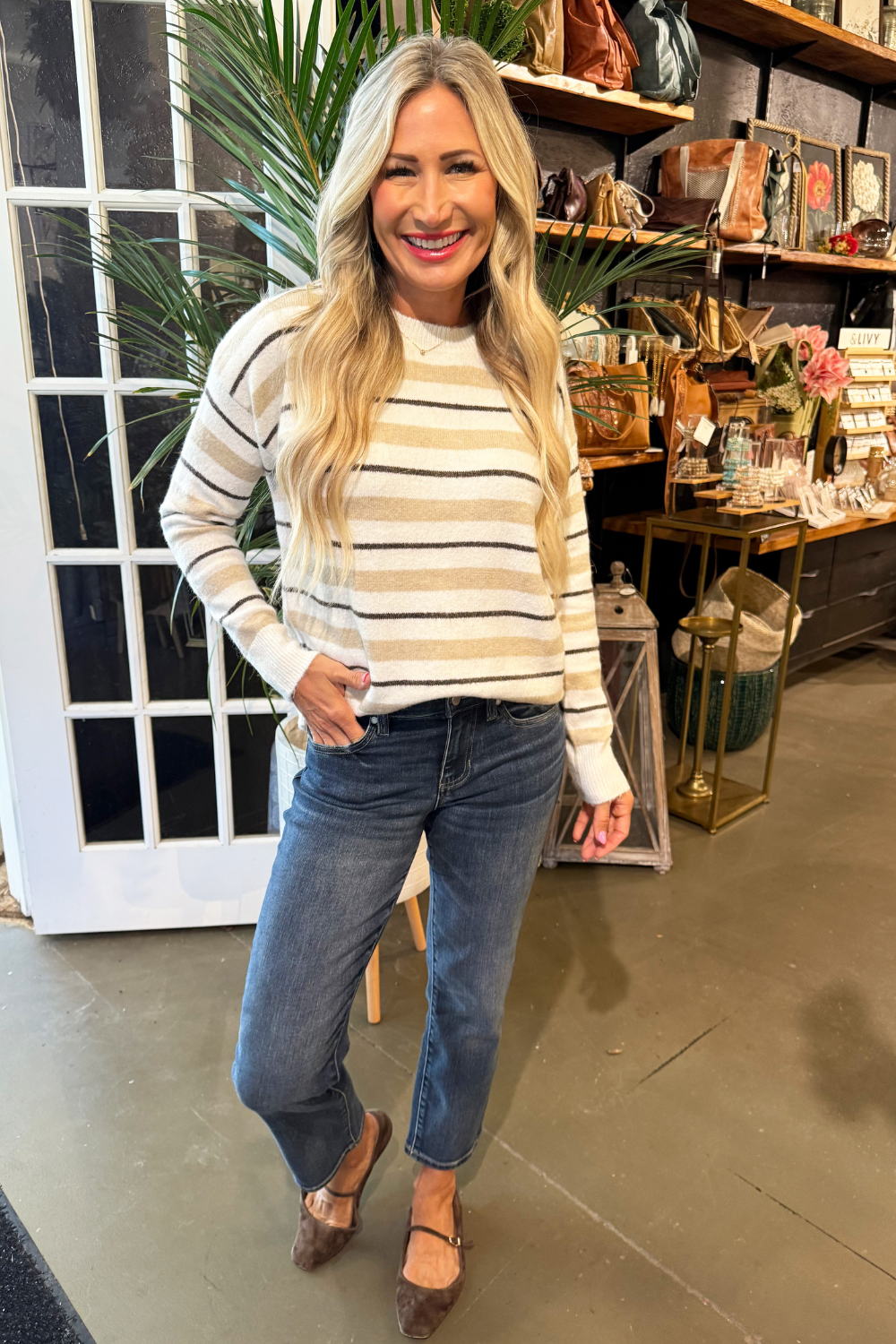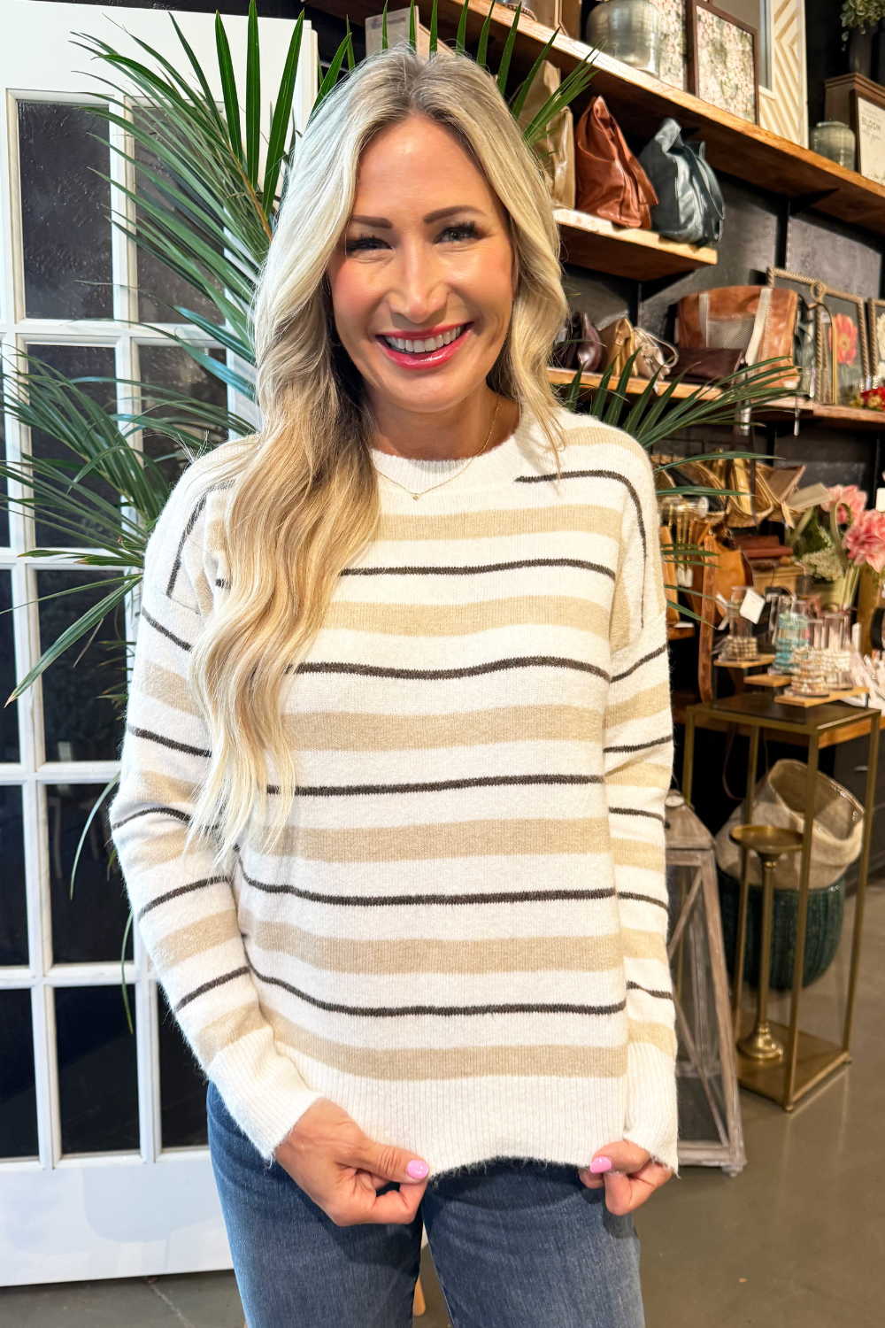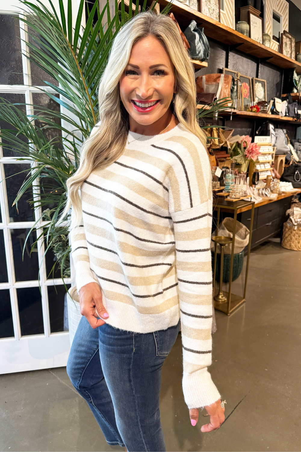 A fun twist on a classic, this striped pullover makes for the perfect fall top! Wear on its own or throw on a vest over top for a cozy layered look for endless styling options!