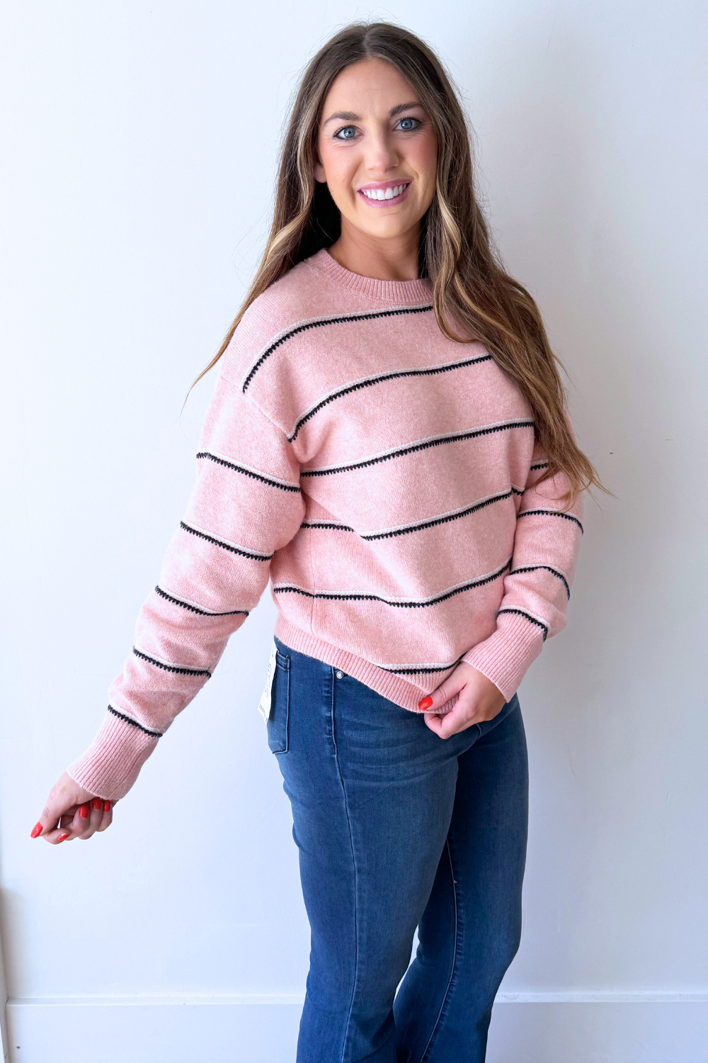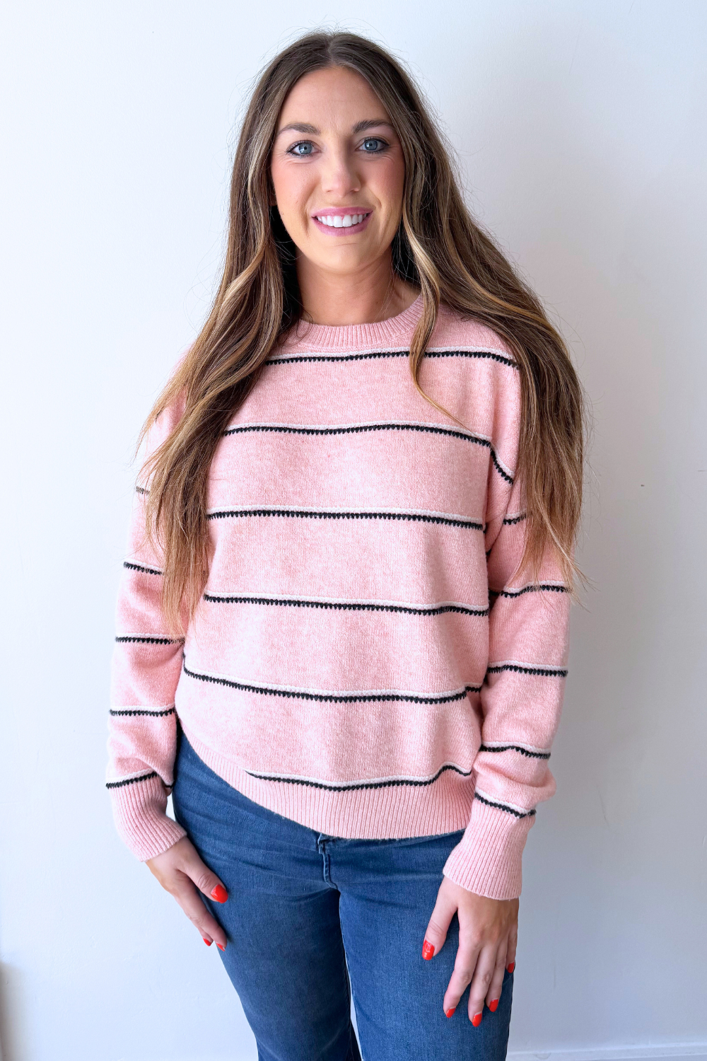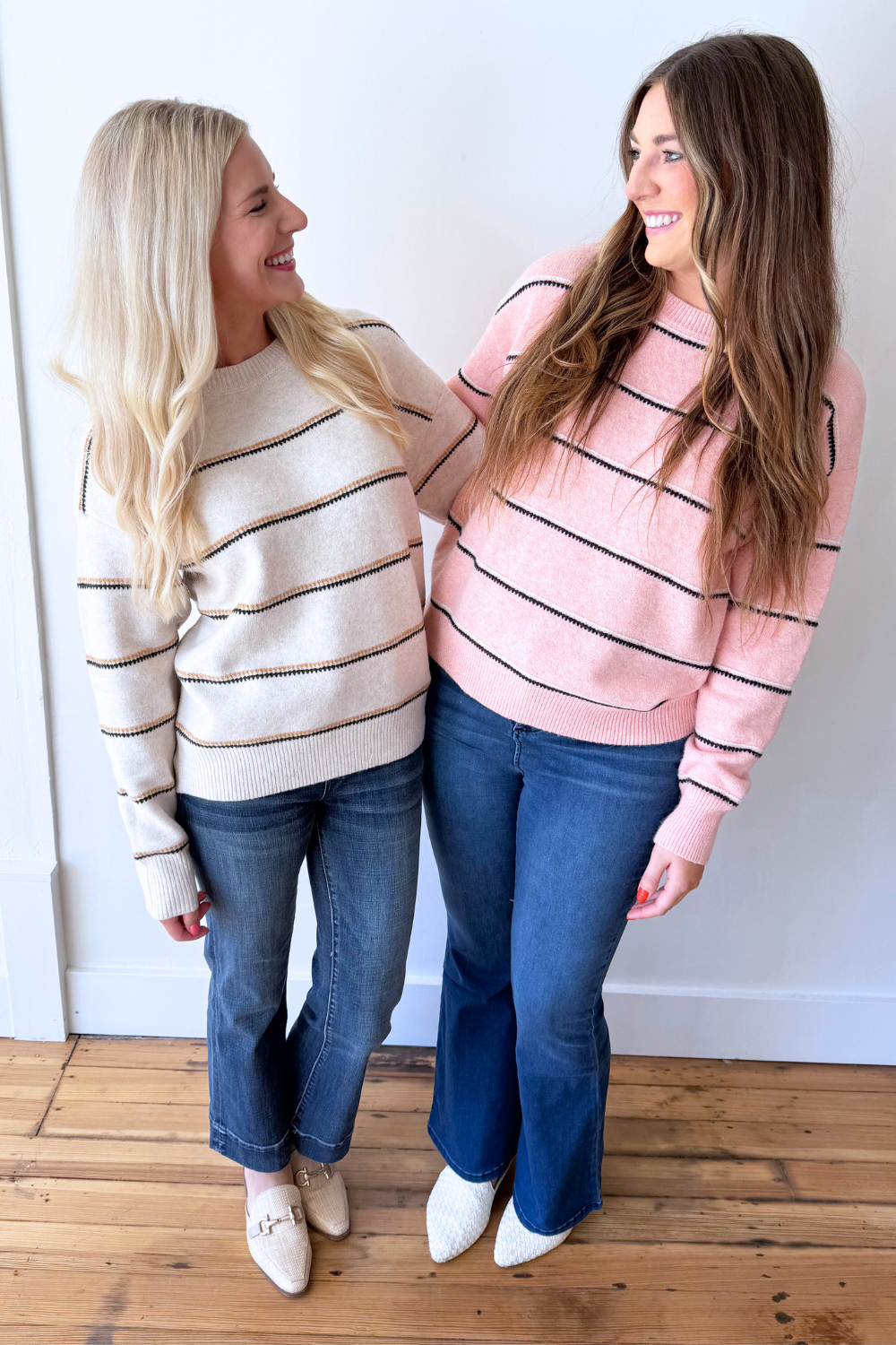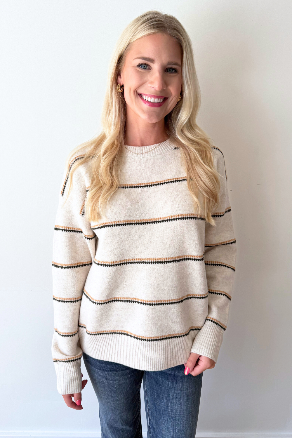 This crewneck sweater is about to be your newest fall staple! Made from a soft, breathable knit, it features subtle dual color striped detail that adds to this staple piece. Dress it up with trousers or keep it casual with your favorite denim!