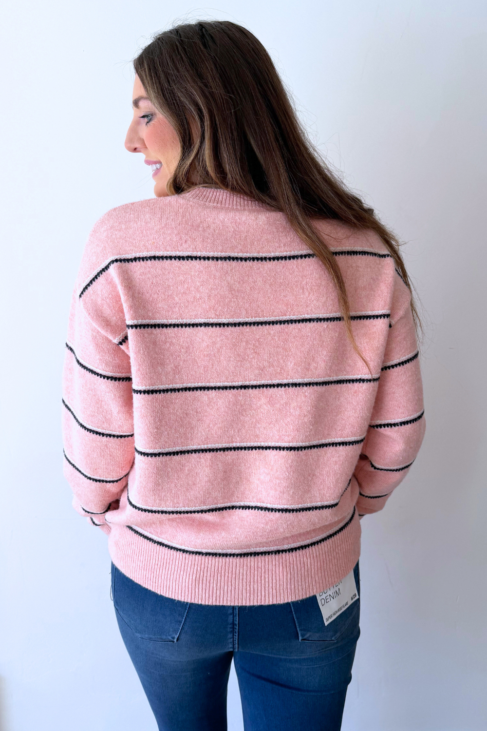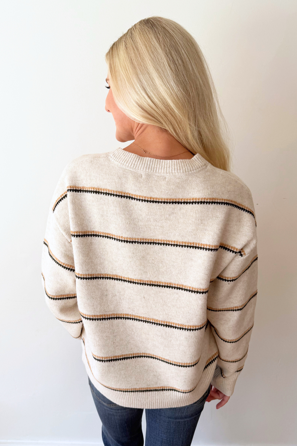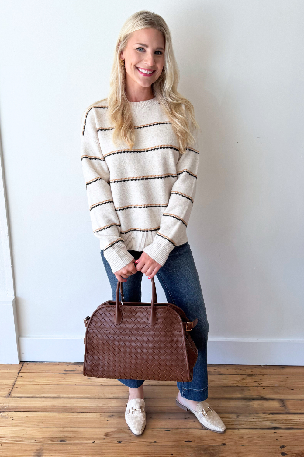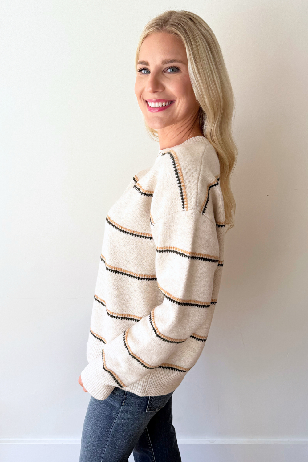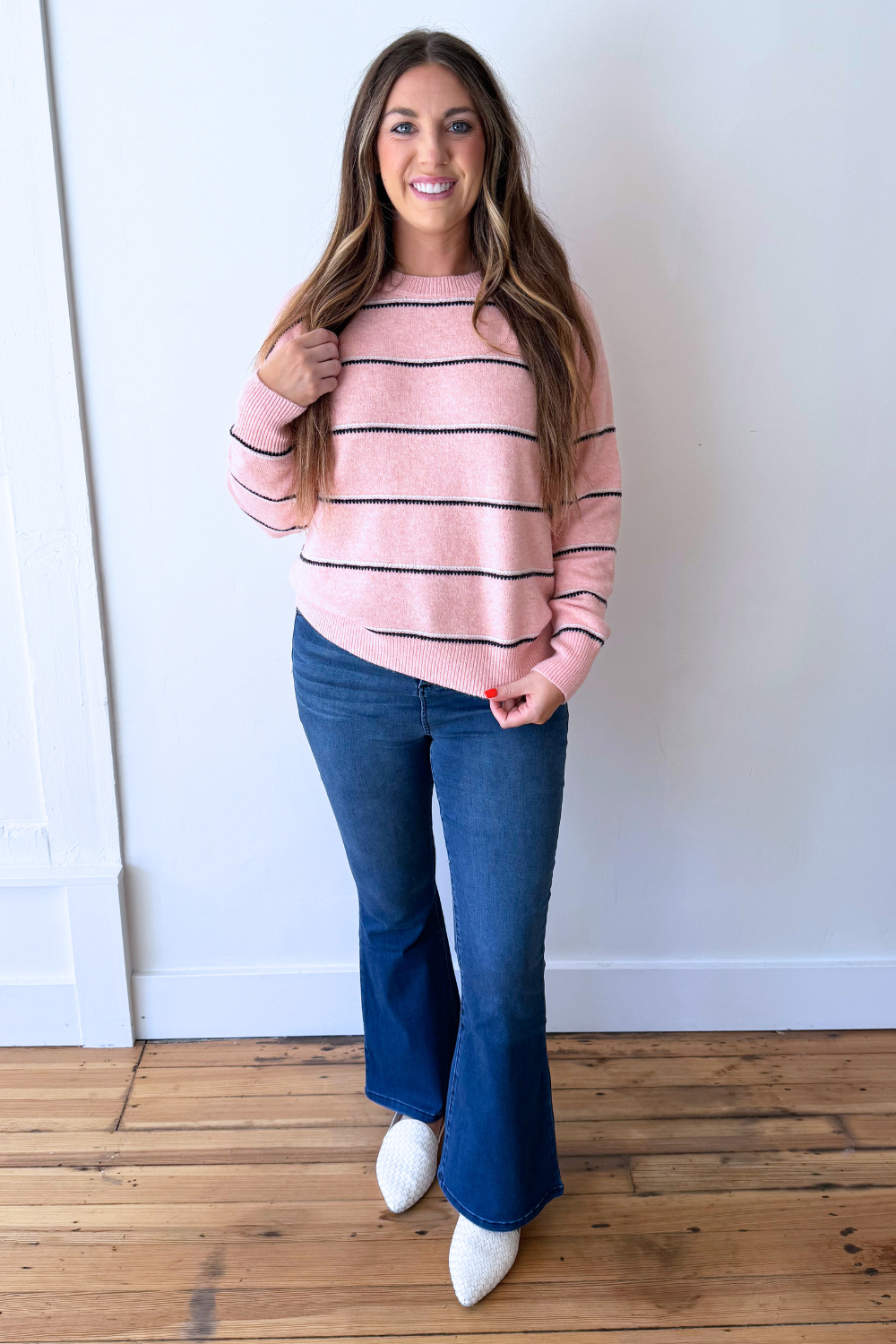 This crewneck sweater is about to be your newest fall staple! Made from a soft, breathable knit, it features subtle dual color striped detail that adds to this staple piece. Dress it up with trousers or keep it casual with your favorite denim!