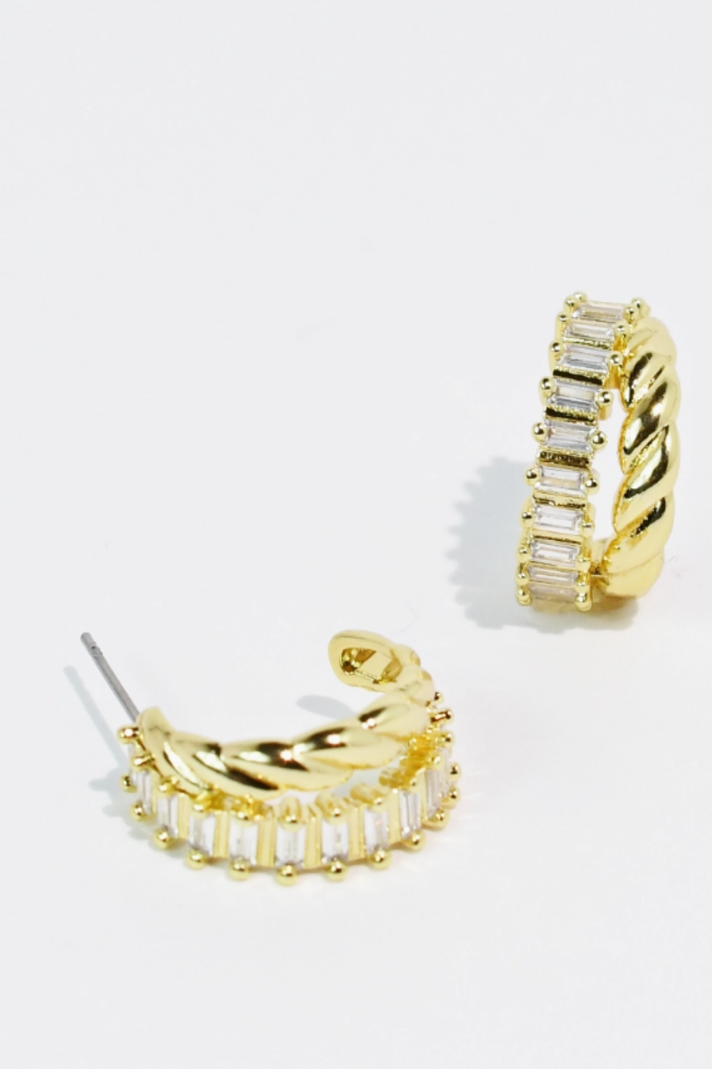 * The perfect mix of sparkle and style. These gold Huggies are detailed with baguette crystals and a subtle twisted texture that catches the light beautifully. * Easy to wear, comfy, and so chic.