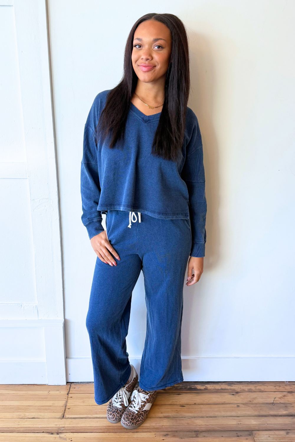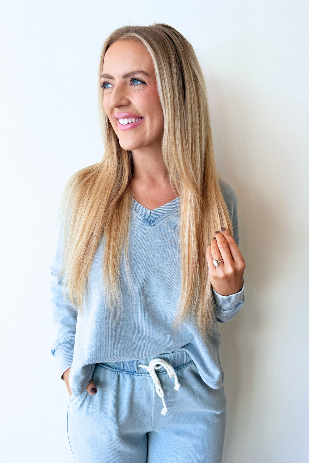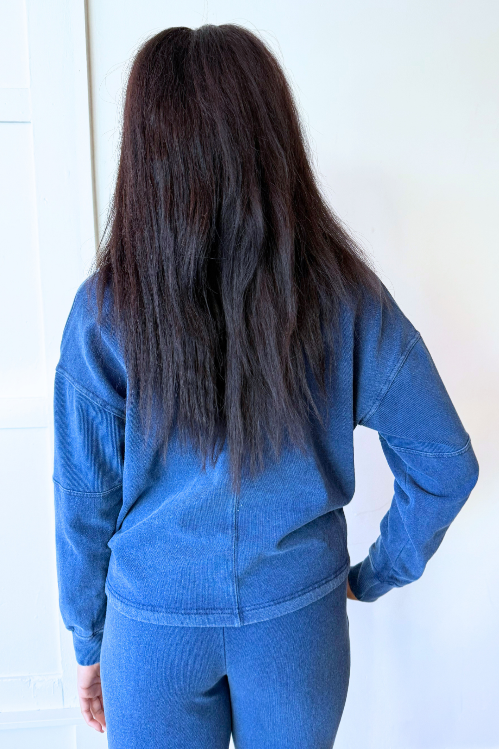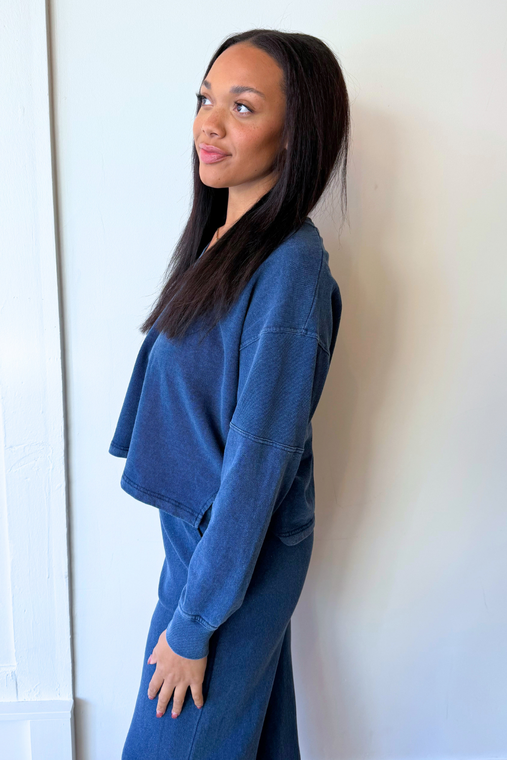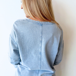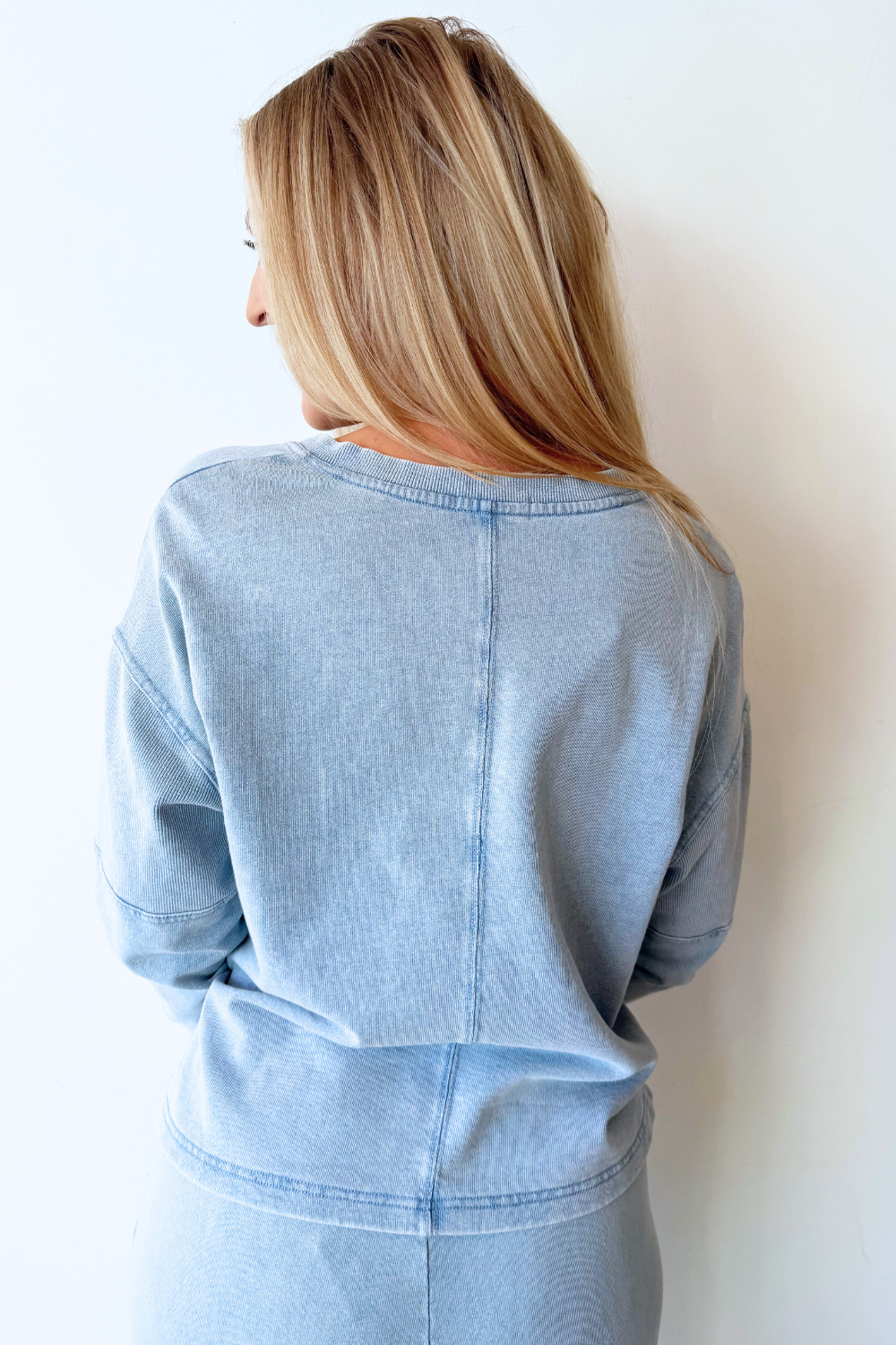 The Delphine Knit Denim Sweatshirt blends the laid-back feel of a sweatshirt with the look of classic denim. Made from soft knit fabric with a denim-inspired wash, it features a relaxed fit that’s perfect for everyday wear. Style with the Hunter Knit Denim Pant for a matching set!