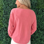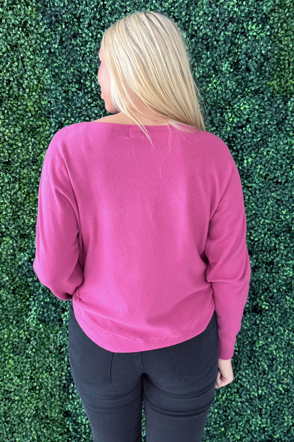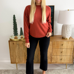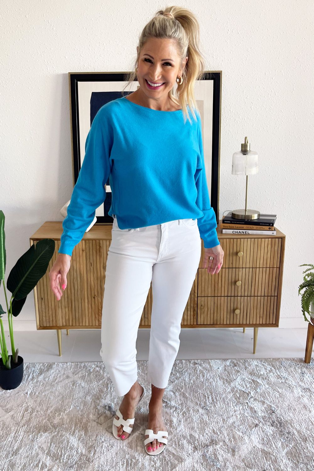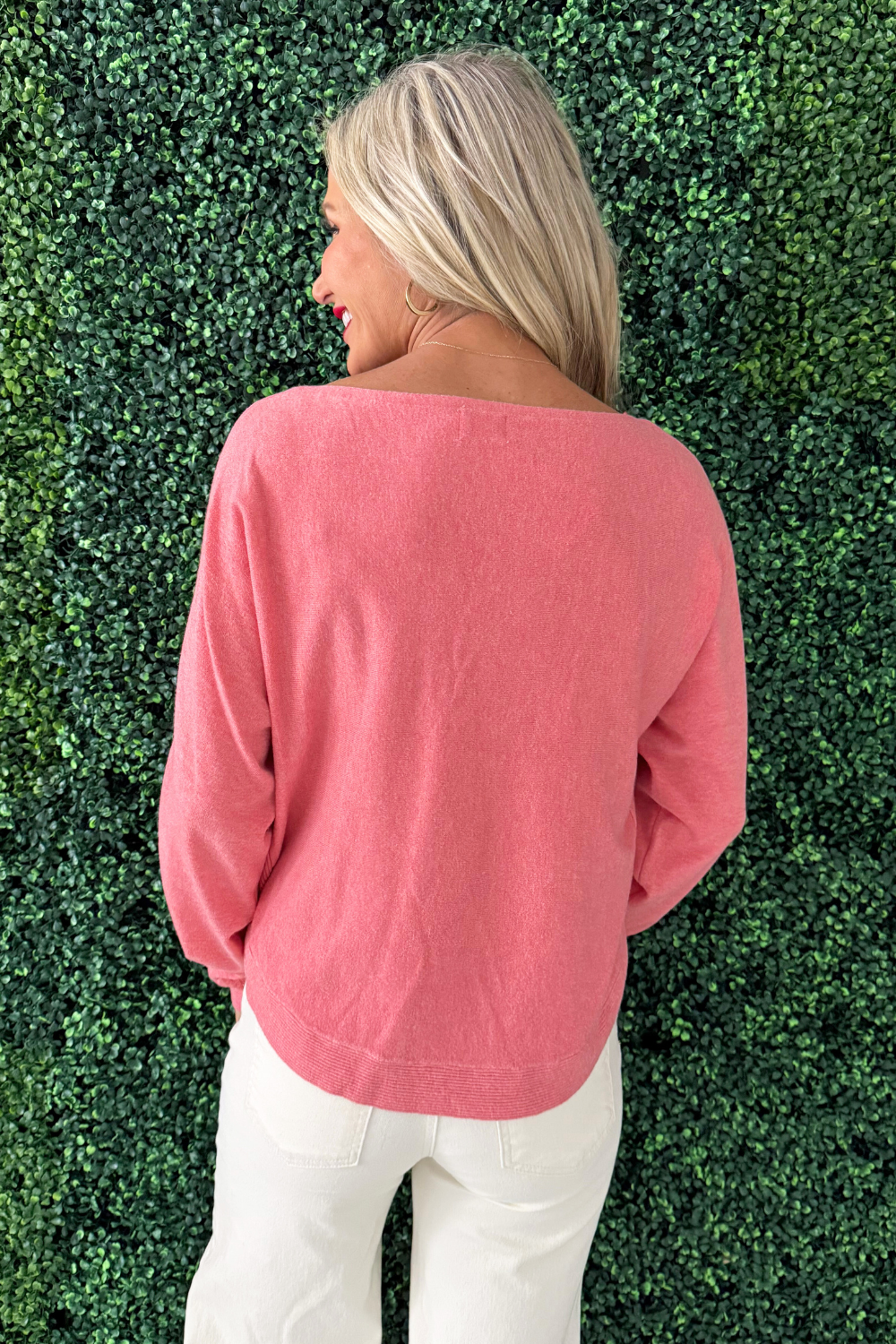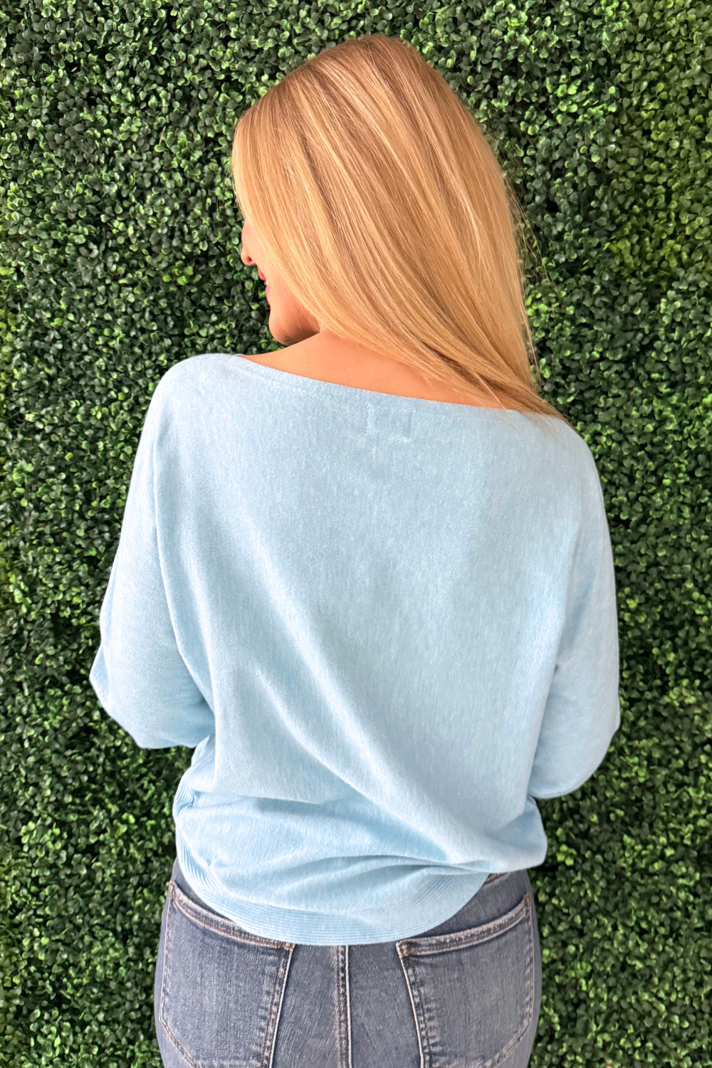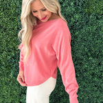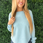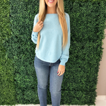 This Dolman Boat Neck Light Sweater has a new, refreshing look for an old classic. The boat neck combined with the dolman sleeves aren't a combo you see very often and that's precisely why we love this number so much! It is a little flirty with the wider neckline and extra comfortable with the silhouette. Style with the optic white Rachael High Rise Fab Ab Mom Raw Hem jeans for Erin's look.