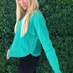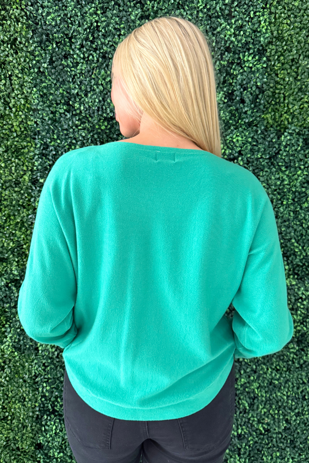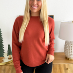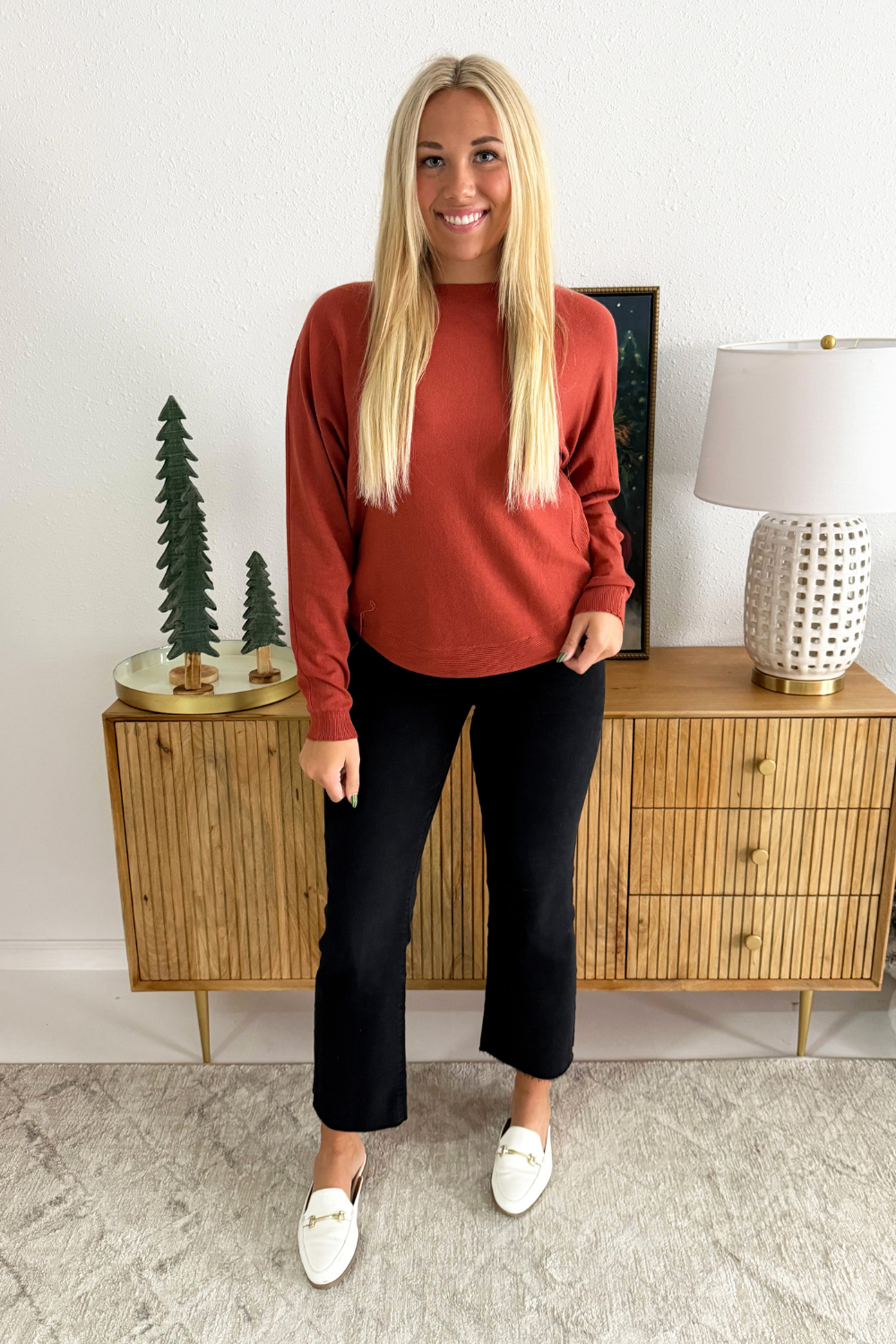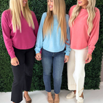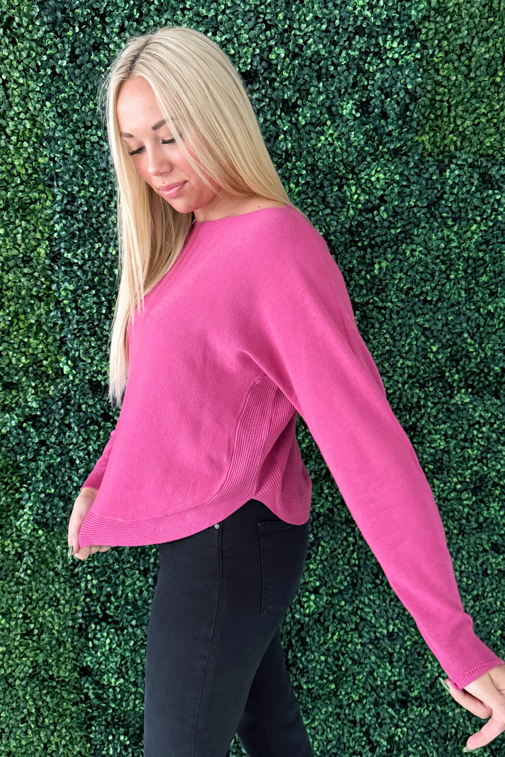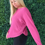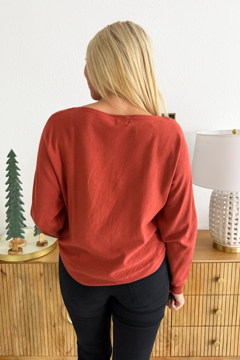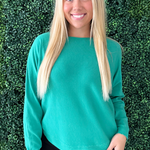 This Dolman Boat Neck Light Sweater has a new, refreshing look for an old classic. The boat neck combined with the dolman sleeves aren't a combo you see very often and that's precisely why we love this number so much! It is a little flirty with the wider neckline and extra comfortable with the silhouette. Style with the optic white Rachael High Rise Fab Ab Mom Raw Hem jeans for Erin's look.