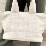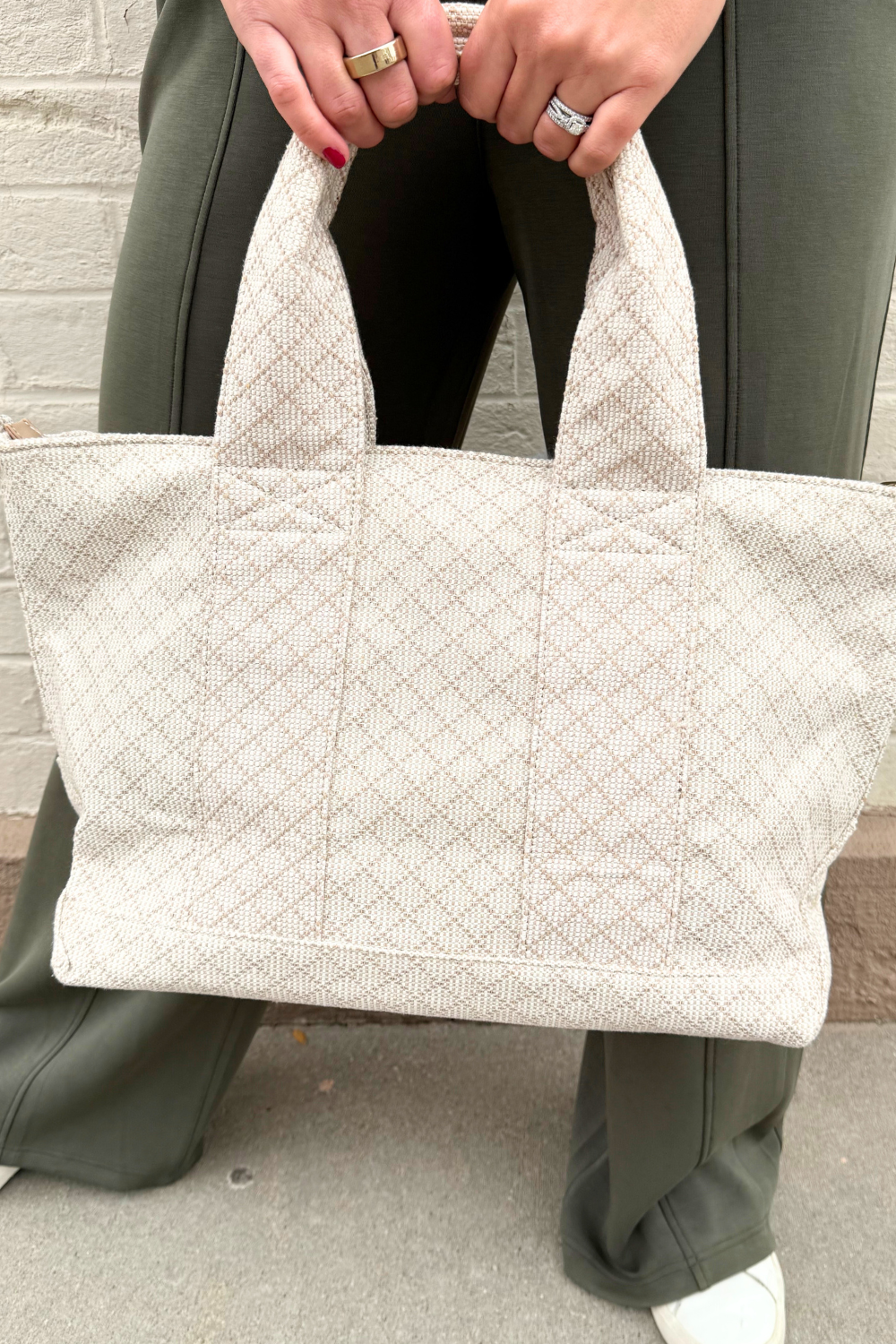 This tote is made of canvas and is covered in a colorful plaid pattern. The Dorret Weekender has a zipper closure and two straps - one handle and one adjustable, detachable strap. The inside of the bag is lined and has one zipper pocket and one slip pocket.