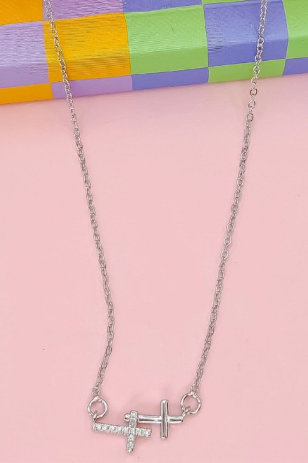 • A sleek silver chain featuring two side-by-side cross charms—one polished, one sparkling with cubic zirconia—for a modern take on meaningful style
