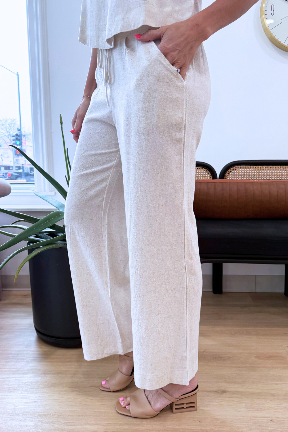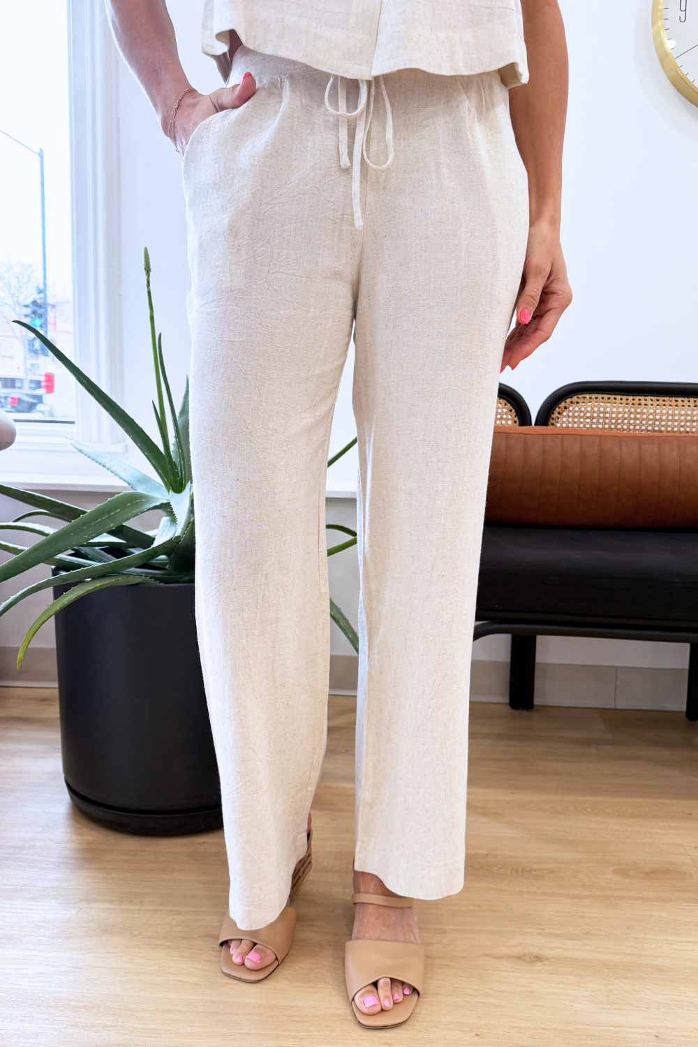 Drawstring Linen Blend Pants w/ Pockets — These lightweight linen blend pants are designed for effortless comfort and everyday style. Featuring a relaxed straight-leg fit and an adjustable drawstring waistband, they offer a flattering yet easygoing silhouette. The breathable fabric makes them perfect for warm weather, while the side pockets add practical function. Pair them with the matching linen top or a simple tank for an easy, put-together look.