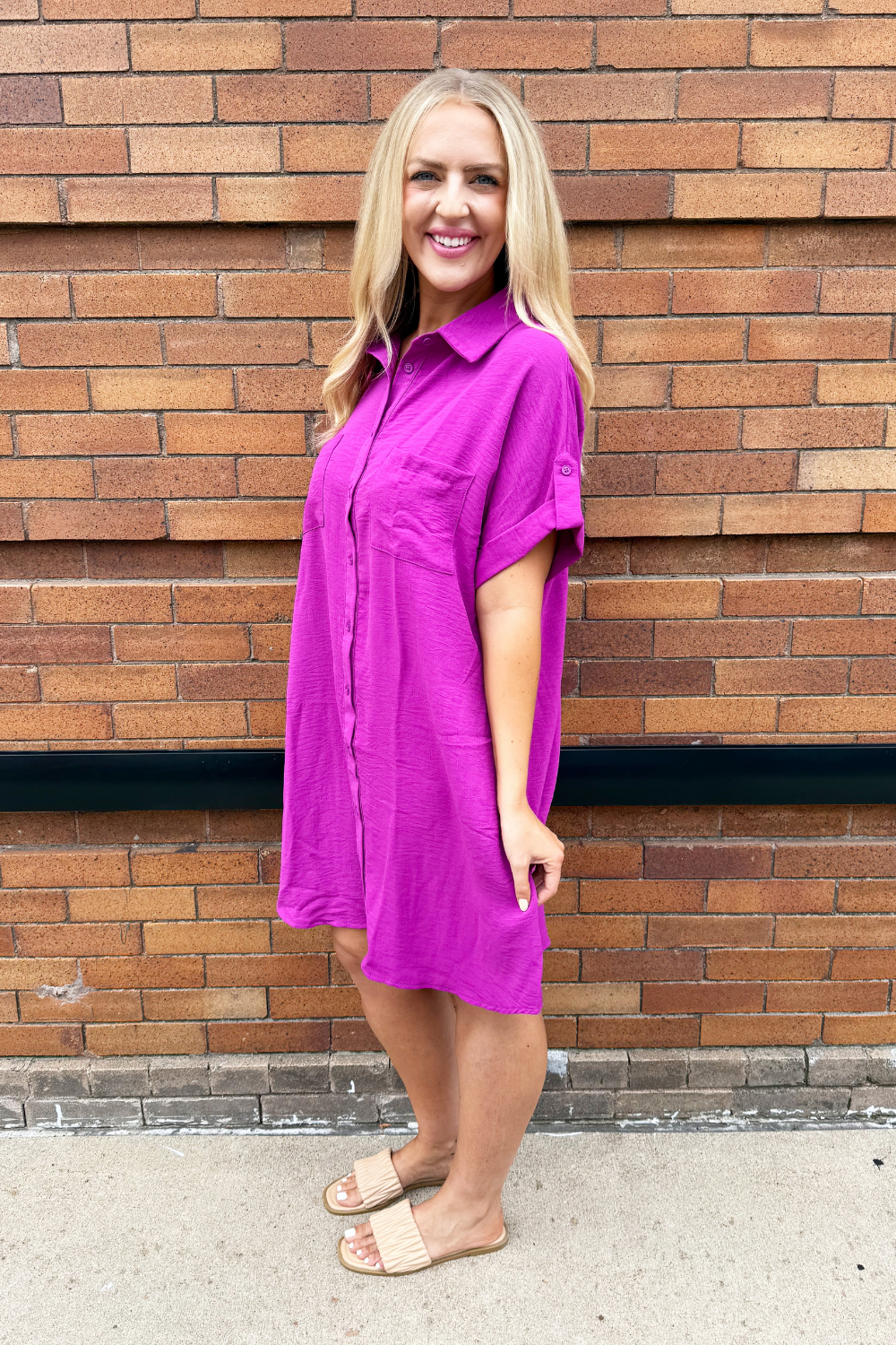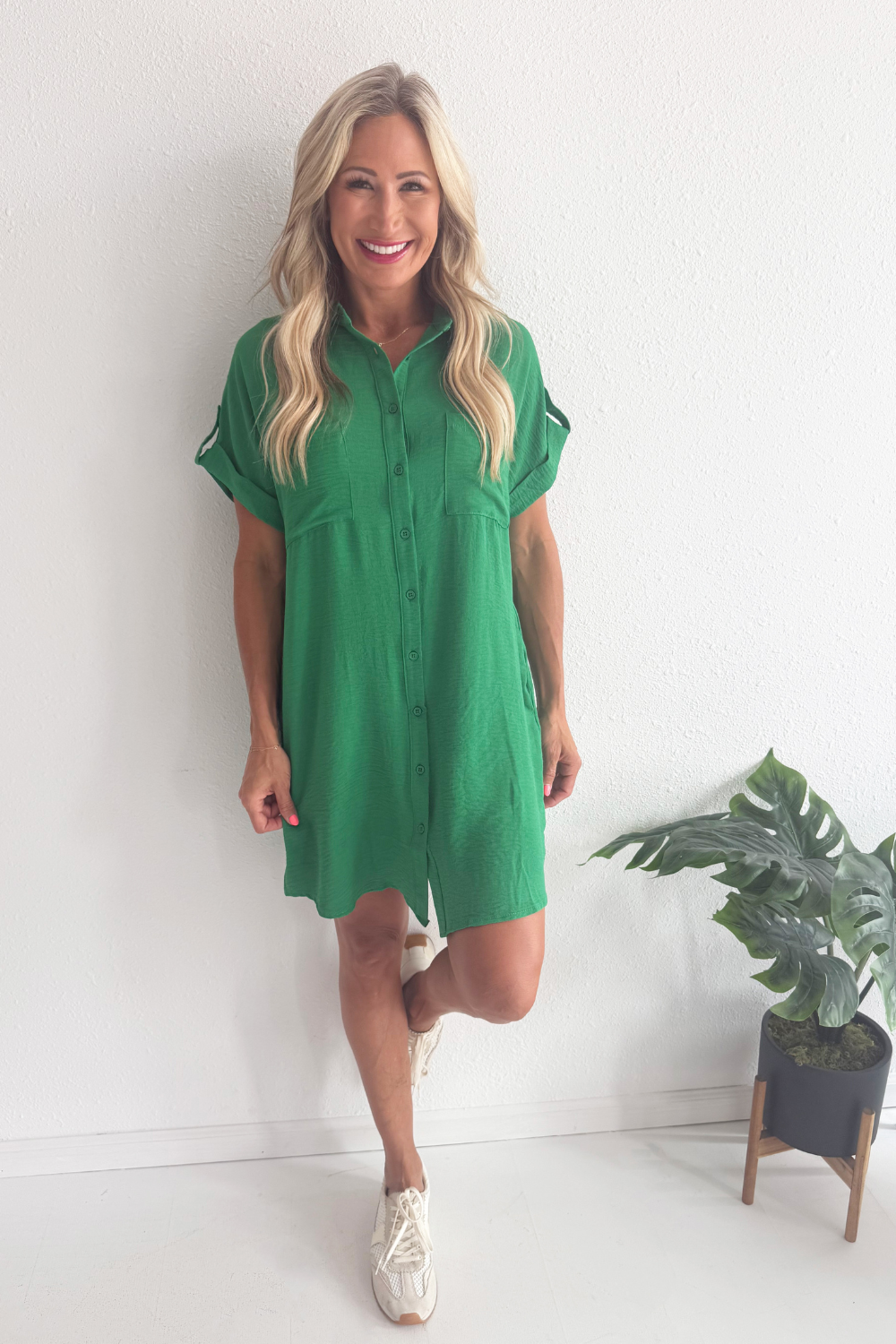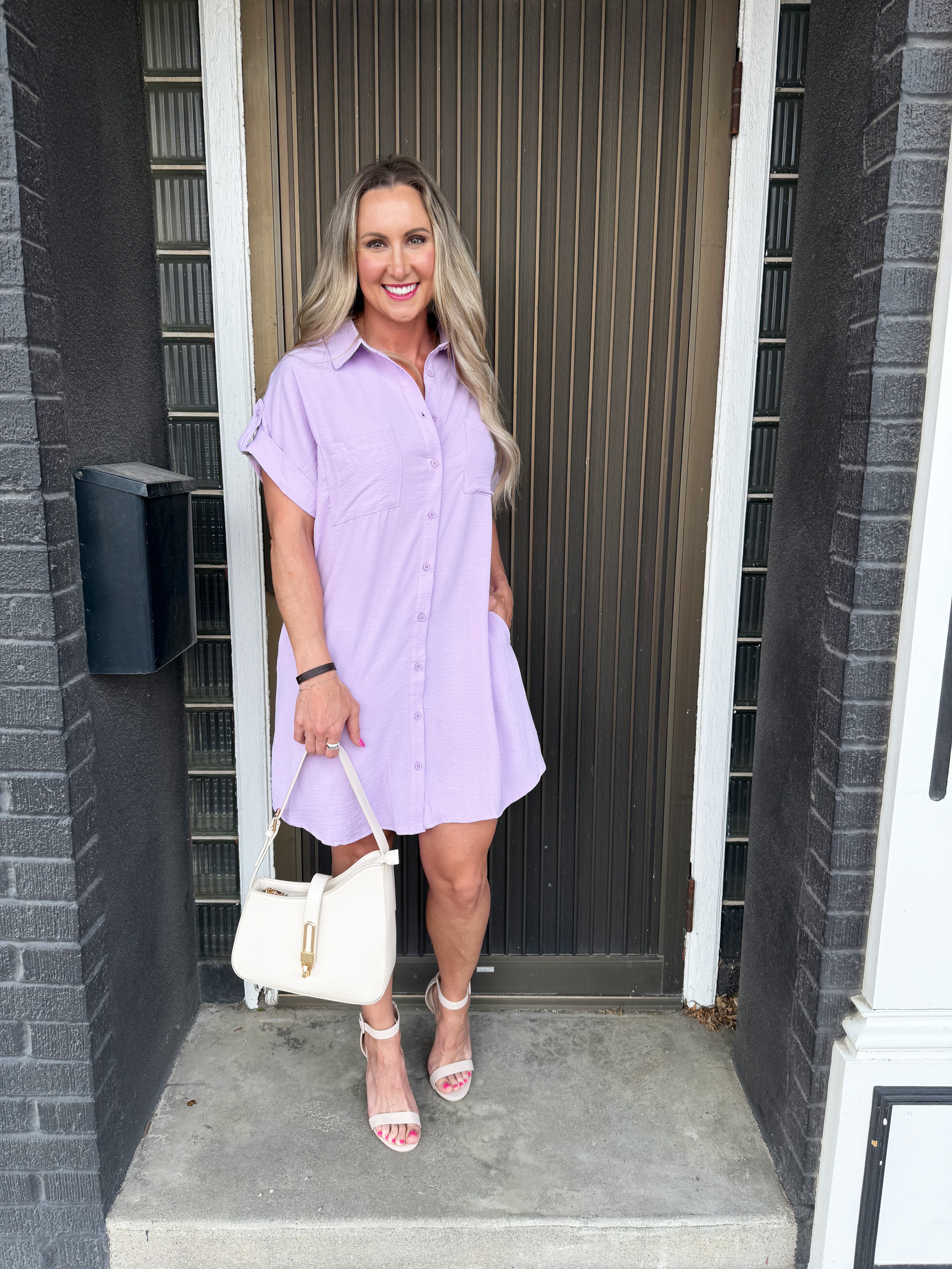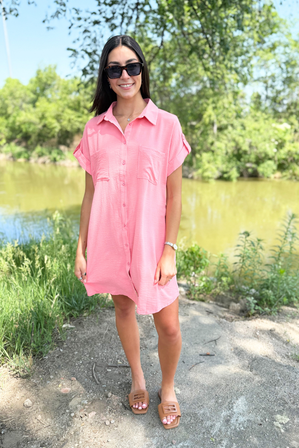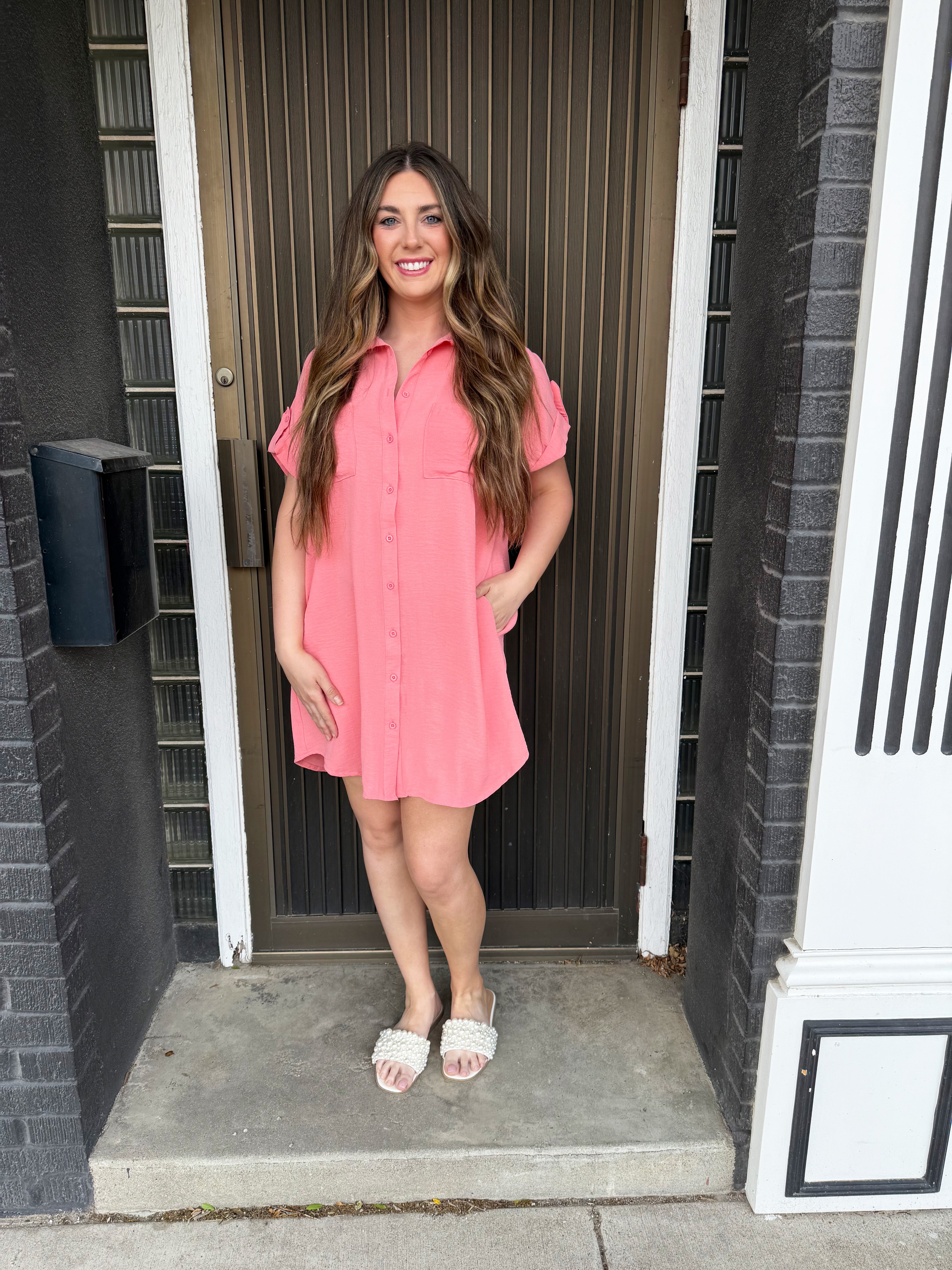 The Drop Shoulder Button Up Woven Shirt Dress is a spring must-have. This easy to wear shirt dress features a drop shoulder, chest pockets, and a button front. Wear this dress with sneakers or sandals for a fun casual look.