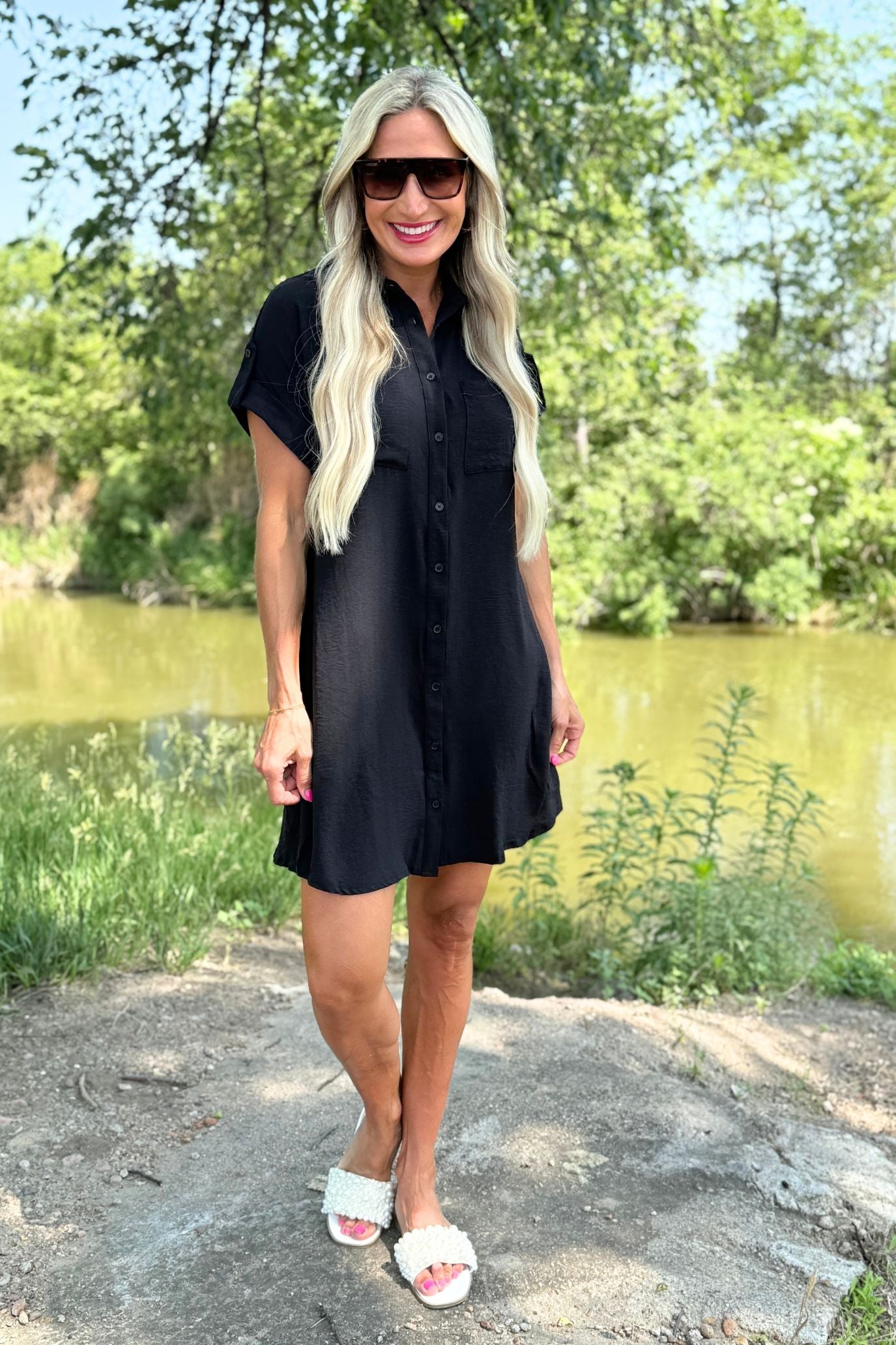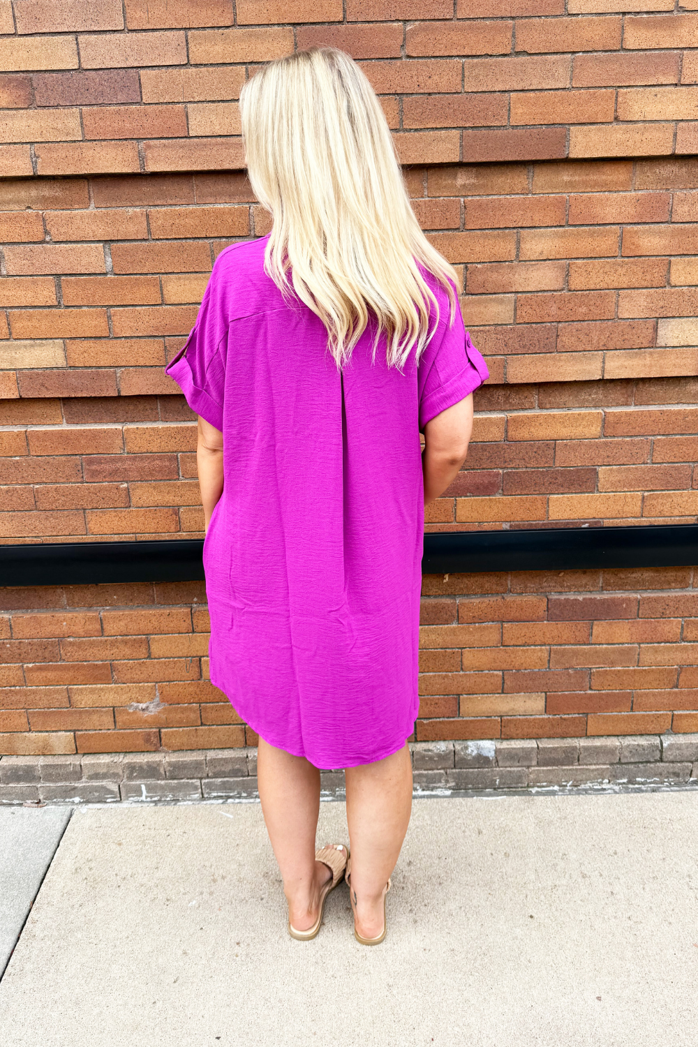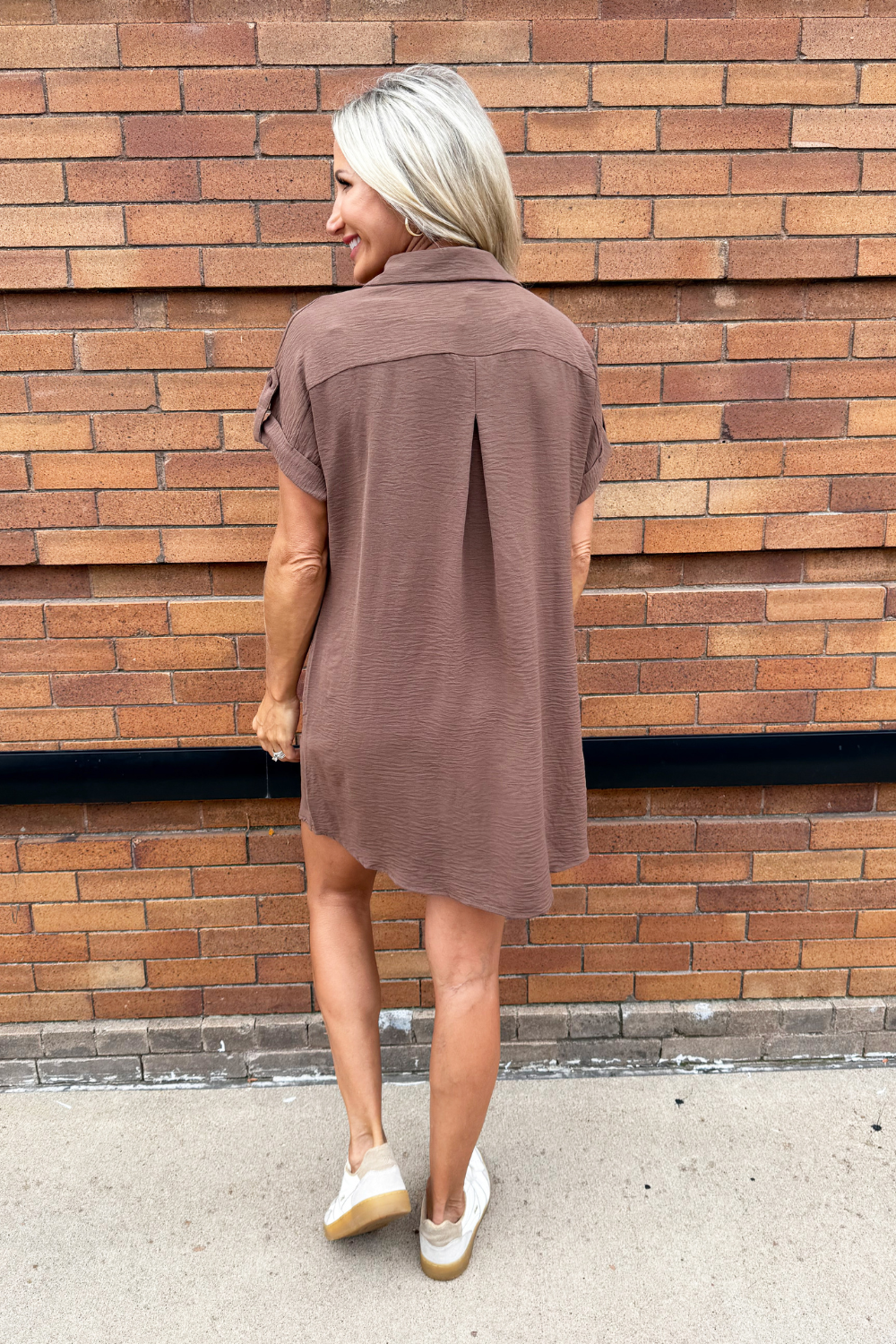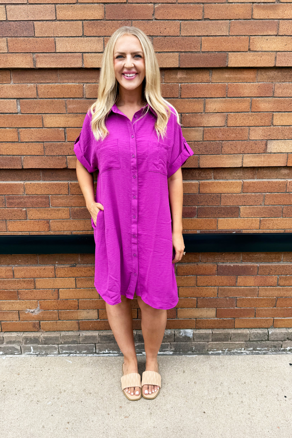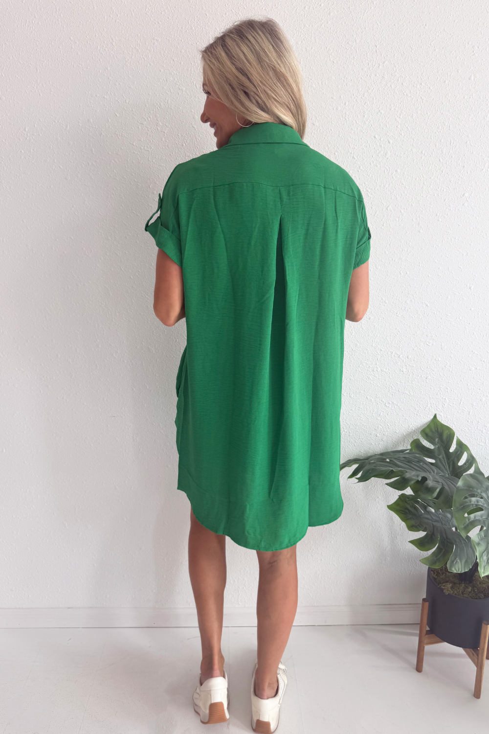 The Drop Shoulder Button Up Woven Shirt Dress is a spring must-have. This easy to wear shirt dress features a drop shoulder, chest pockets, and a button front. Wear this dress with sneakers or sandals for a fun casual look.