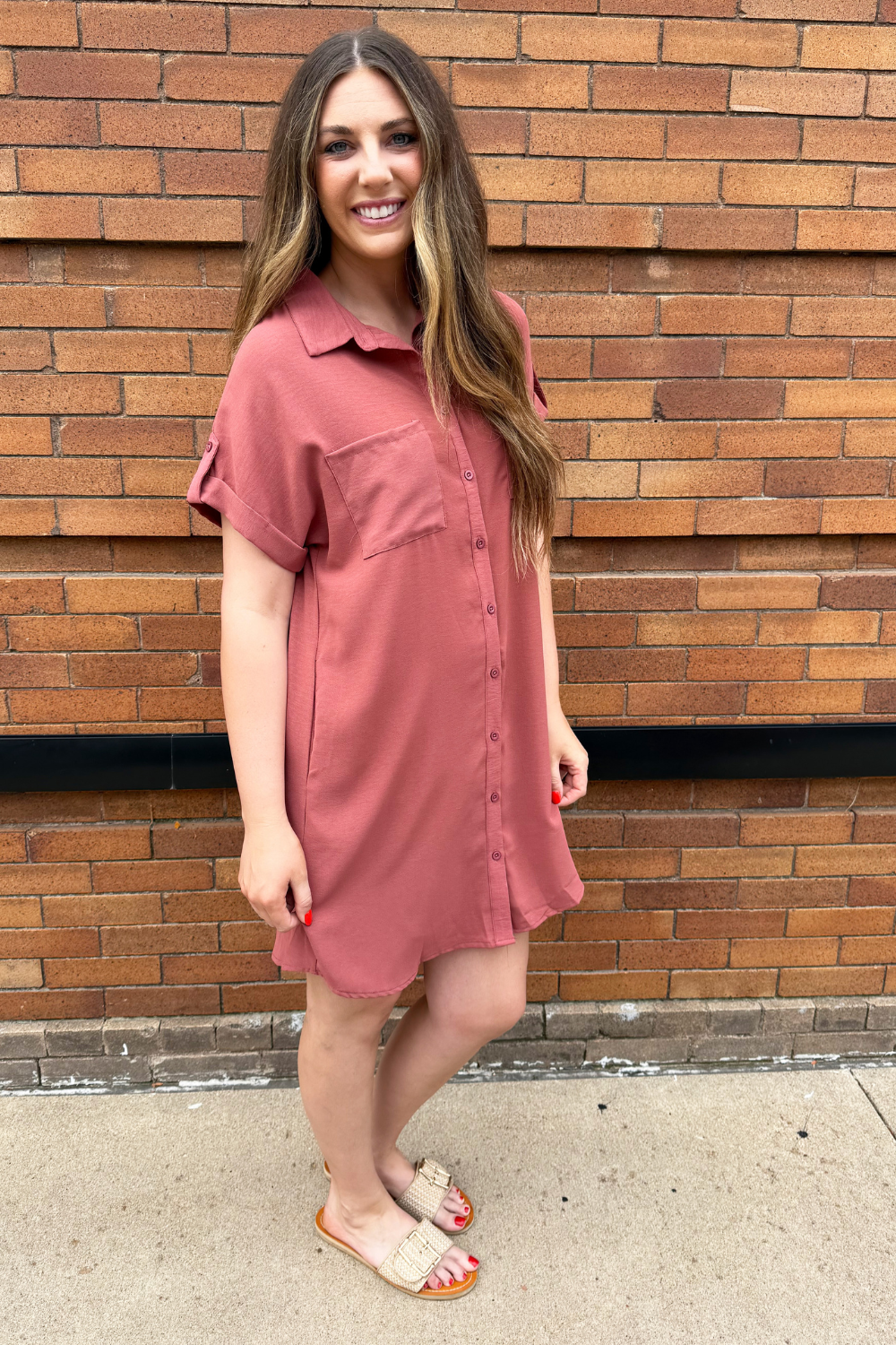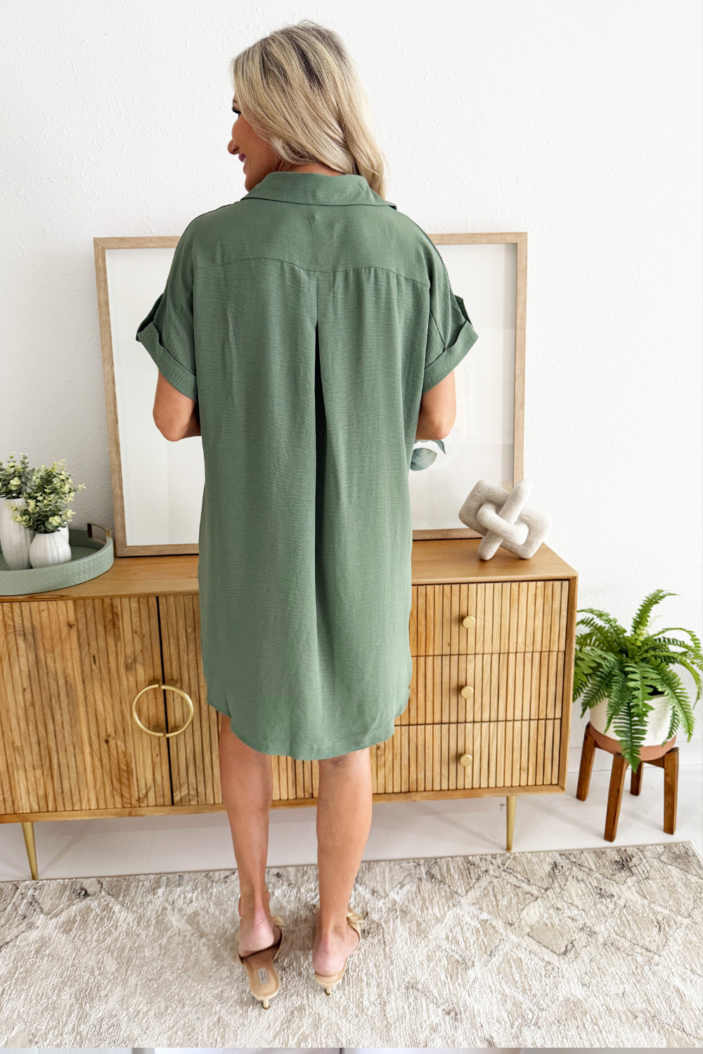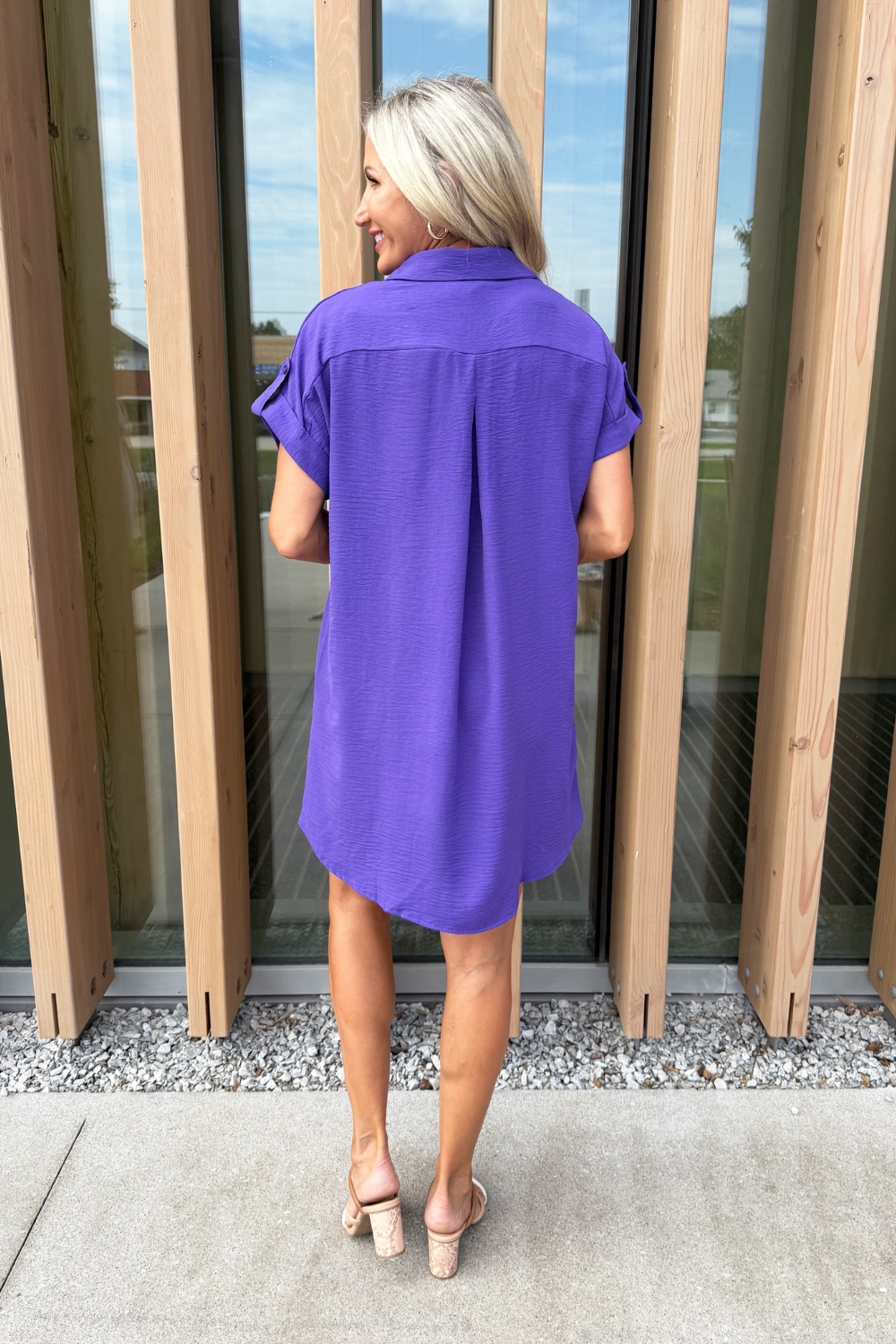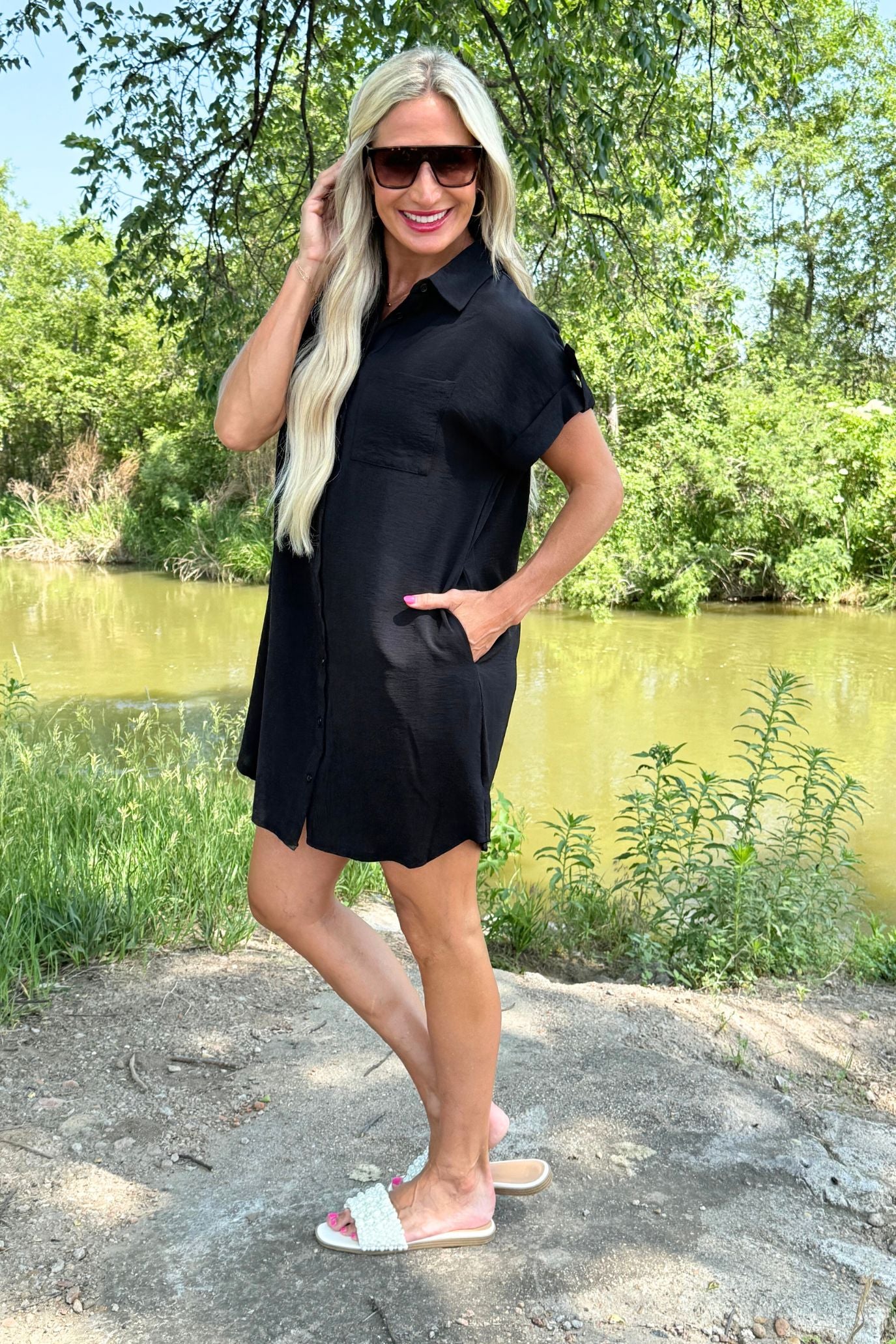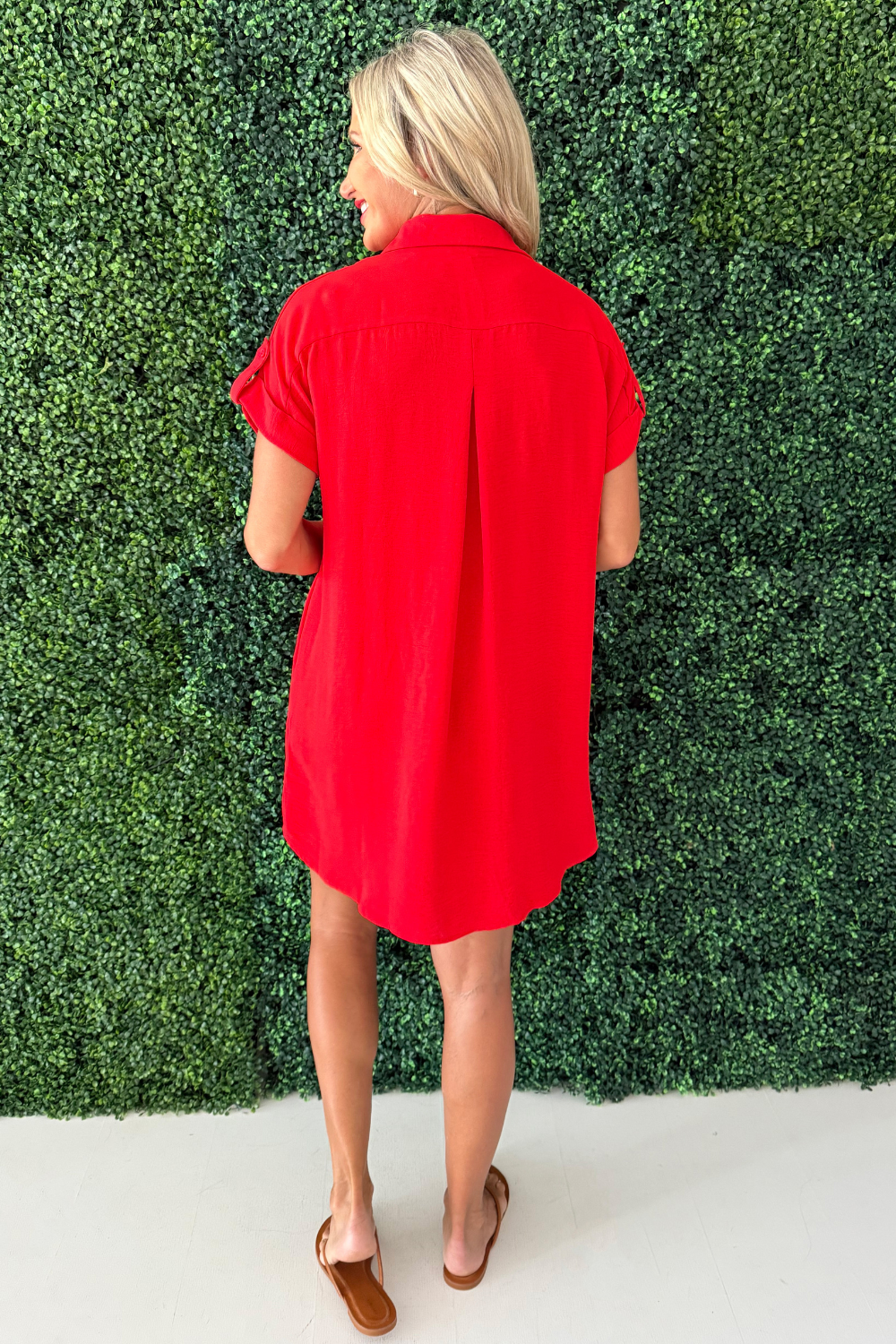 The Drop Shoulder Button Up Woven Shirt Dress is a spring must-have. This easy to wear shirt dress features a drop shoulder, chest pockets, and a button front. Wear this dress with sneakers or sandals for a fun casual look.