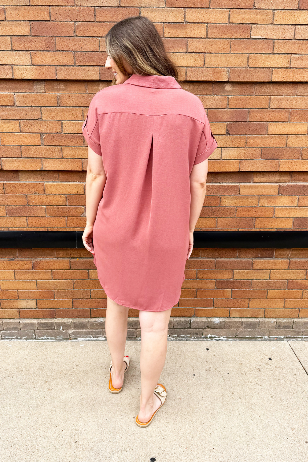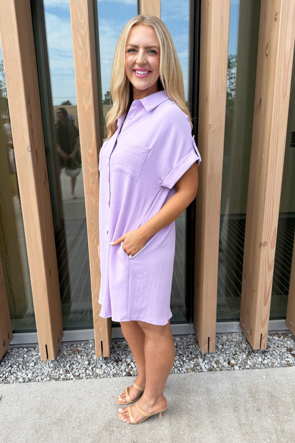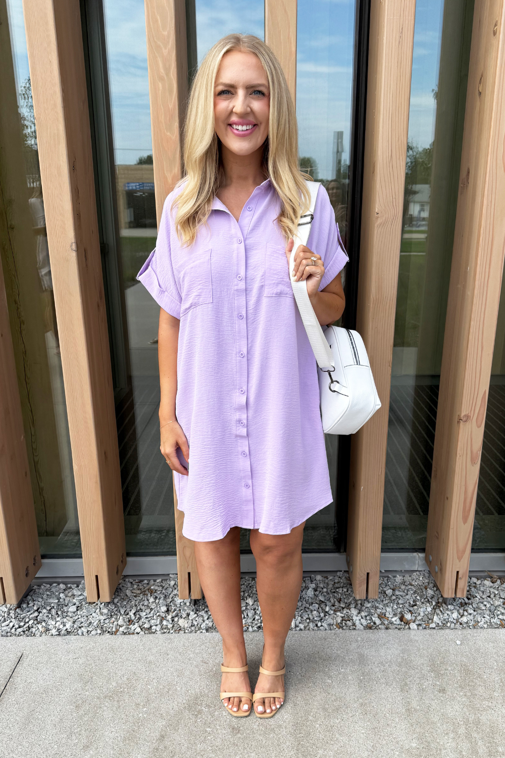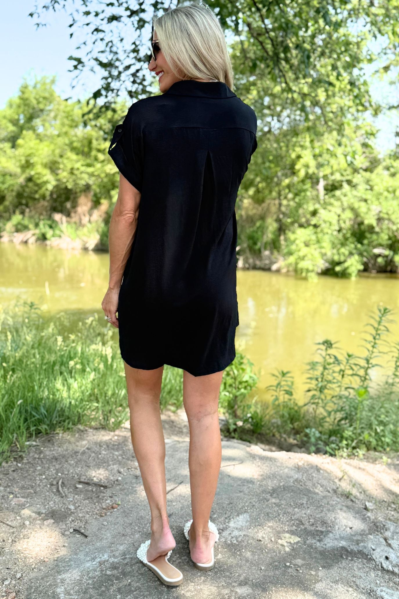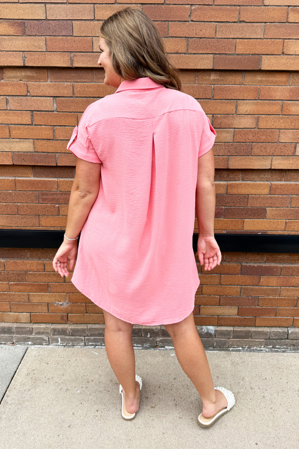 The Drop Shoulder Button Up Woven Shirt Dress is a spring must-have. This easy to wear shirt dress features a drop shoulder, chest pockets, and a button front. Wear this dress with sneakers or sandals for a fun casual look.