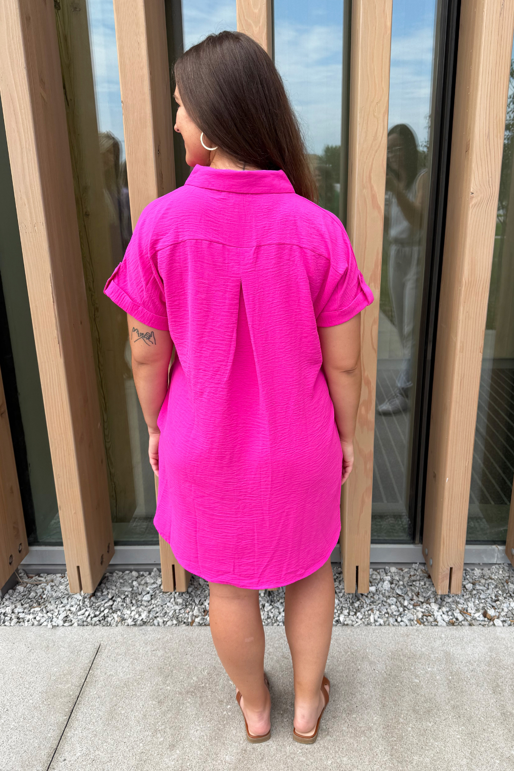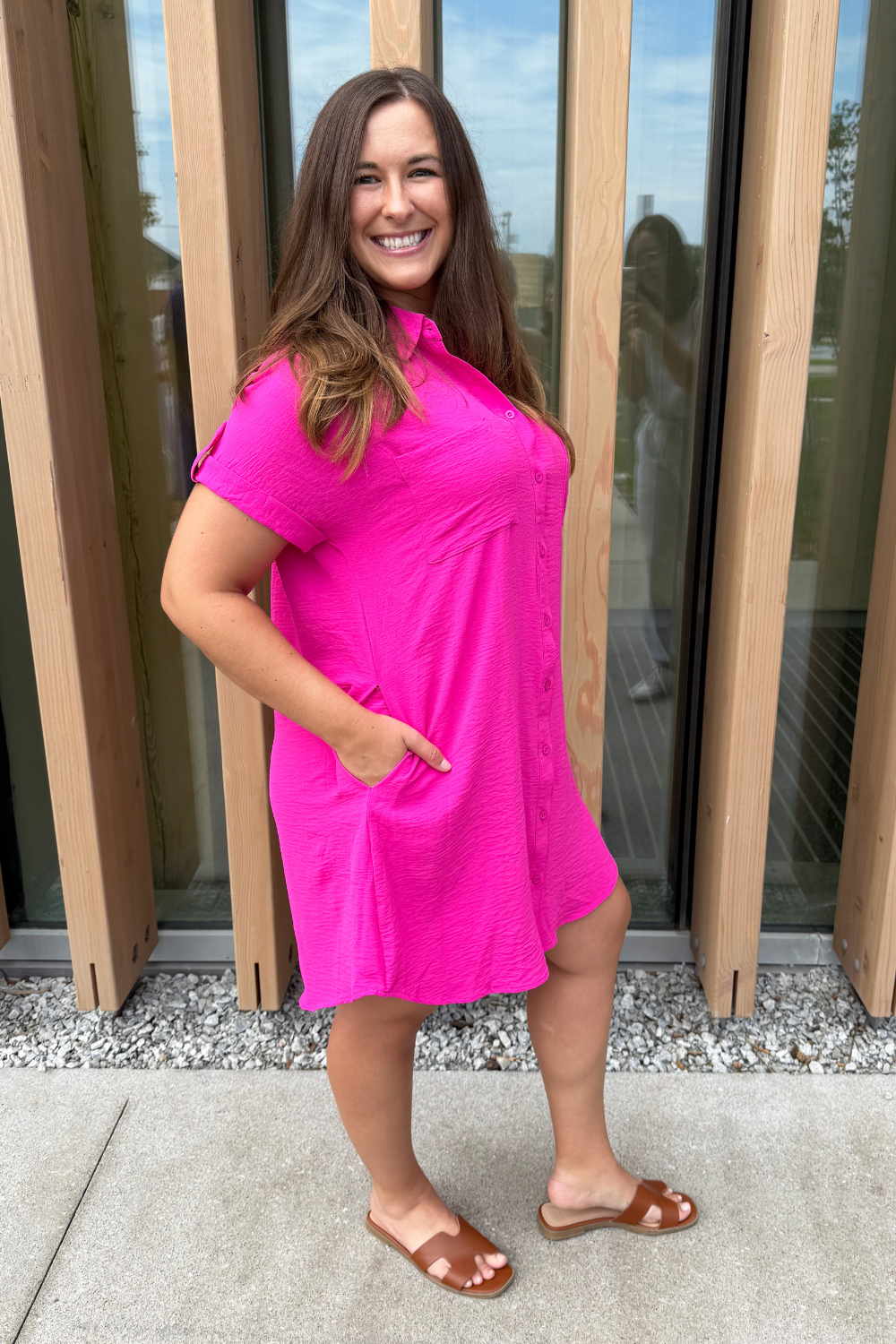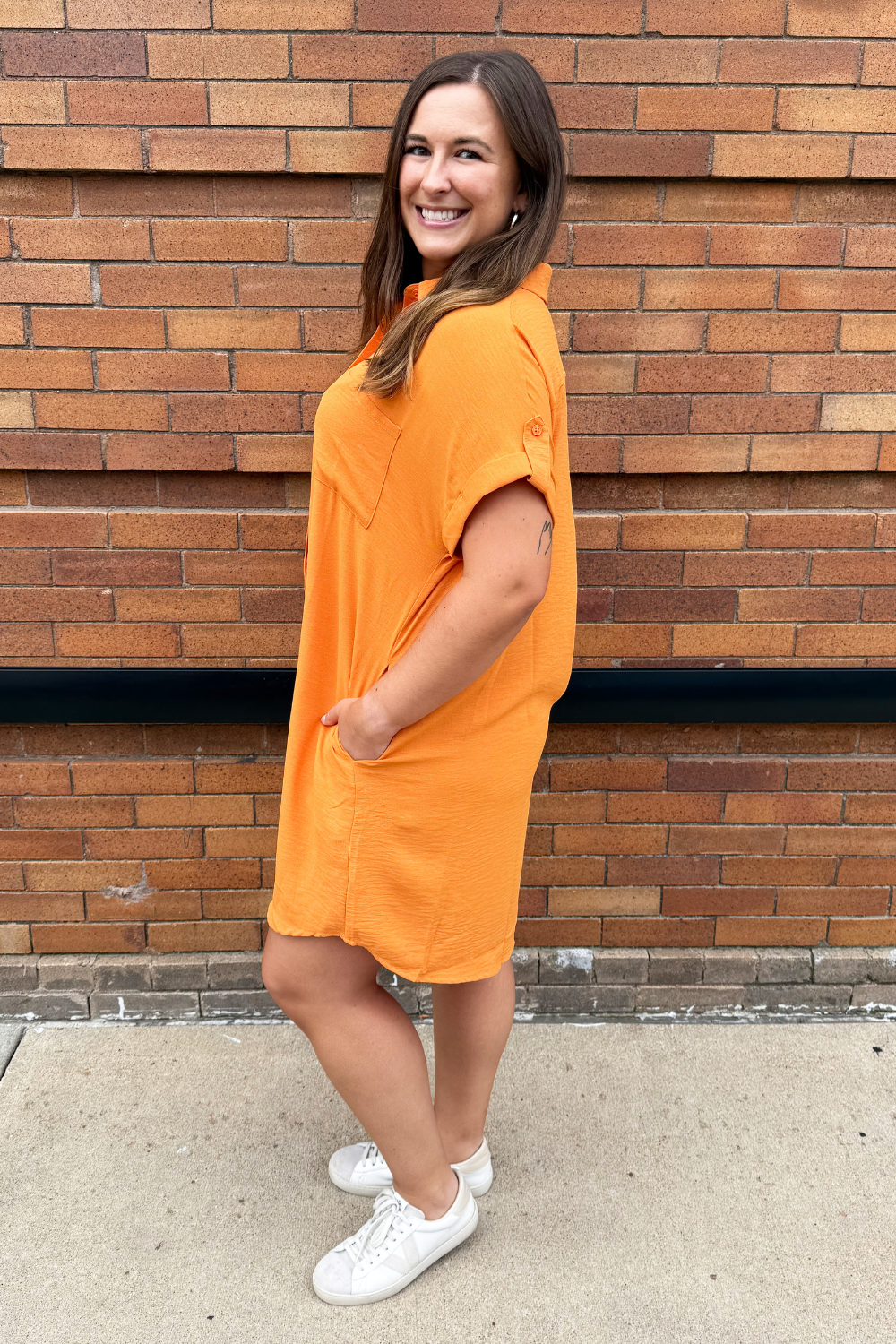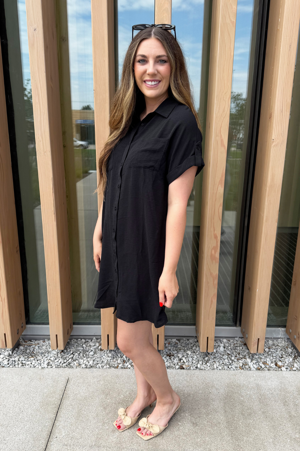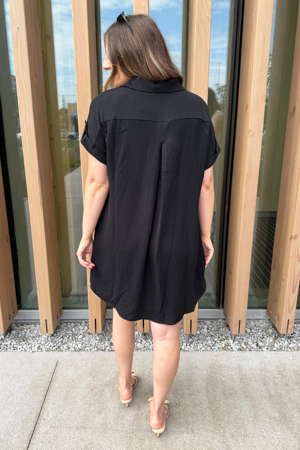 The Drop Shoulder Button Up Woven Shirt Dress is a spring must-have. This easy to wear shirt dress features a drop shoulder, chest pockets, and a button front. Wear this dress with sneakers or sandals for a fun casual look.
