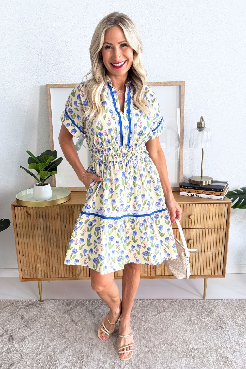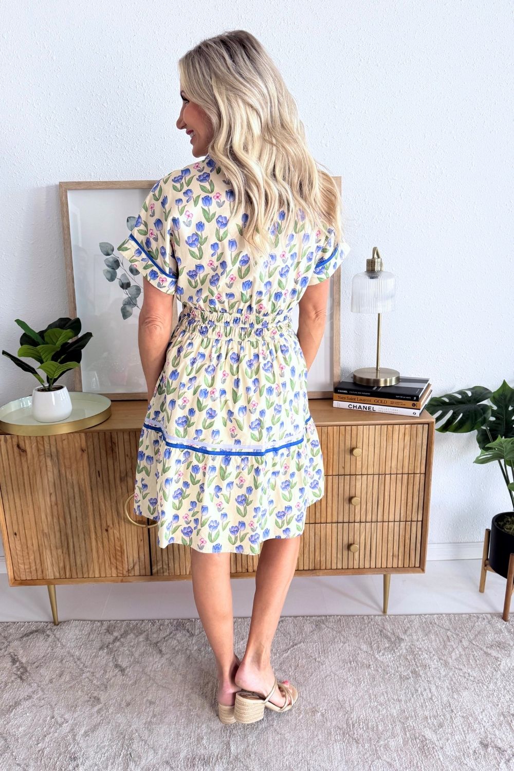 The Drop Shoulder Cuff Sleeve Collared Floral Print Woven Mini Dress is a warm weather favorite. This dress features a collared neckline, cuff sleeves, and a flattering elastic waistband. The lightweight woven fabric and floral print make it perfect for everyday wear.