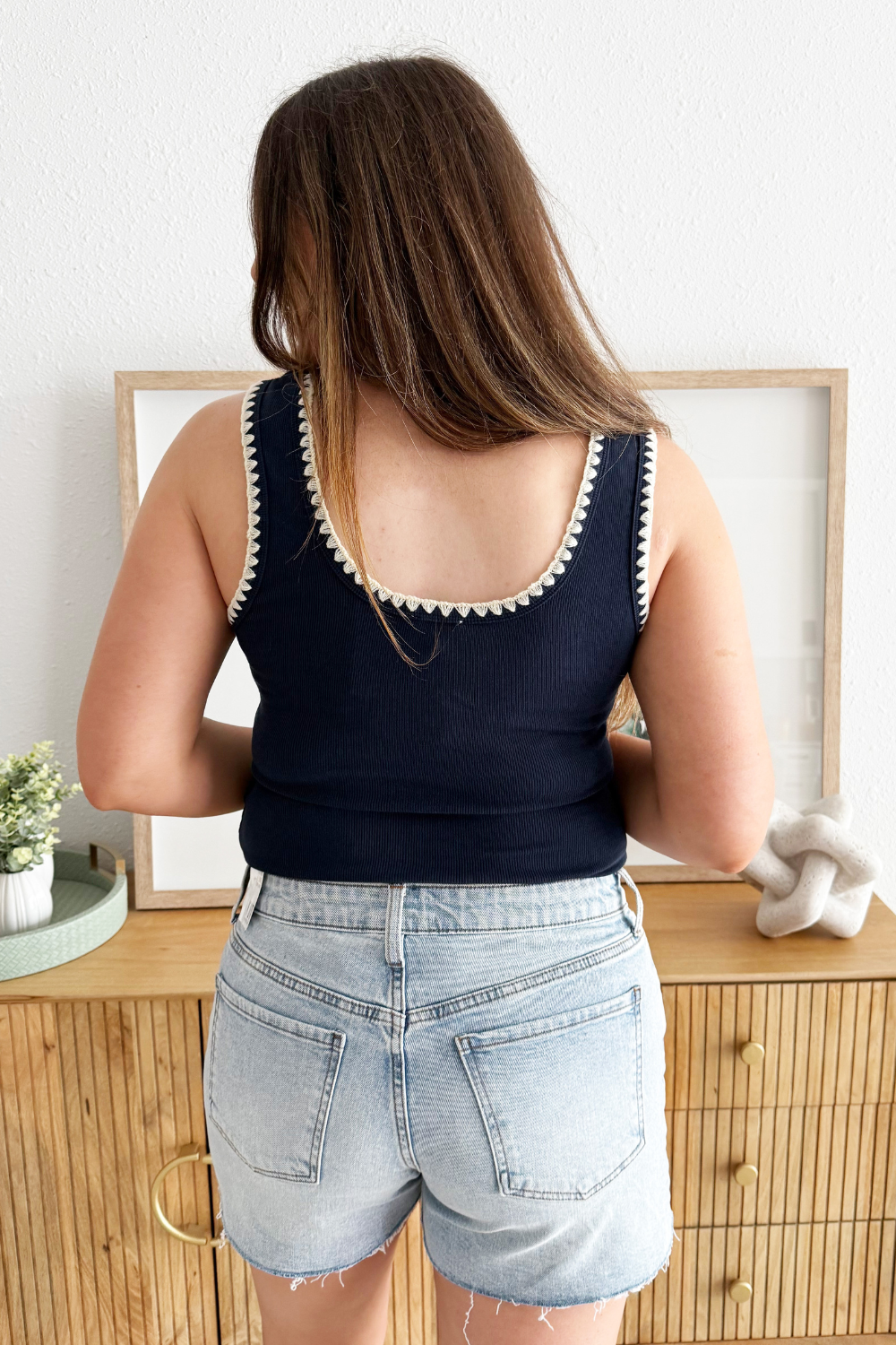 Simple with a little edge! The Edge Embroidery Sleeveless Bodysuit is a basic ribbed knit bodysuit with embroidery along the neckline. Style with your favorite shorts and sneakers for an easy summer look.