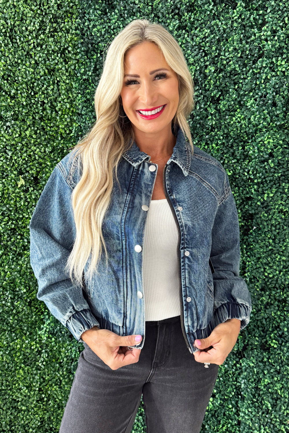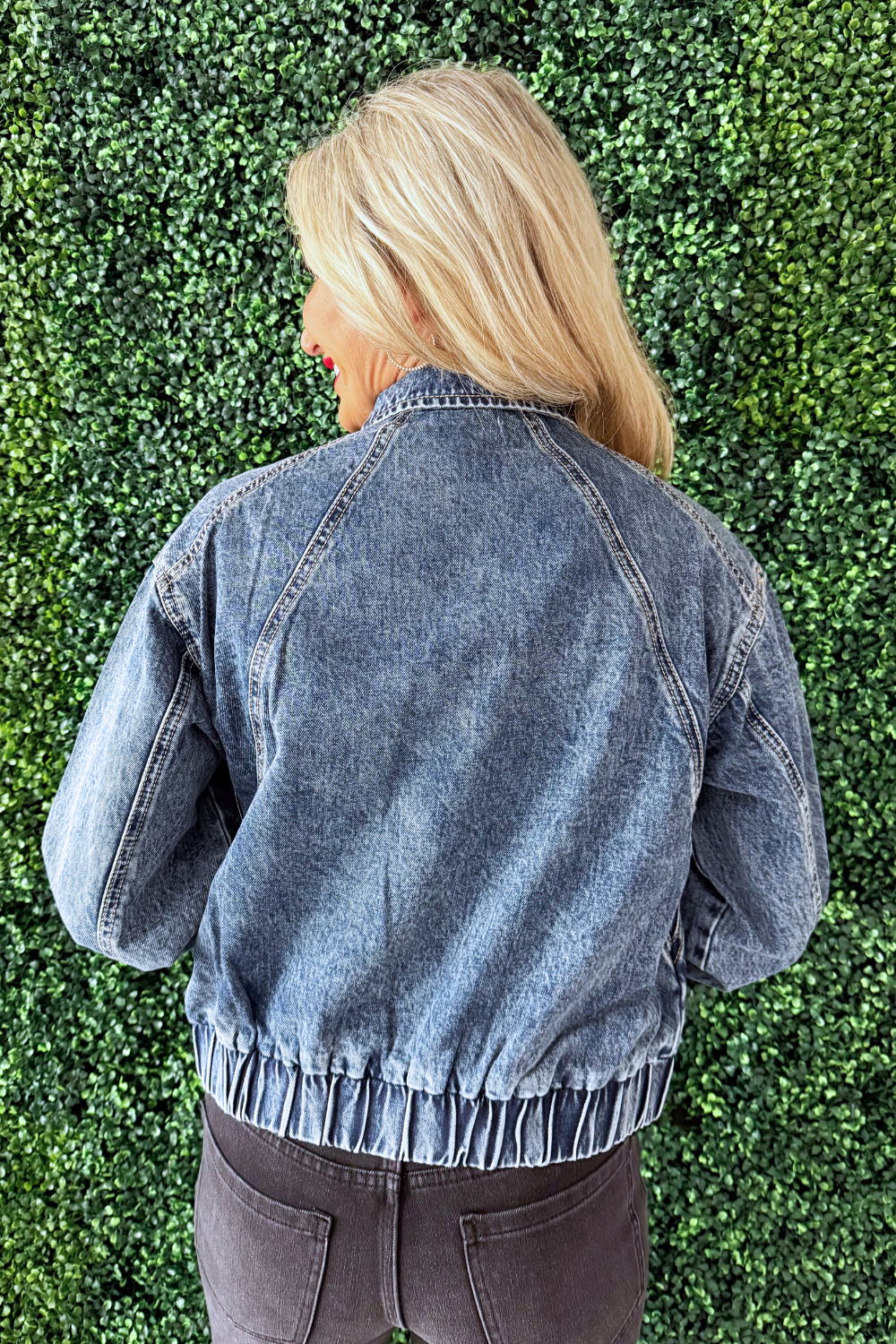 This classic denim jacket features a modern twist with elastic cuffs and a snug waistband for a comfortable, tailored fit. Made from durable, medium-wash denim, it combines timeless style with casual ease. The elastic detailing adds a sporty edge while keeping the silhouette structured and flattering. Perfect for layering, it's your go-to piece for effortless everyday style!