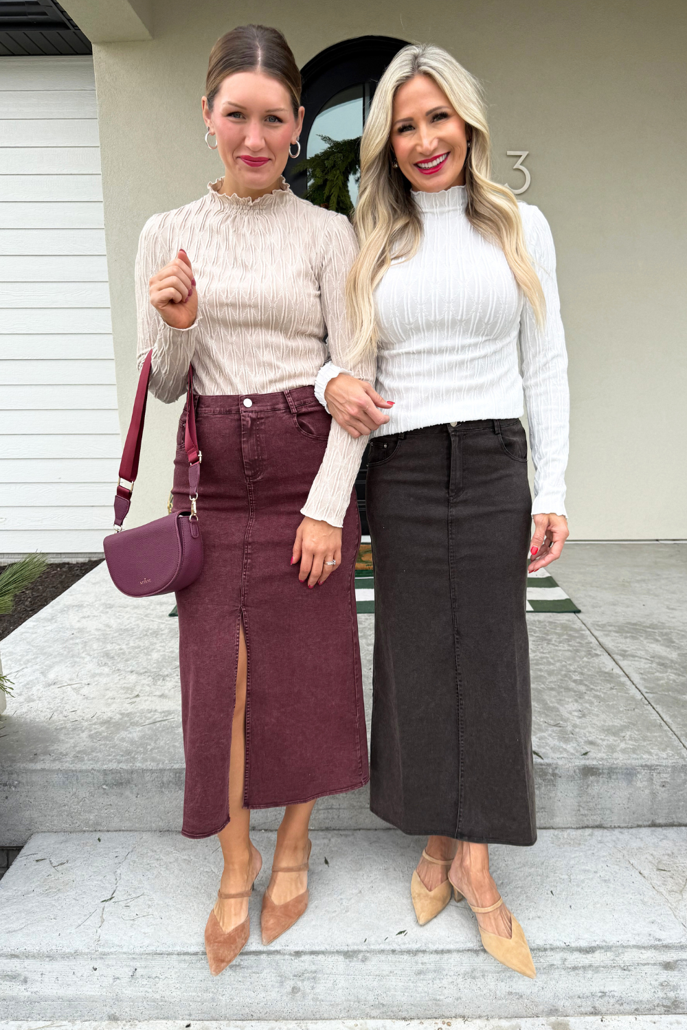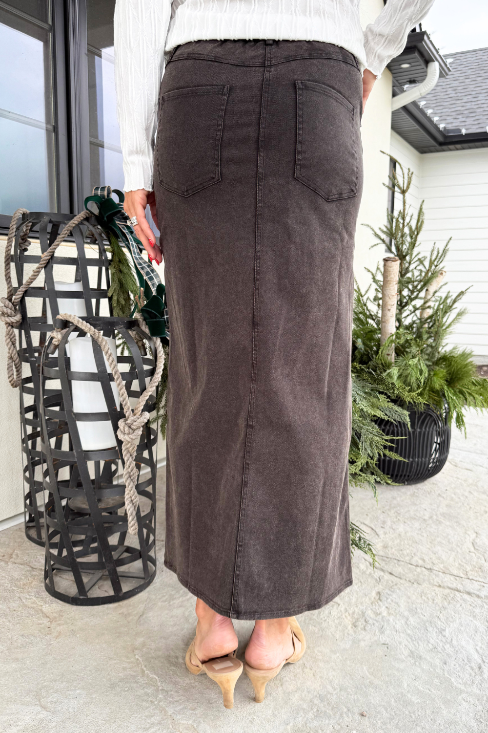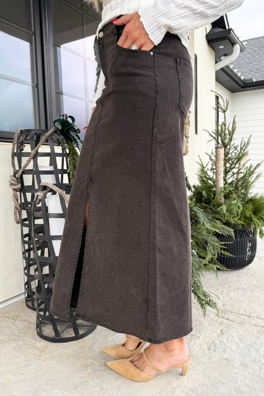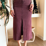 This twill maxi skirt combines effortless style with everyday comfort. Designed with a soft elastic waistband and a sleek front slit, it offers easy movement and a flattering silhouette. Dress it up with a blouse or keep it casual with a tucked in tee!